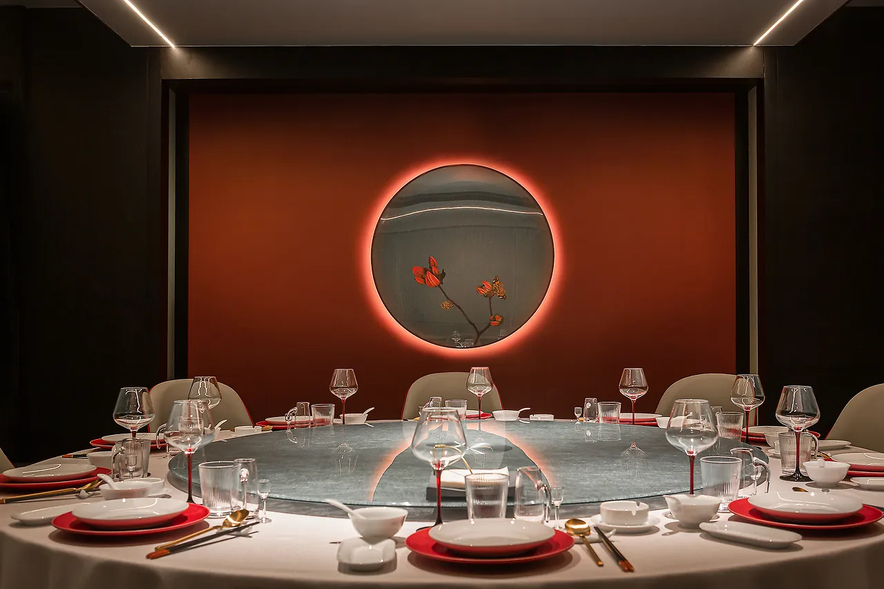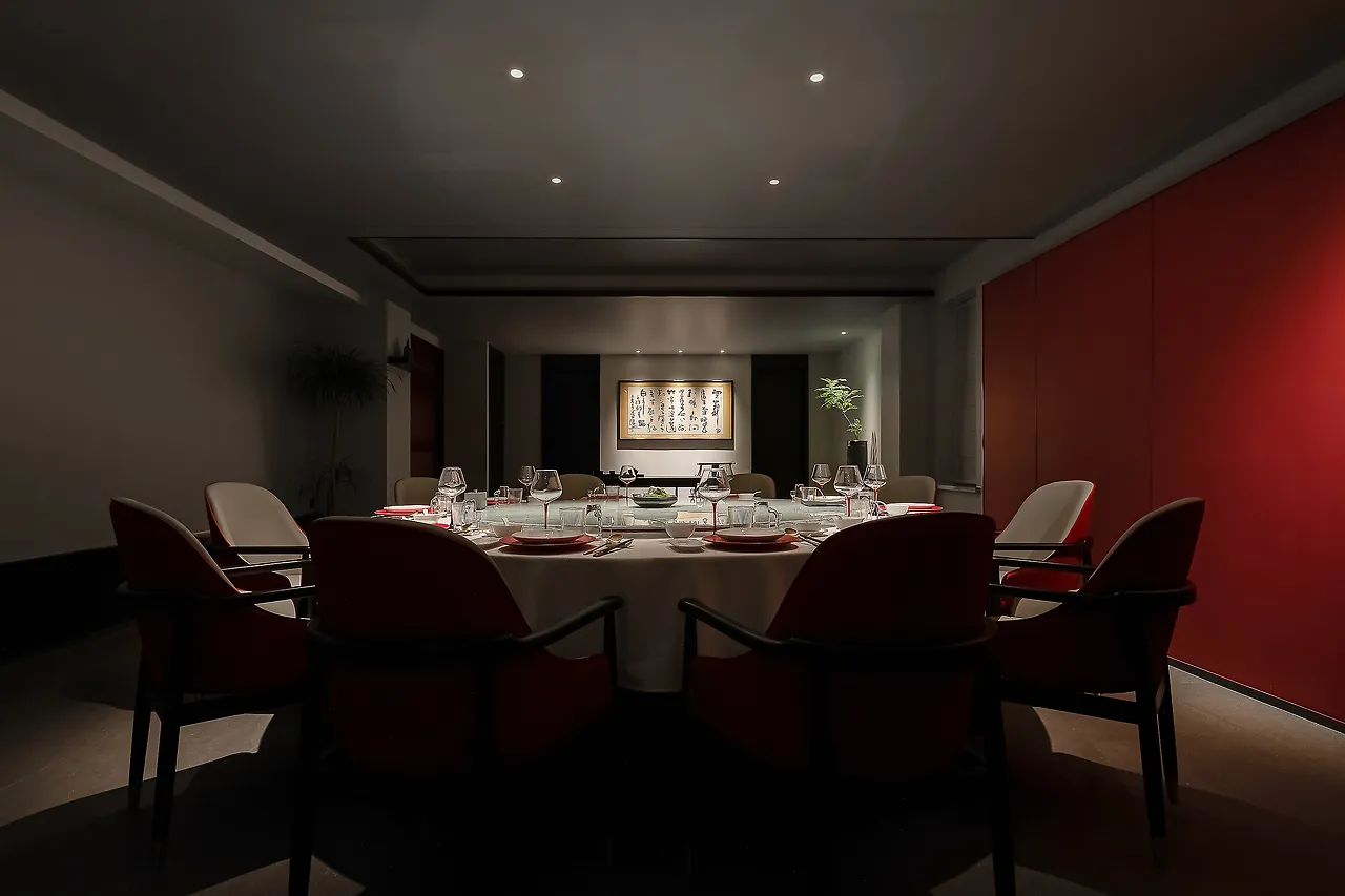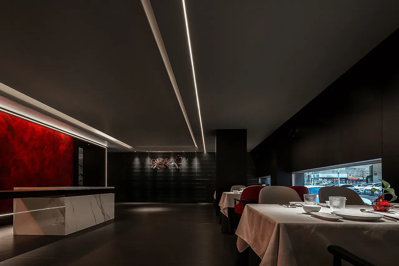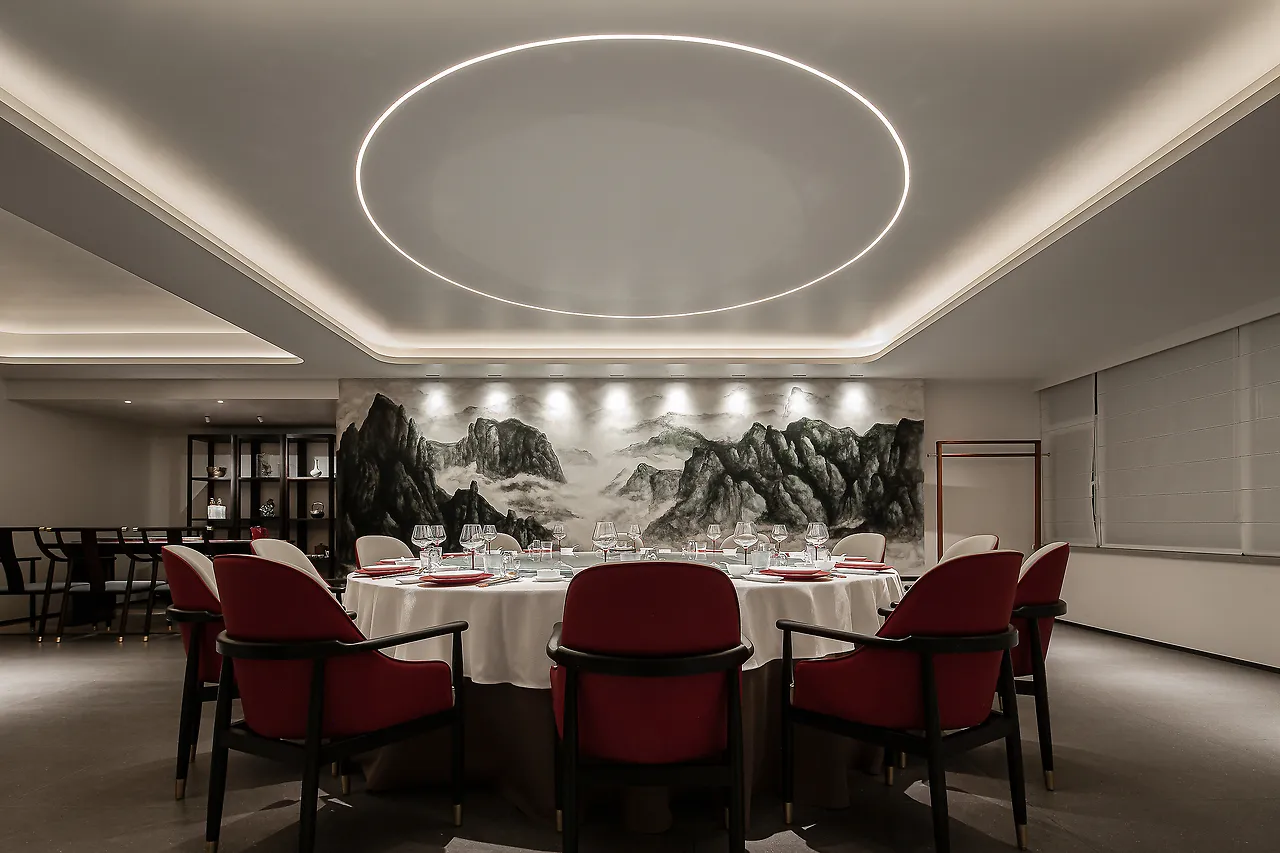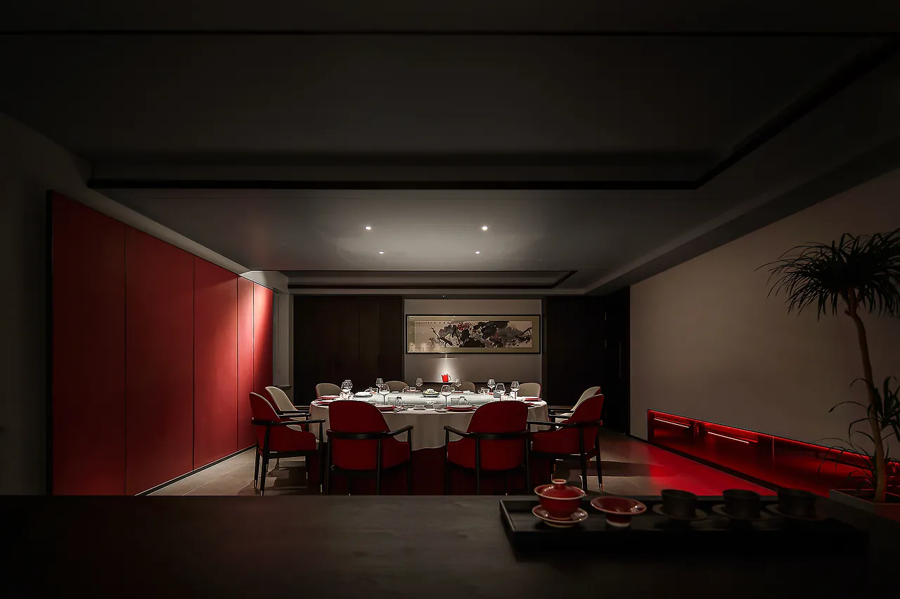 The lighting design is understated and subtle, with an overall dark color scheme and on-demand illumination, all aimed at allowing diners to experience the elegance of the space, the essence of the food, the emotional connection, and the core of Eastern spirit.