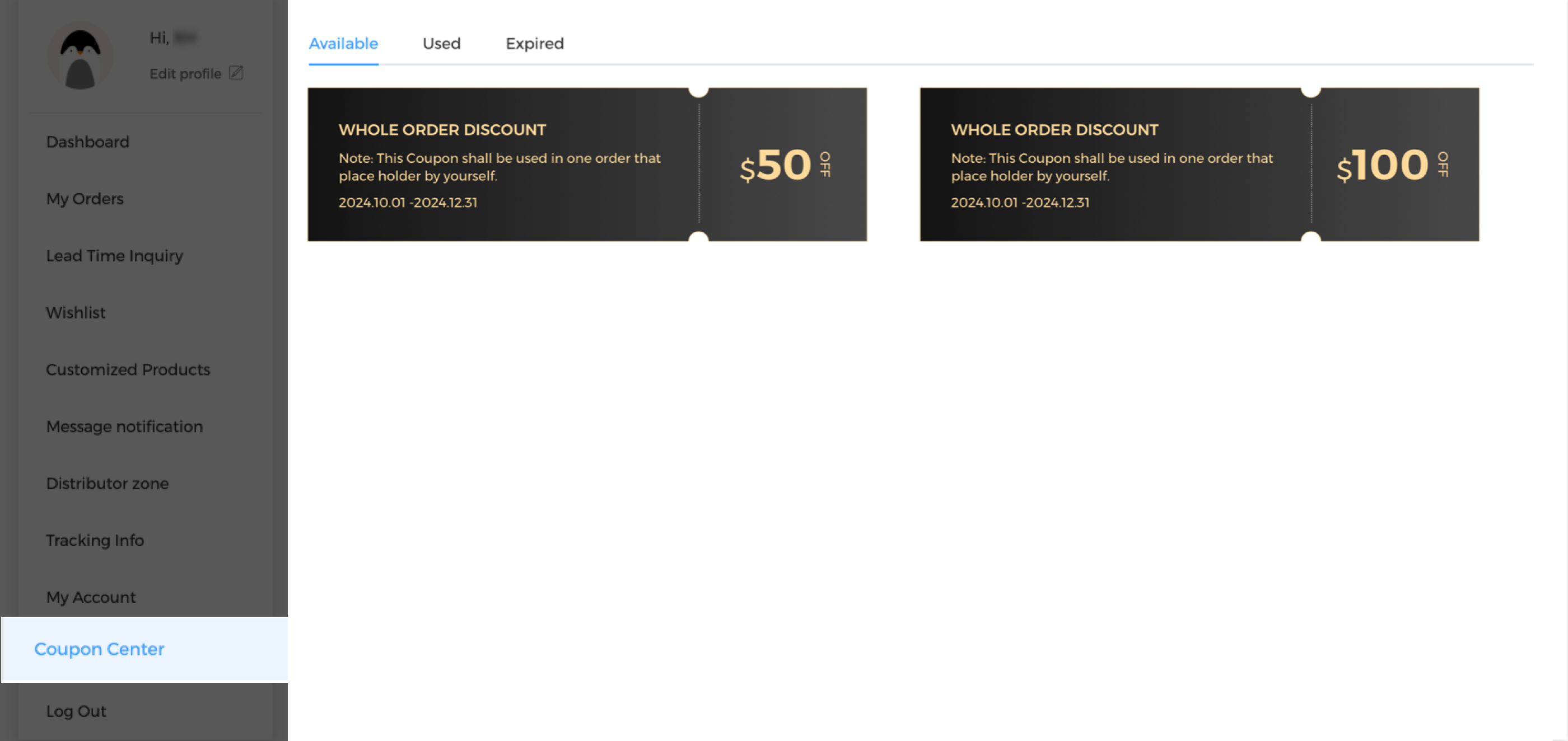 Check coupon in your account - Coupon Center.