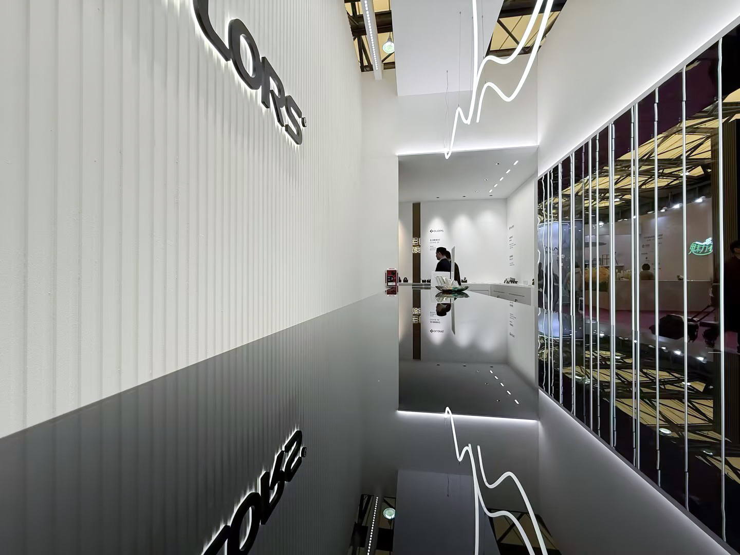 The booth was built around a neutral grey palette, creating a calm and rational brand atmosphere. By minimizing visual distractions, the design allowed light itself to take center stage.
