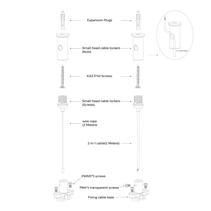 Other: 1PCS 2m wire rope, 1PCS 2m 2-in-1 cable, 2PCS small-head cable lockers, 2PCS silver fixing cable base, 4PCS crimping screws
