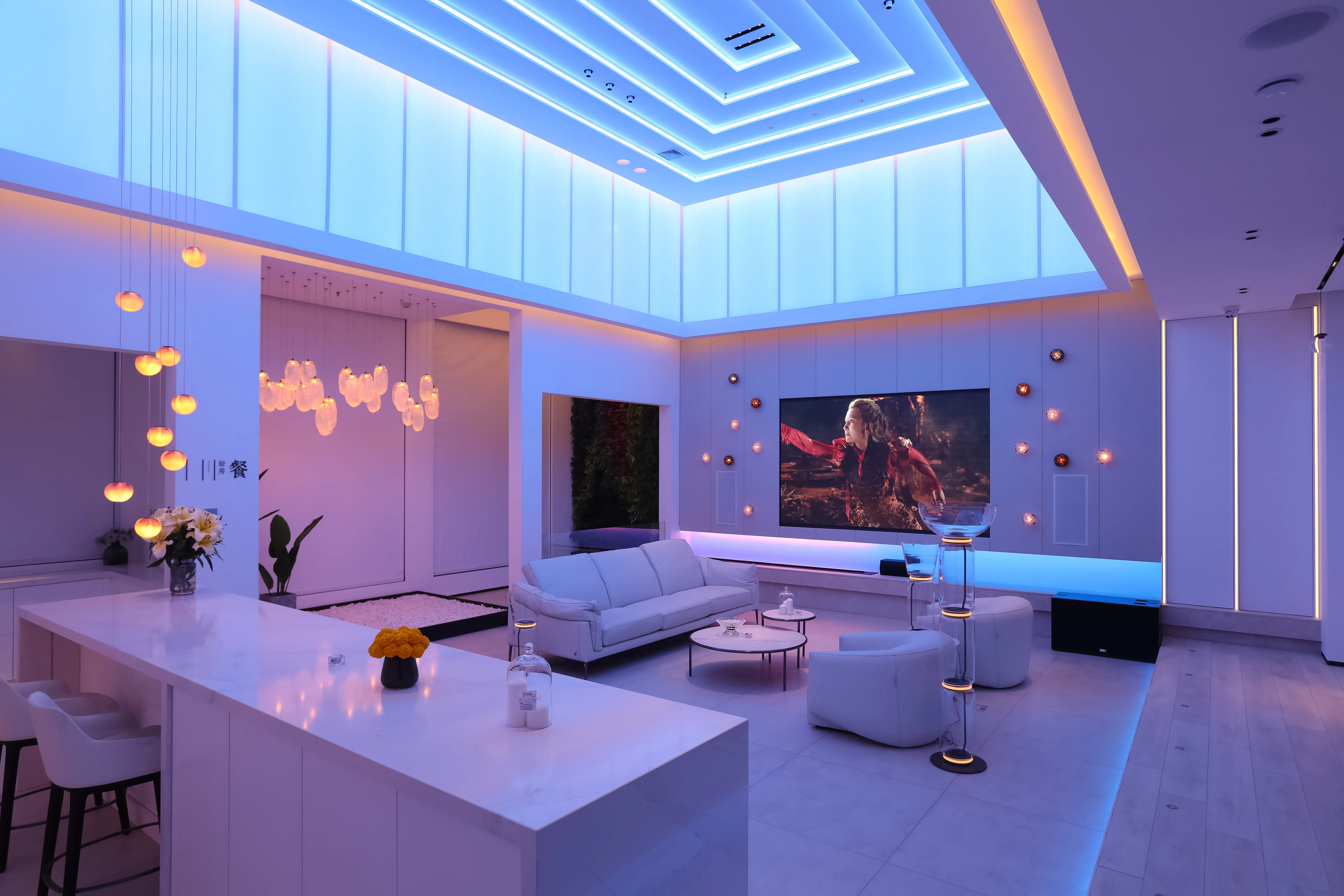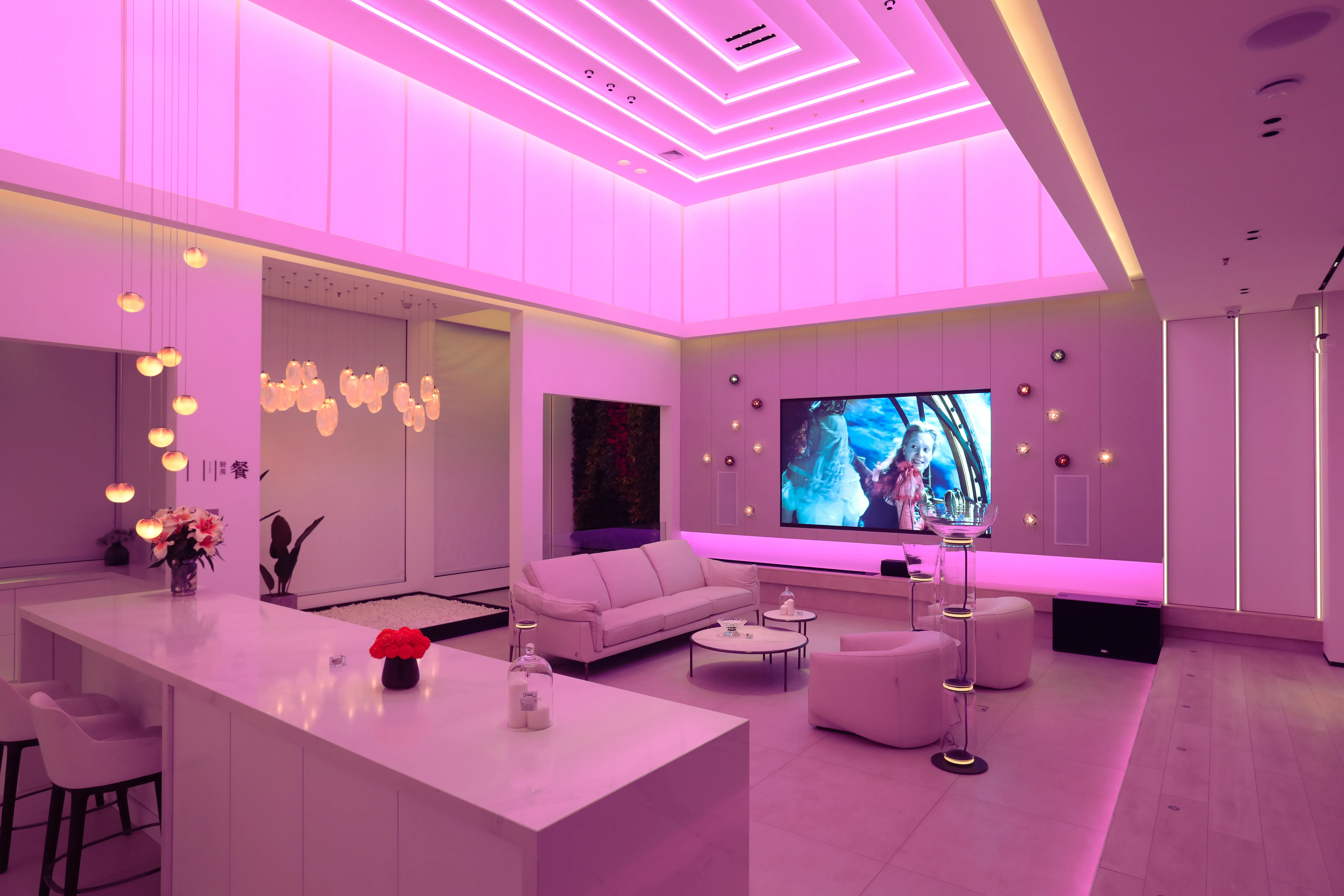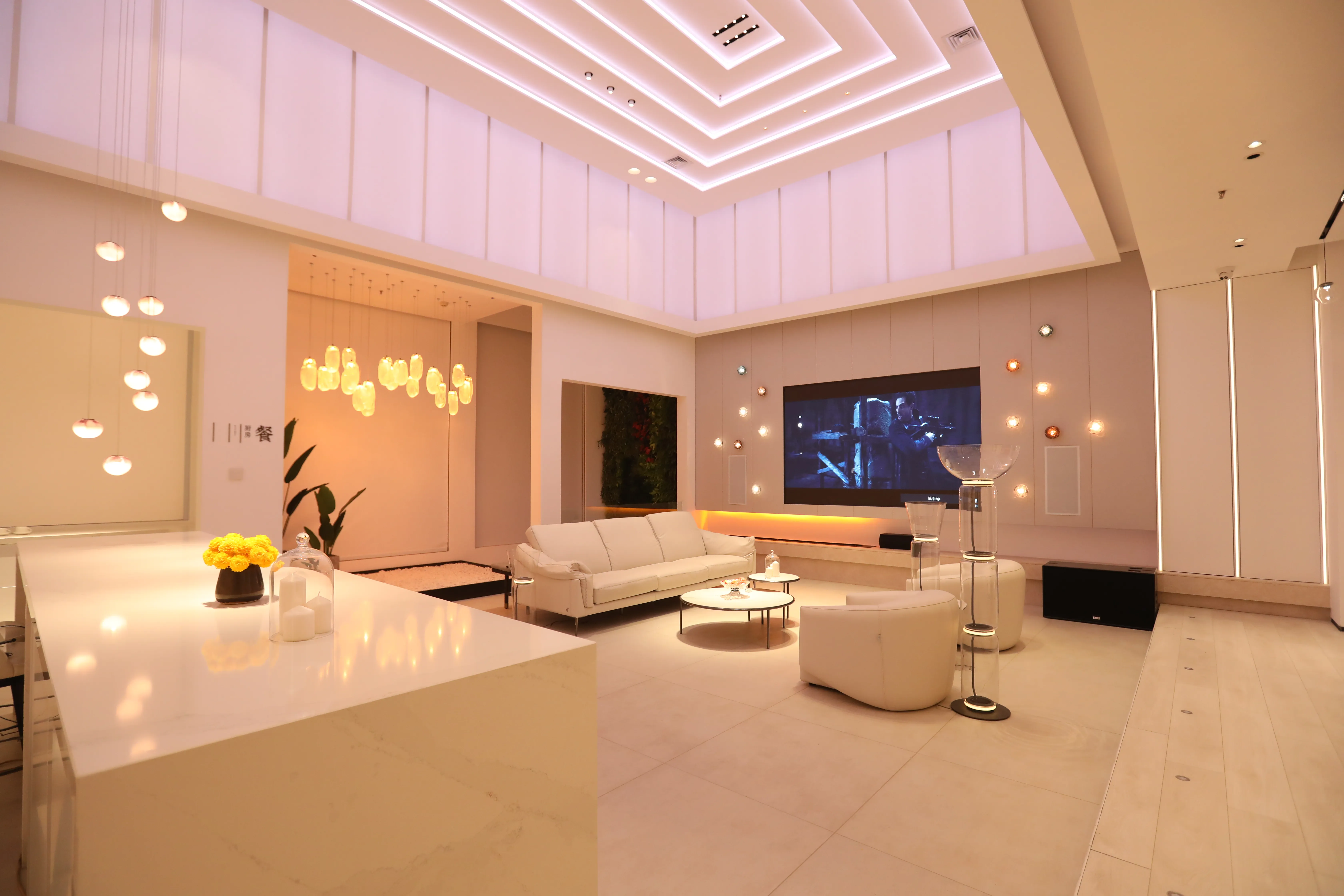 The luxurious ANSI Intelligent Audio-Visual Cinema Experience Hall is located on the fourth floor of the Huáli Lighting Square in Area A of Huafeng Lighting World, Zhengzhou City. Positioned as a high-end, intelligent audio-visual experience project integrating sound, light, electricity, and film, the lighting design incorporates mainstream approaches with artistic lanterns and accent lighting fixtures to create a warm, sophisticated, functional, and modern overall home lighting environment.