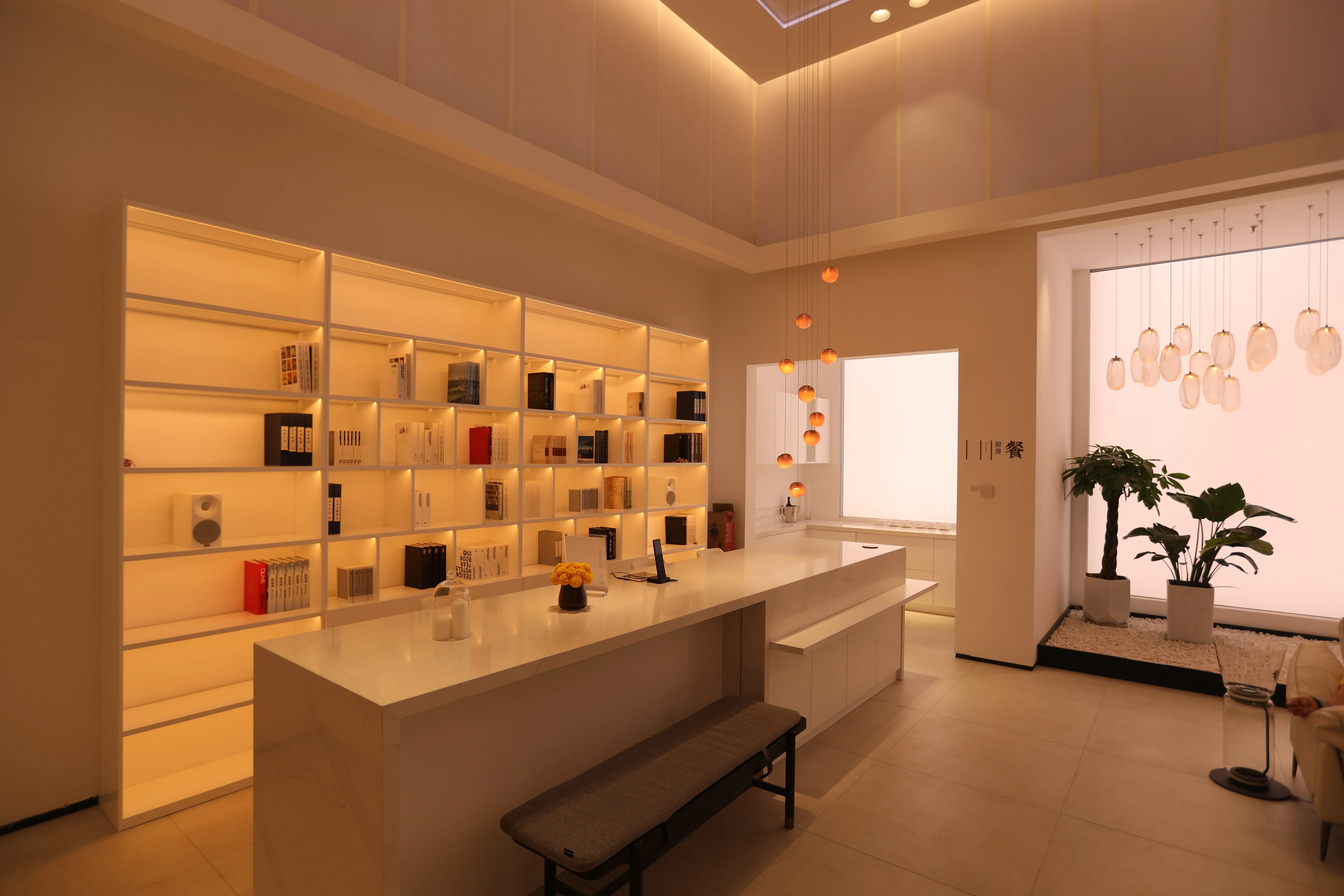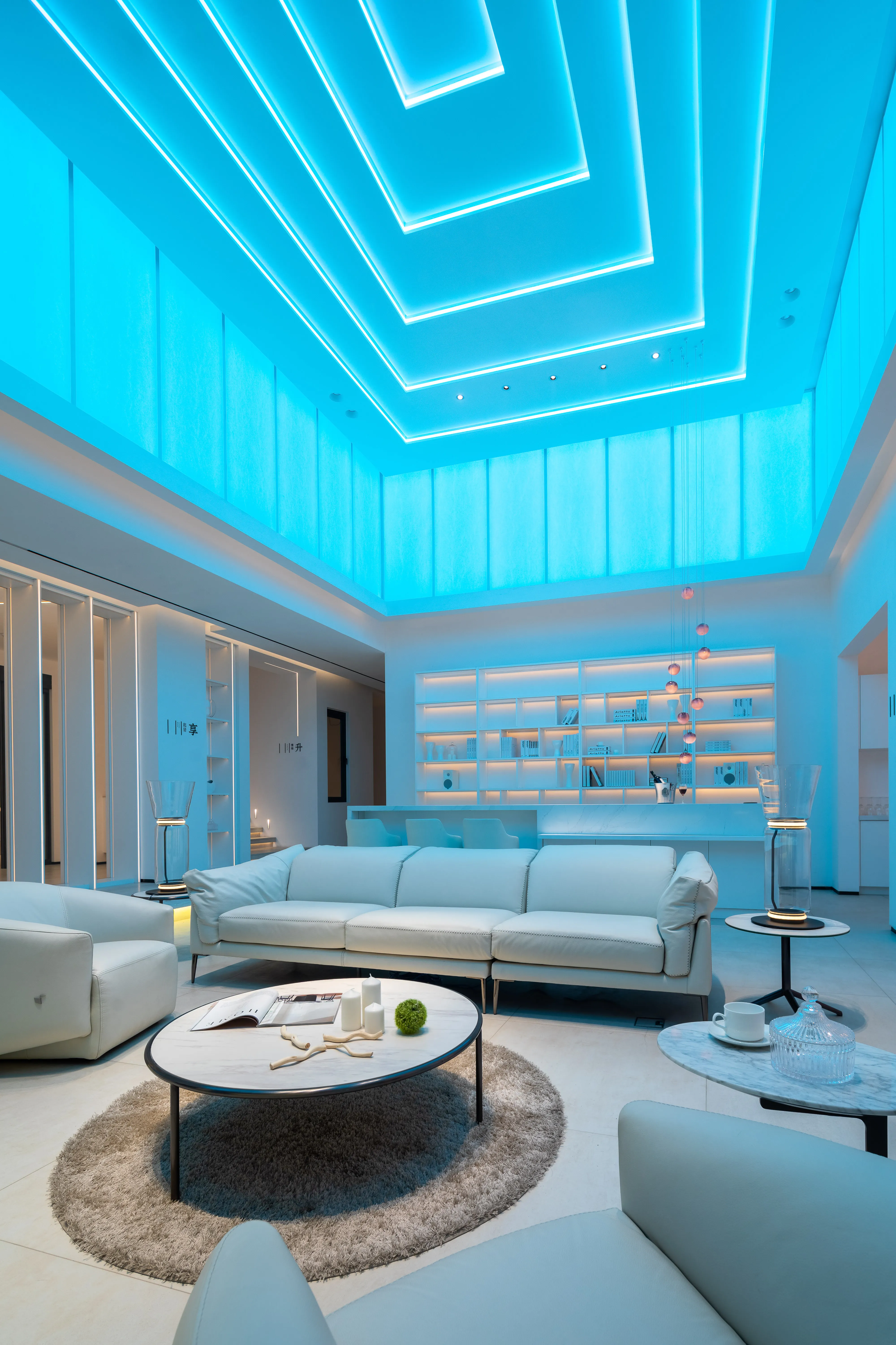 Lighting plays a crucial role throughout the exhibition hall. The layout of high, medium, and low-level lighting is highly rational and scientific, with lighting products emphasizing the overall presentation of the indoor lighting environment. Artistic lanterns, table lamps, floor lamps, and wall lamps serve as decorative light sources, primarily enhancing the ambiance.