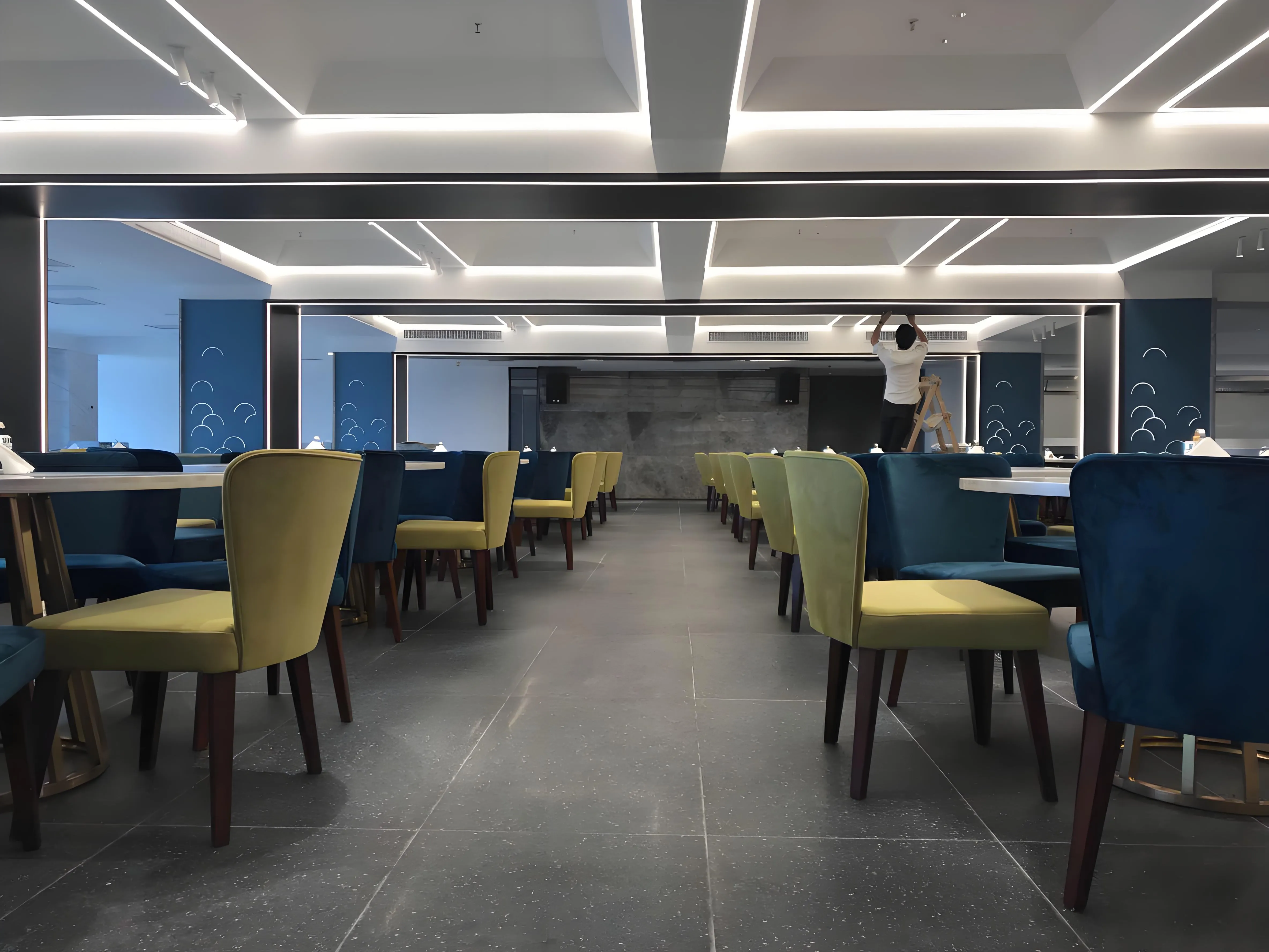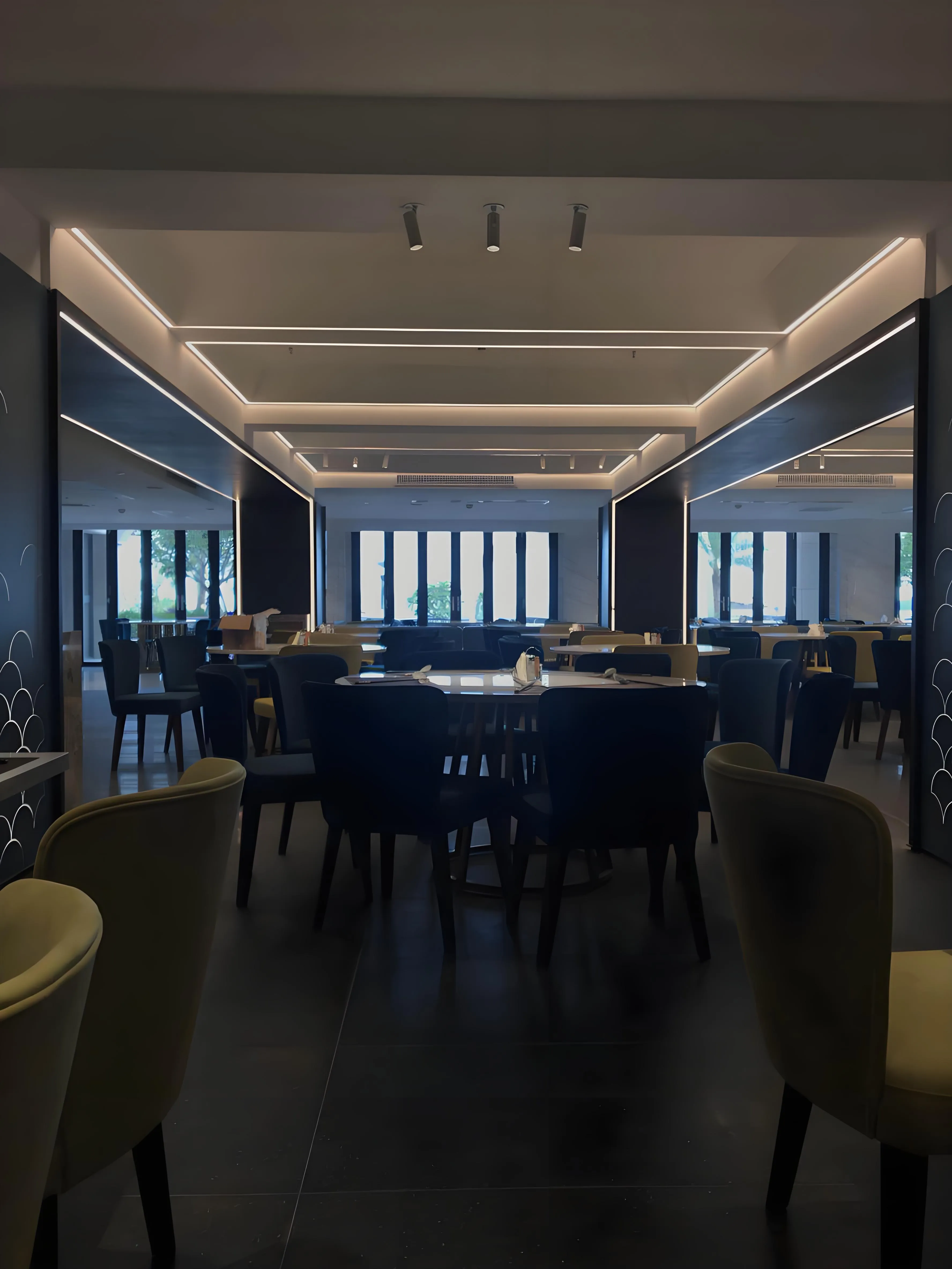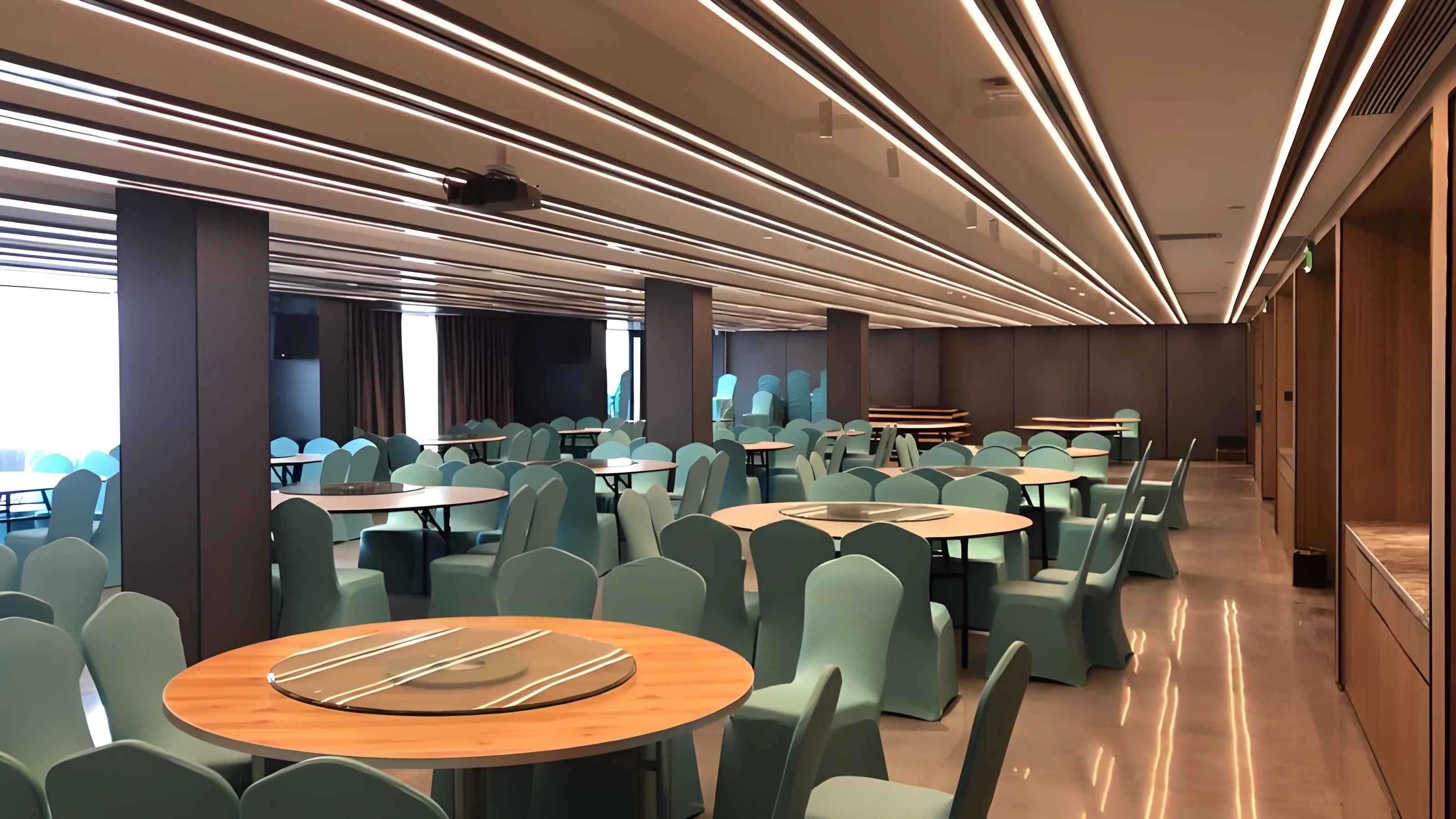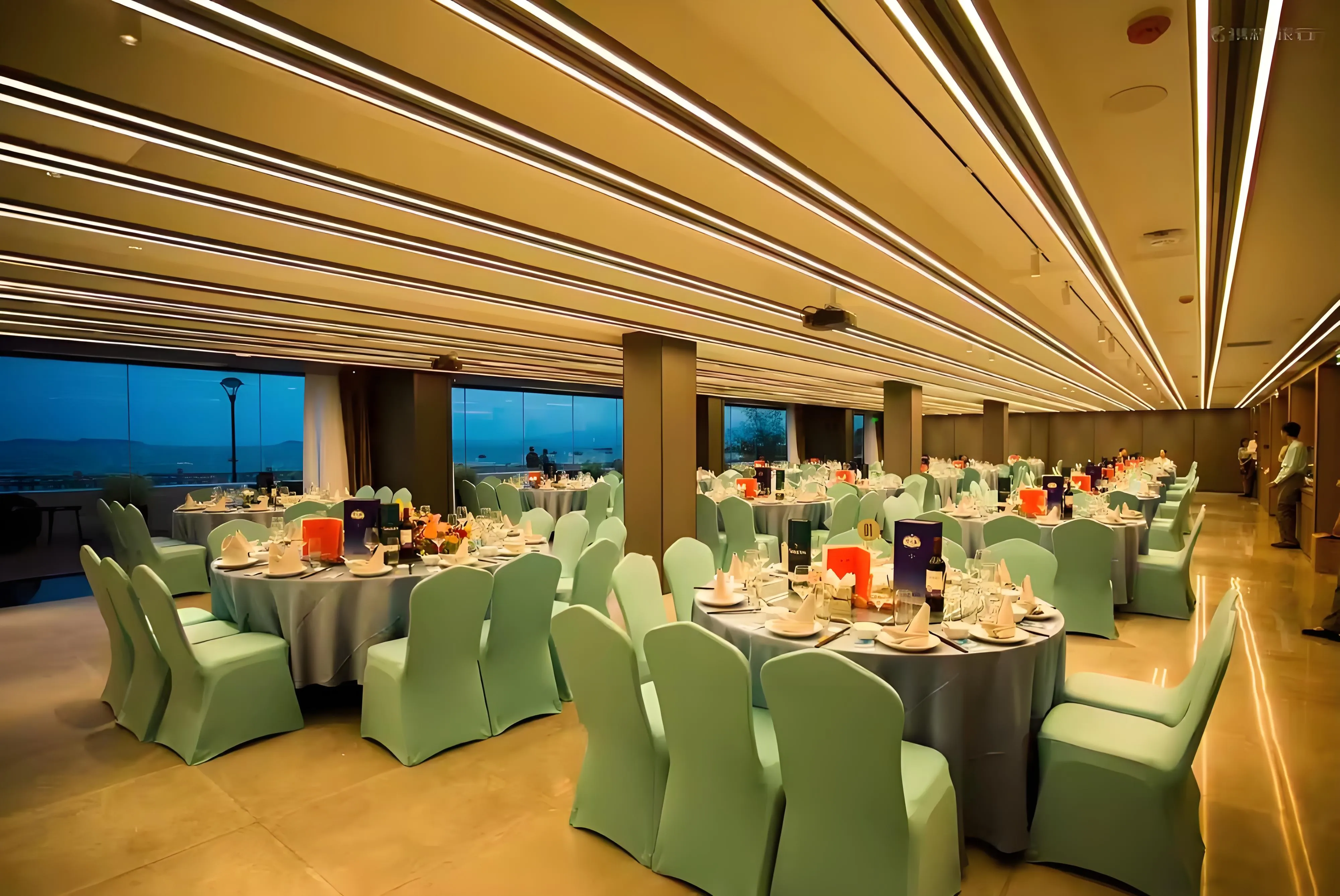 The lighting design is characterized by the ceiling lighting in the banquet spaces, which enhances the structural feel of the ceiling with linear lights. Indirect lighting from LED strips increases the visual height and comfort of the ceiling, while adjustable spotlights are used for focused lighting in specific areas.
