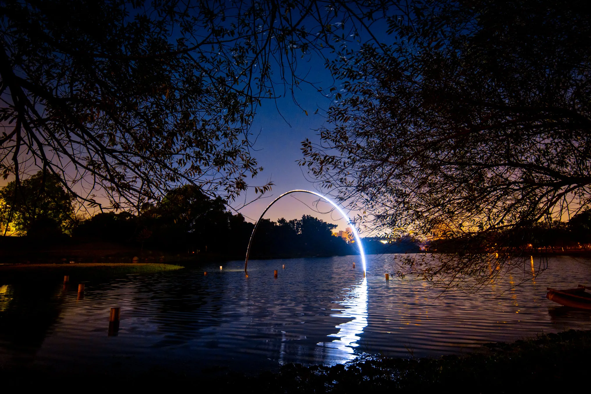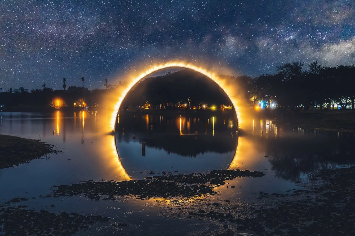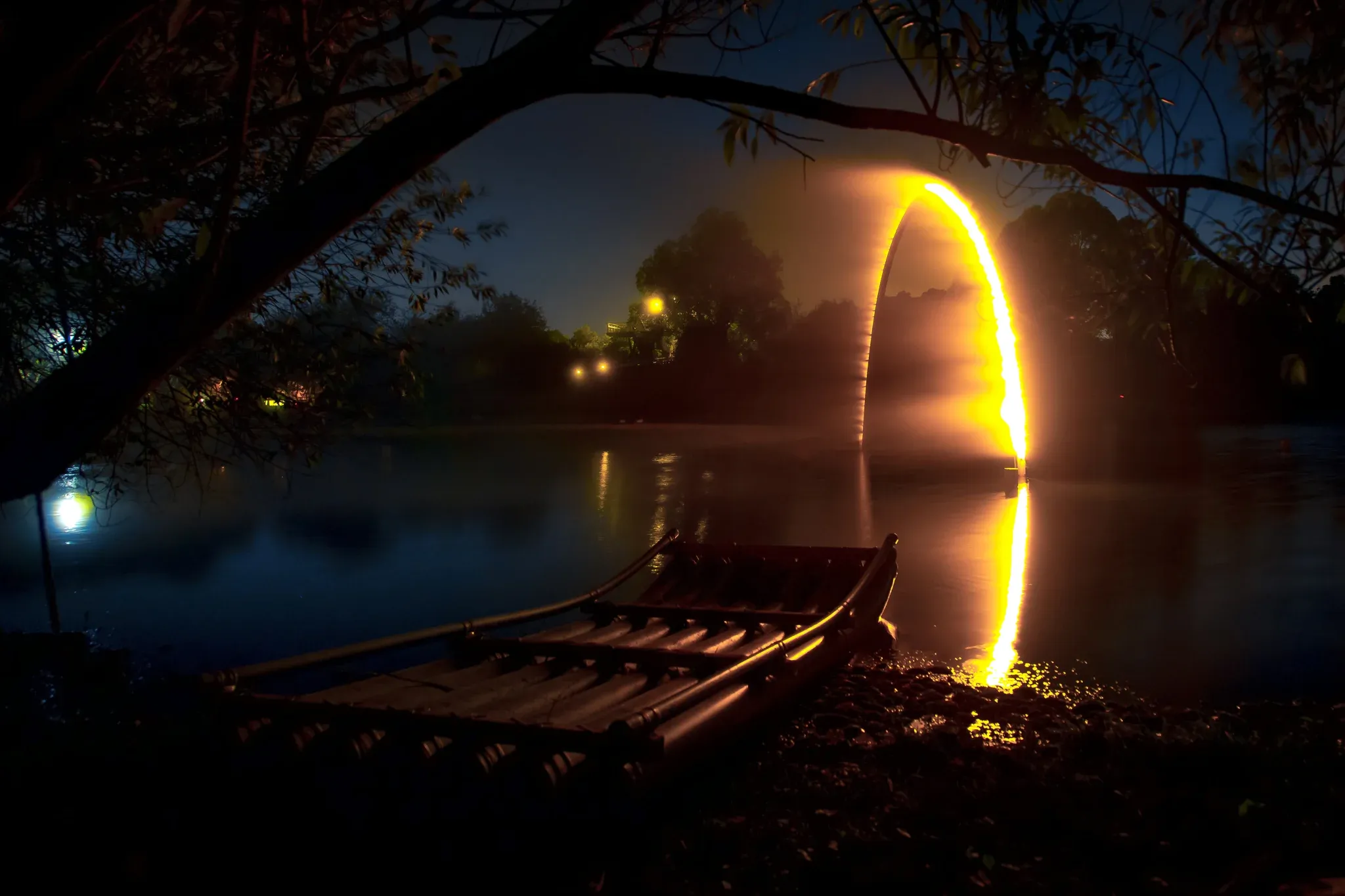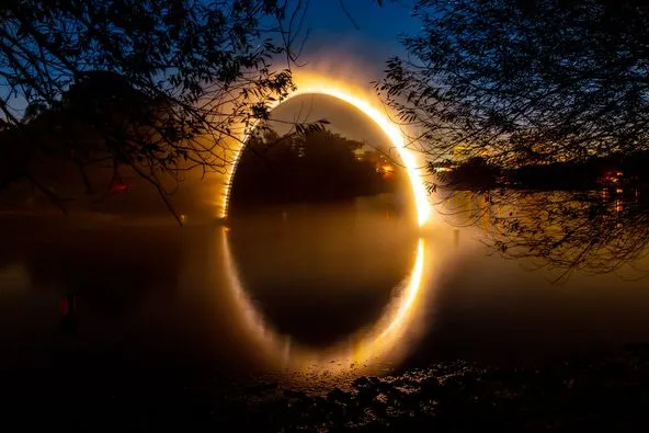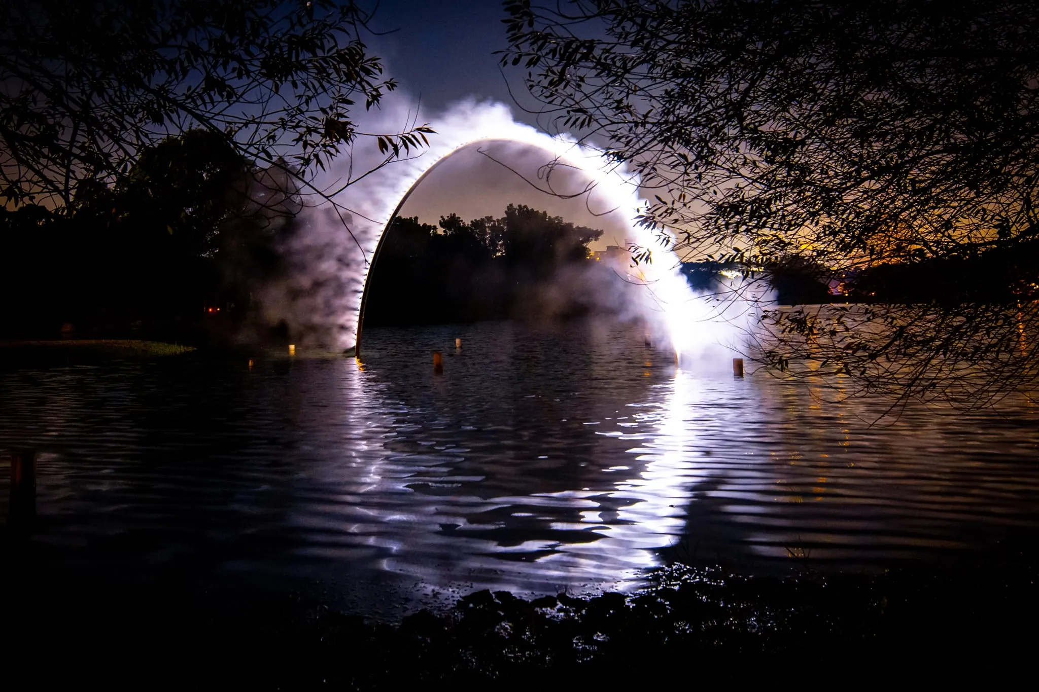 In a 9-meter diameter light installation, water and light are the two main elements in the artwork, which is set up along the waterfront, using the reflection in the water to create a complete, symmetrical circular ring of fog that glows like fireworks at night, as if it were a circle hovering in the air, blurring the horizon of the space in which it is located.