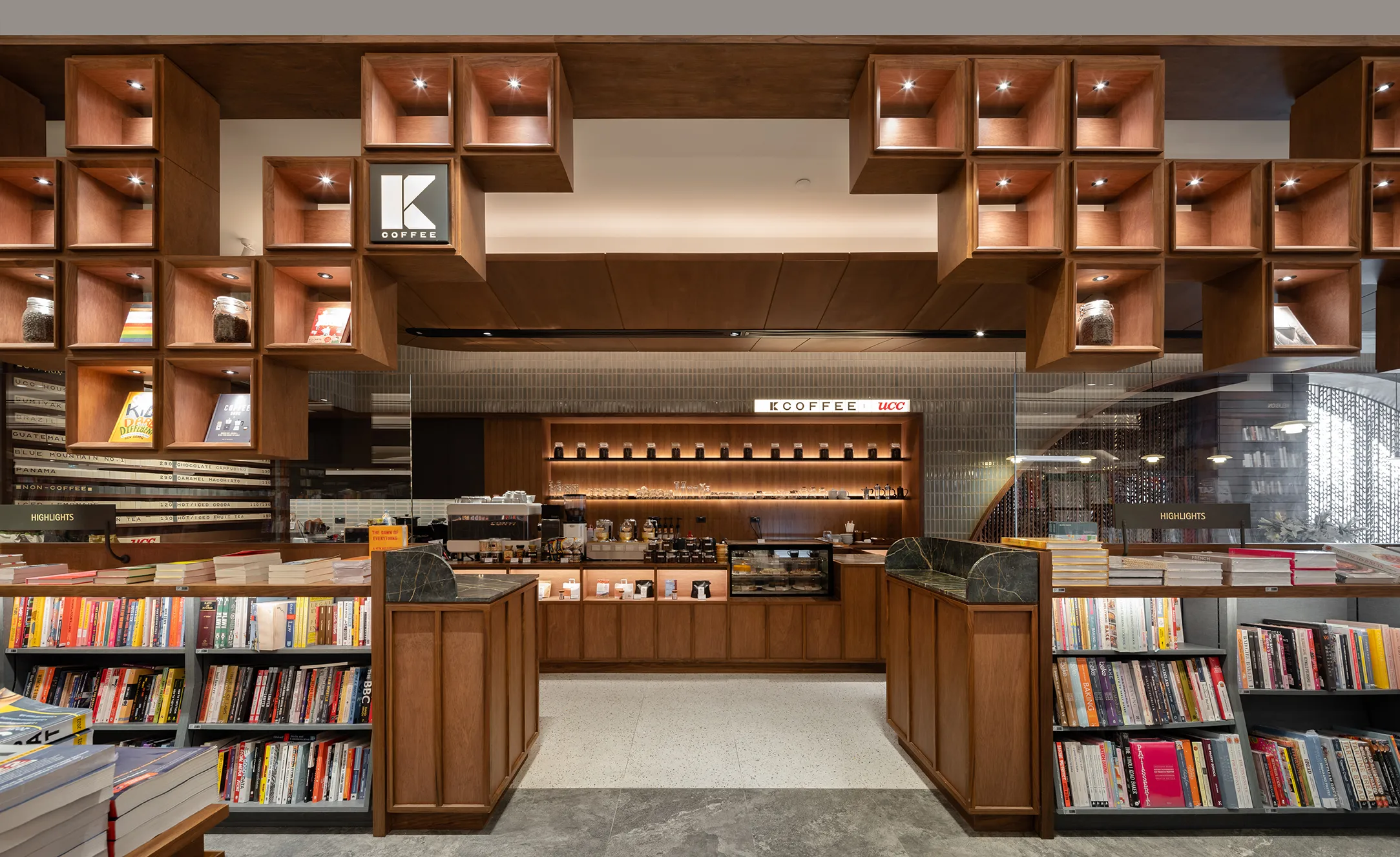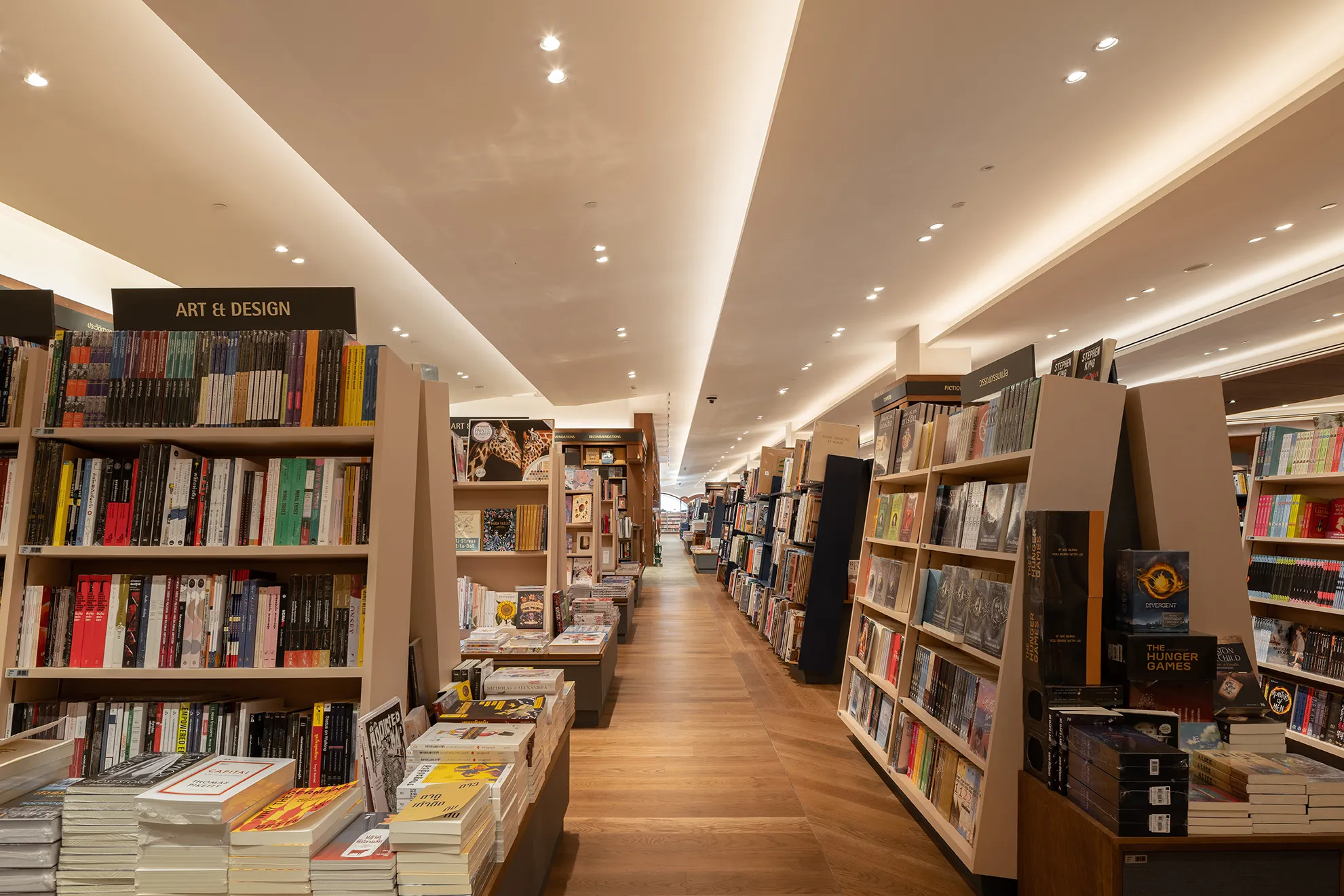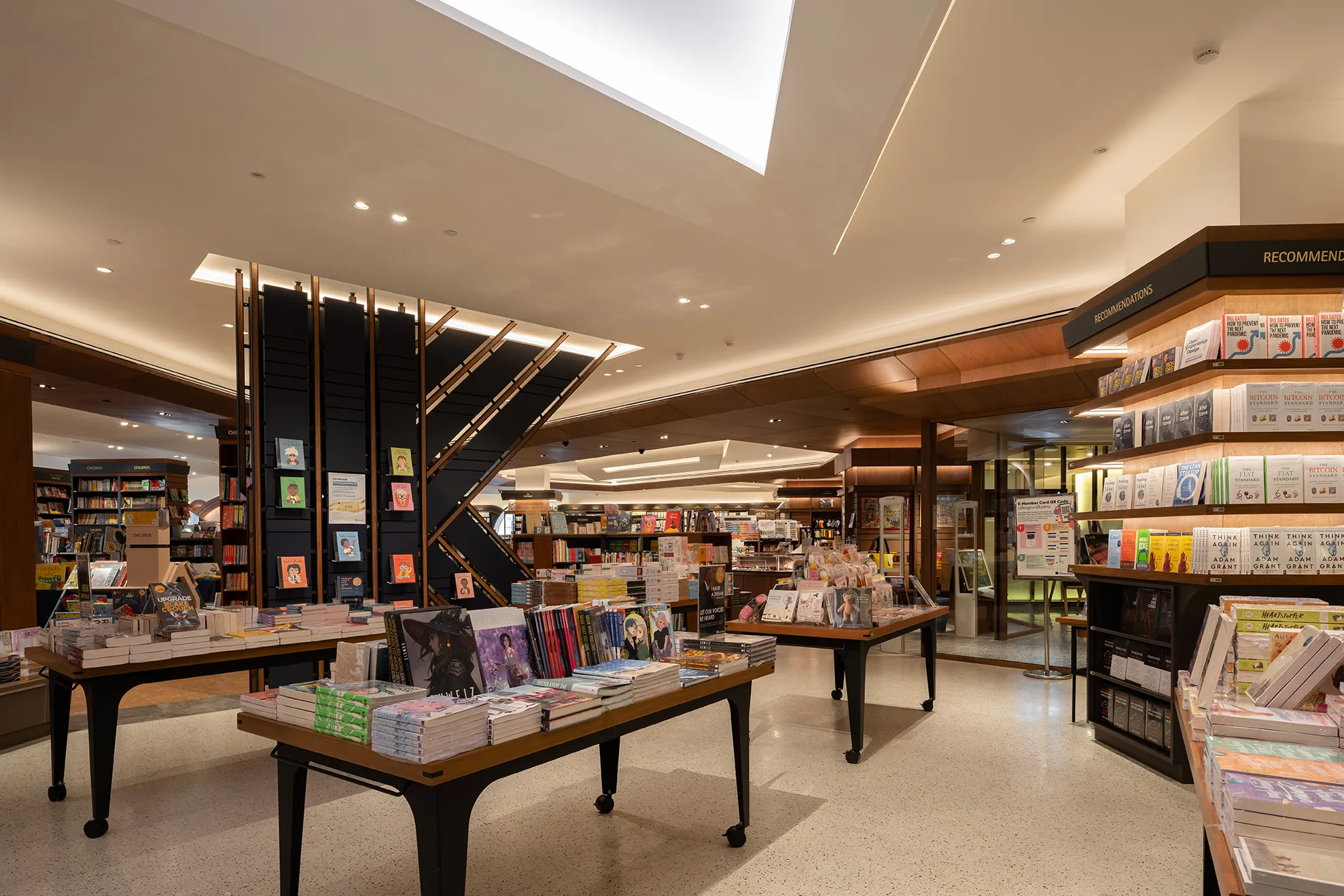 The store comprises the main store space and a kiosk area. The challenges and key design considerations for the main store include the layered slanted ceiling, which is a mixture of light and timbered ceiling. The ceiling design does not necessarily follow the shelving layout, thus, it is challenging to keep a clean and organized lighting arrangement with adjustable downlights and still be able to focus on the bookshelves. The layered ceiling was also carefully detailed so that the indirect lighting was also functional, softening the accentuation.