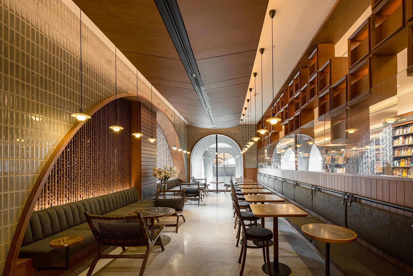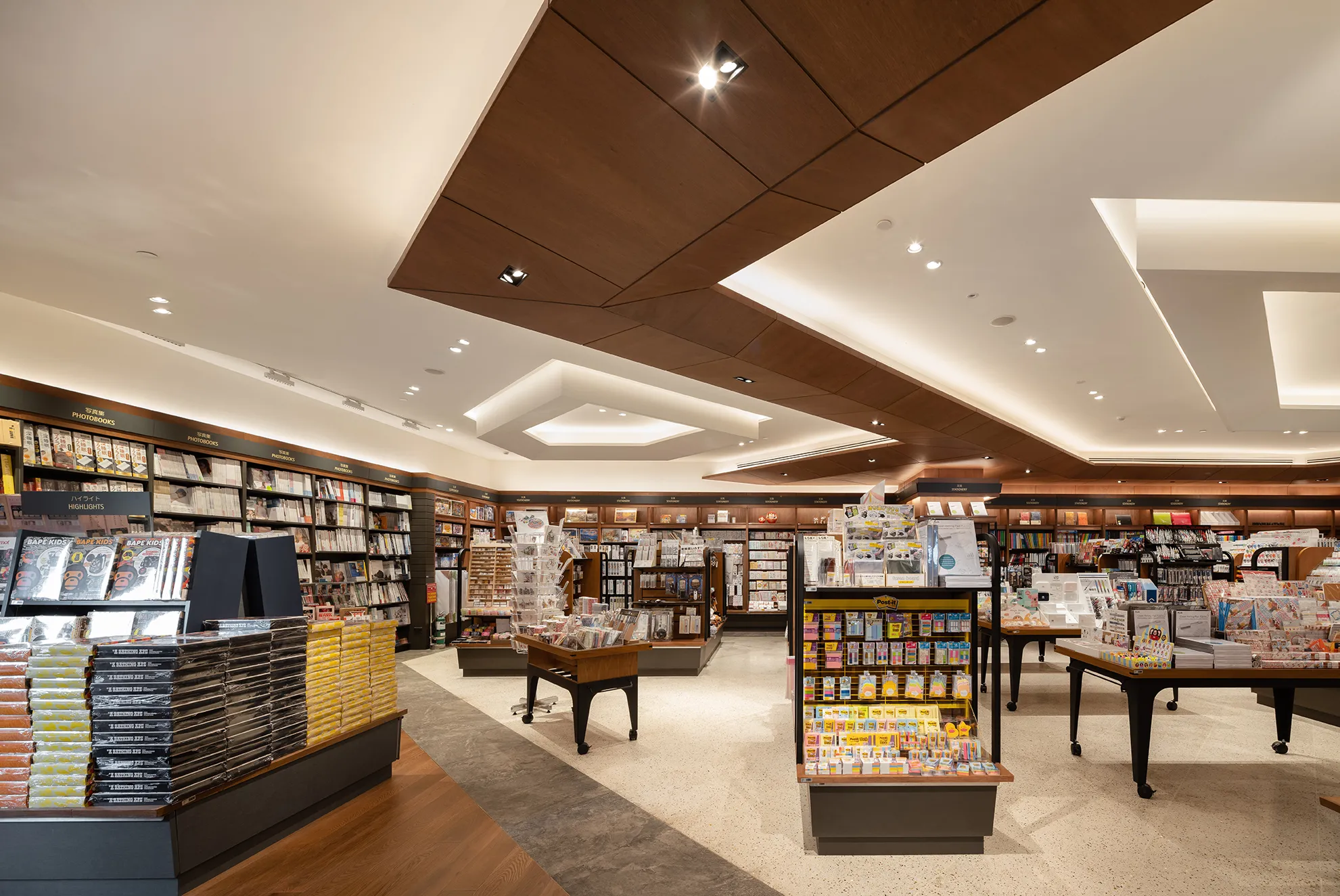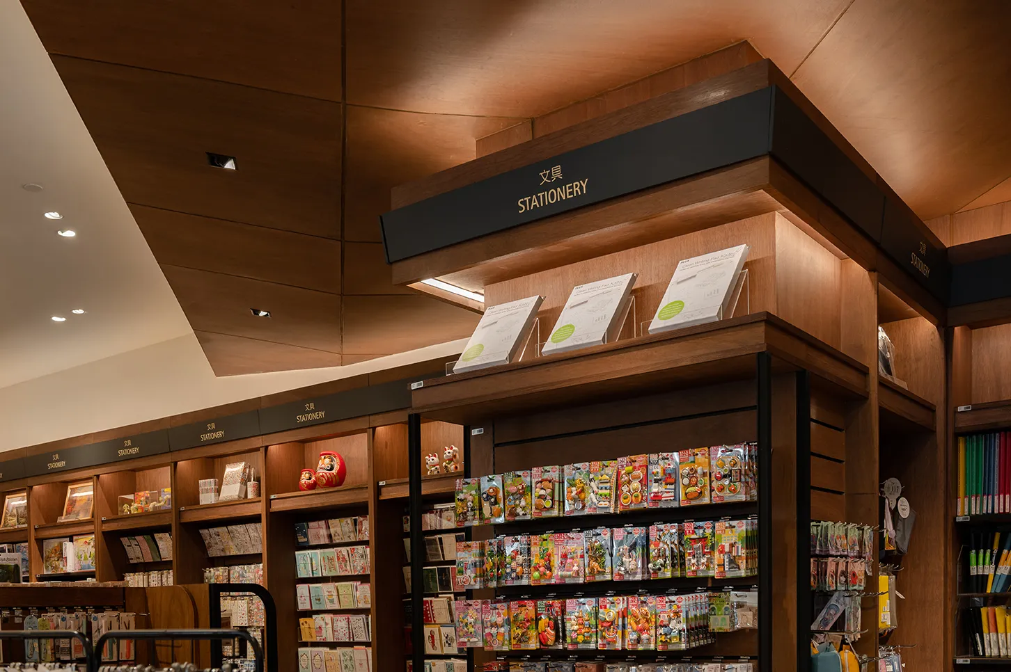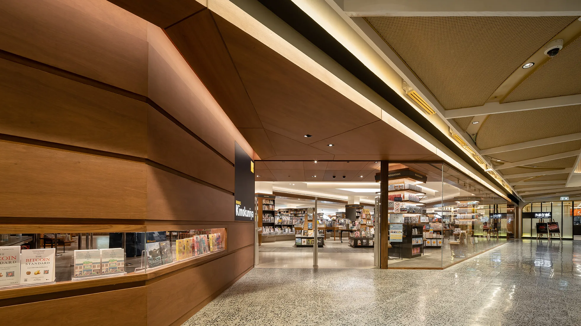 The store comprises the main store space and a kiosk area. The challenges and key design considerations for the main store include the layered slanted ceiling, which is a mixture of light and timbered ceiling. The ceiling design does not necessarily follow the shelving layout, thus, it is challenging to keep a clean and organized lighting arrangement with adjustable downlights and still be able to focus on the bookshelves. The layered ceiling was also carefully detailed so that the indirect lighting was also functional, softening the accentuation.