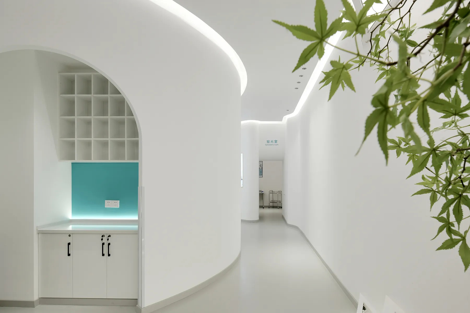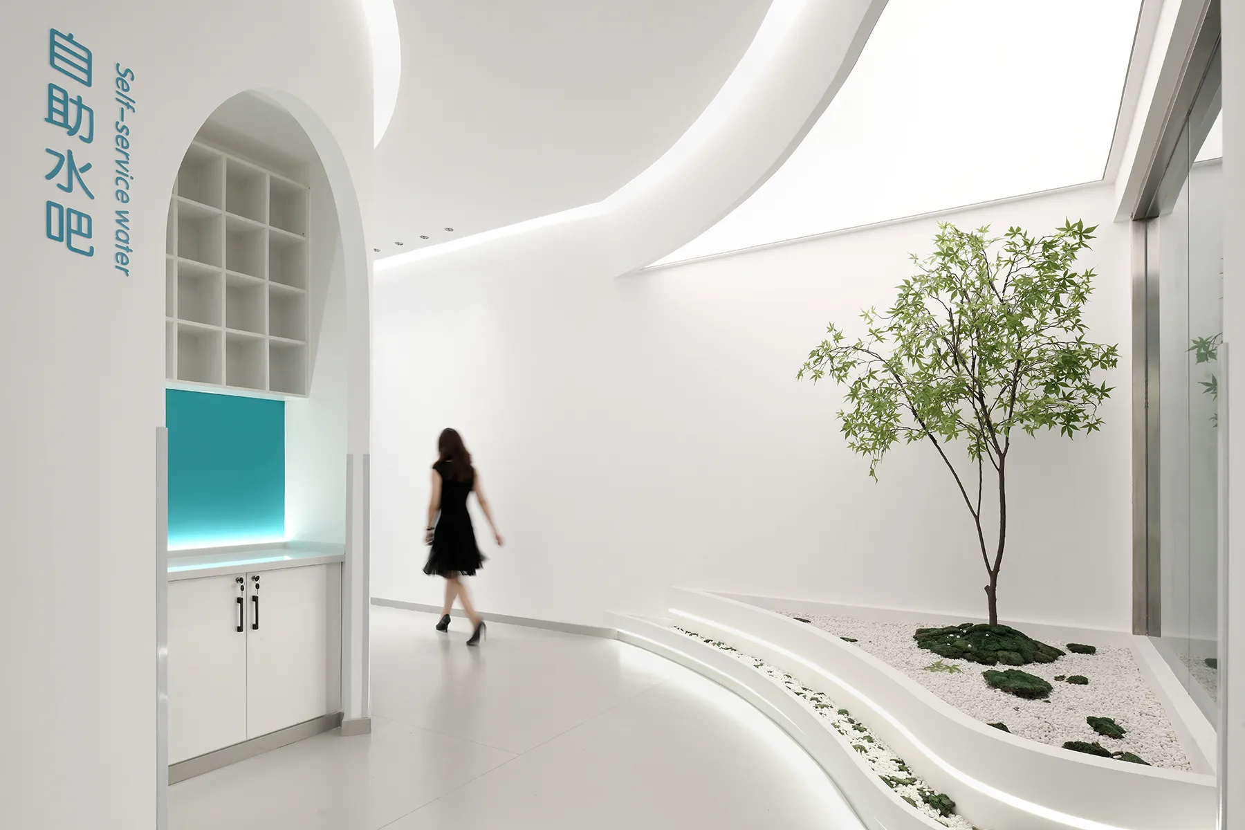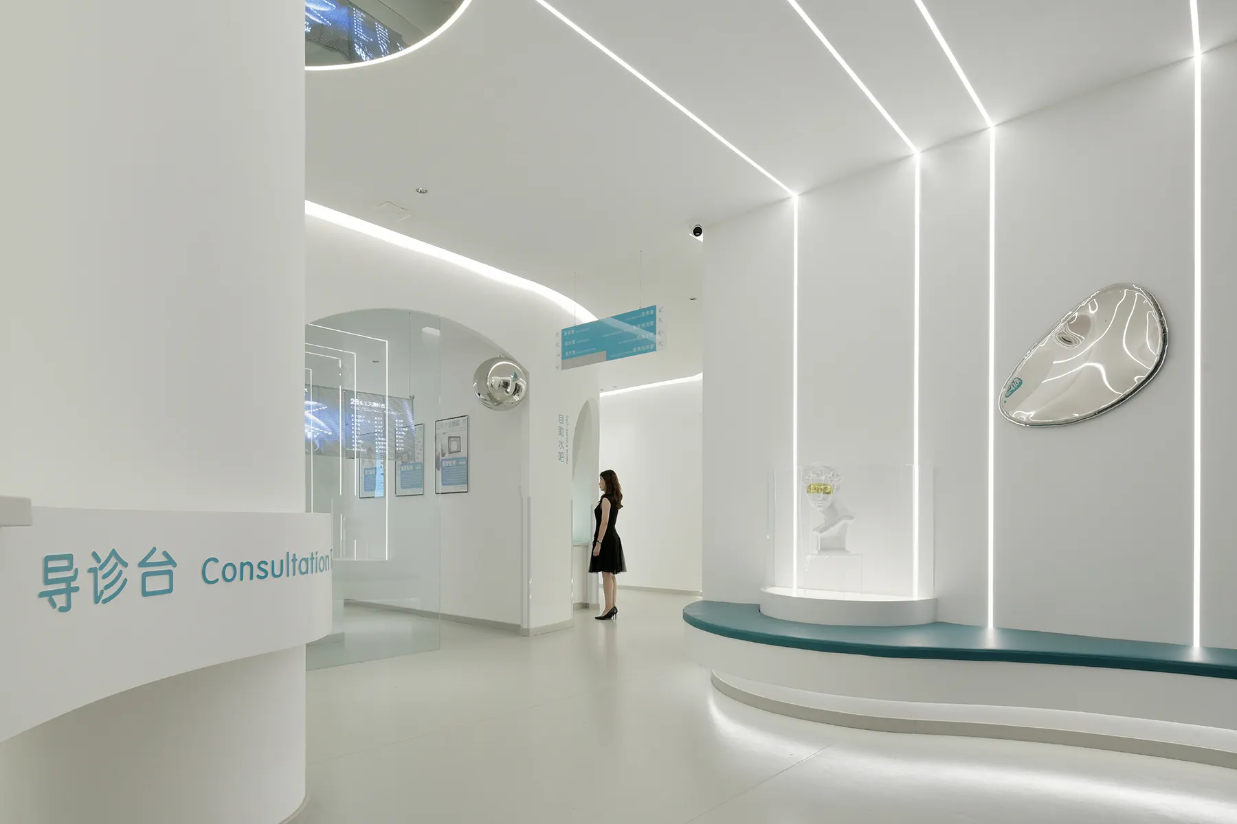 The overall lighting uses a clean 4000K neutral light, combined with wall-washing light strips along the curved walls, offering both gentle basic lighting and guidance. The linear lighting on the walls of the reception area enhances the spatial transparency and visual impact, while also giving a more technological feel to the stainless steel sculpture elements in the space.