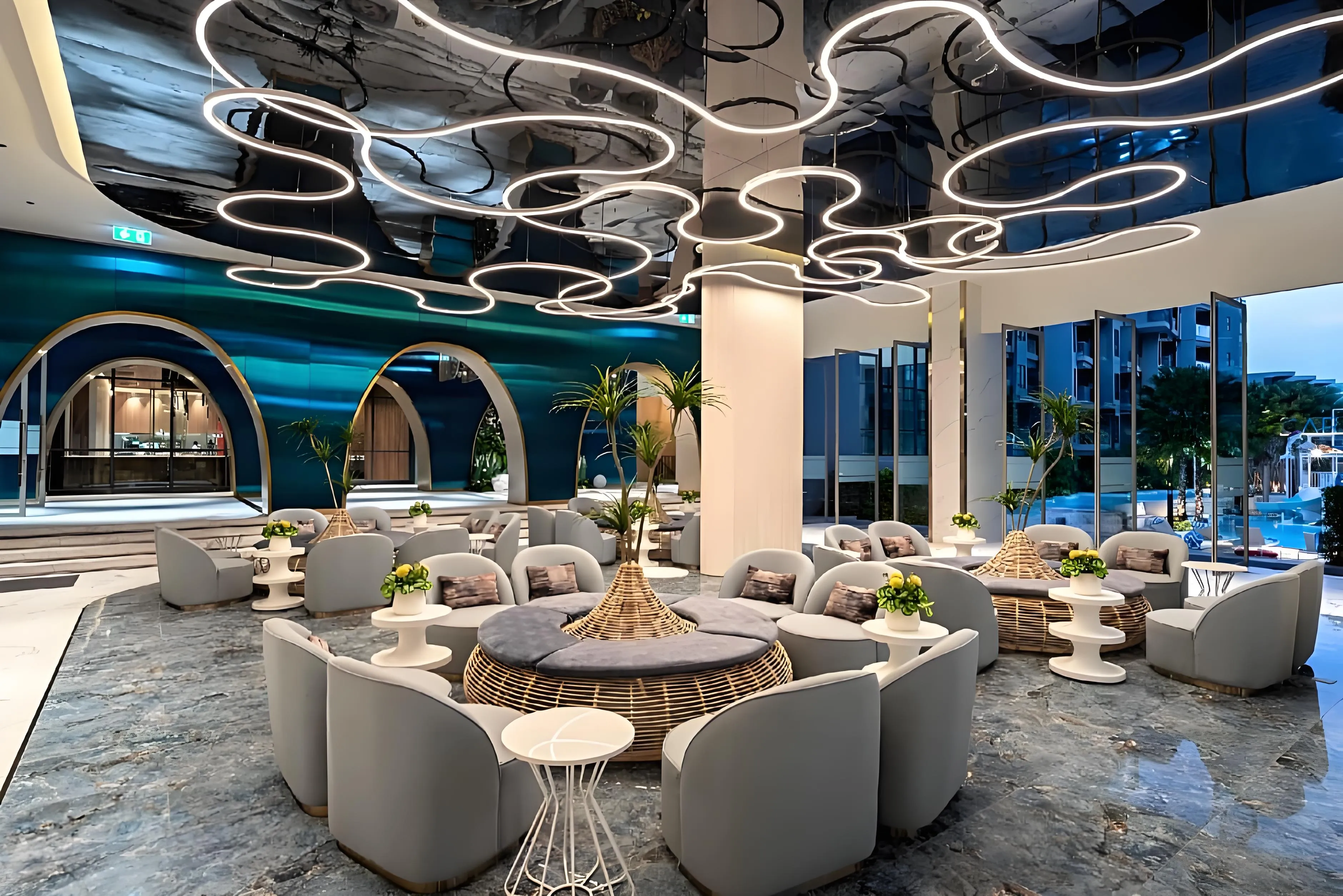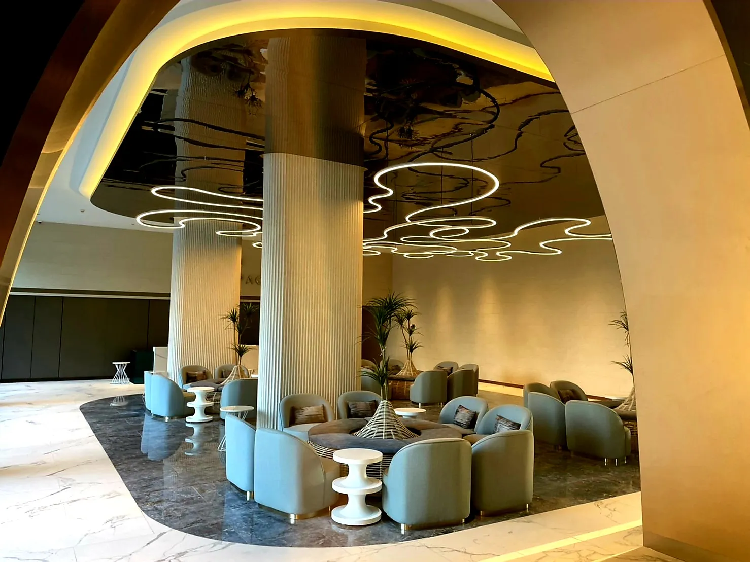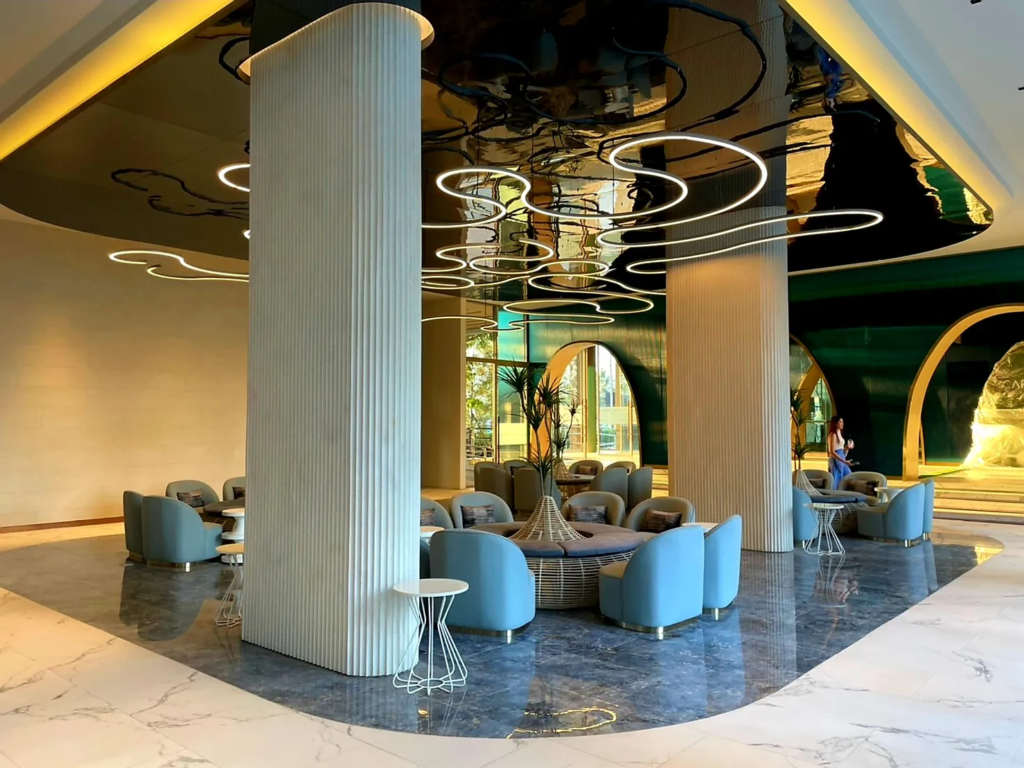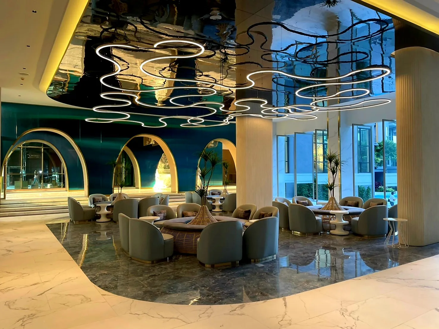 How to use lighting to create a unique and elegant hotel ambiance? Here is a great example. We use the AS3535 free-curve series fixtures, which feature intricate and rhythmic bending and shaping designs to form a one-of-a-kind visual image. The internal LED strip perfectly fits the curves of the external fixtures, providing uniform illumination without dark areas.