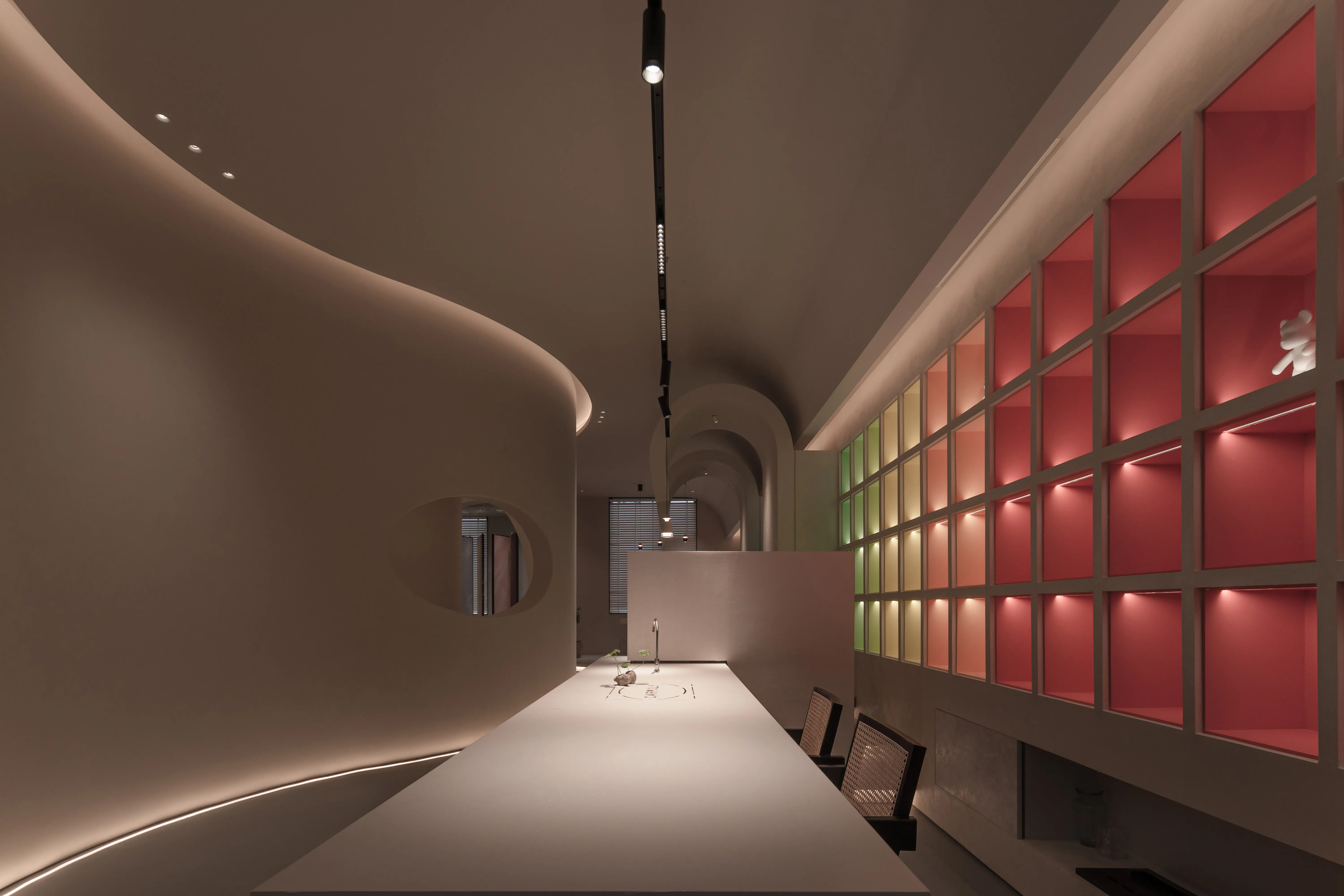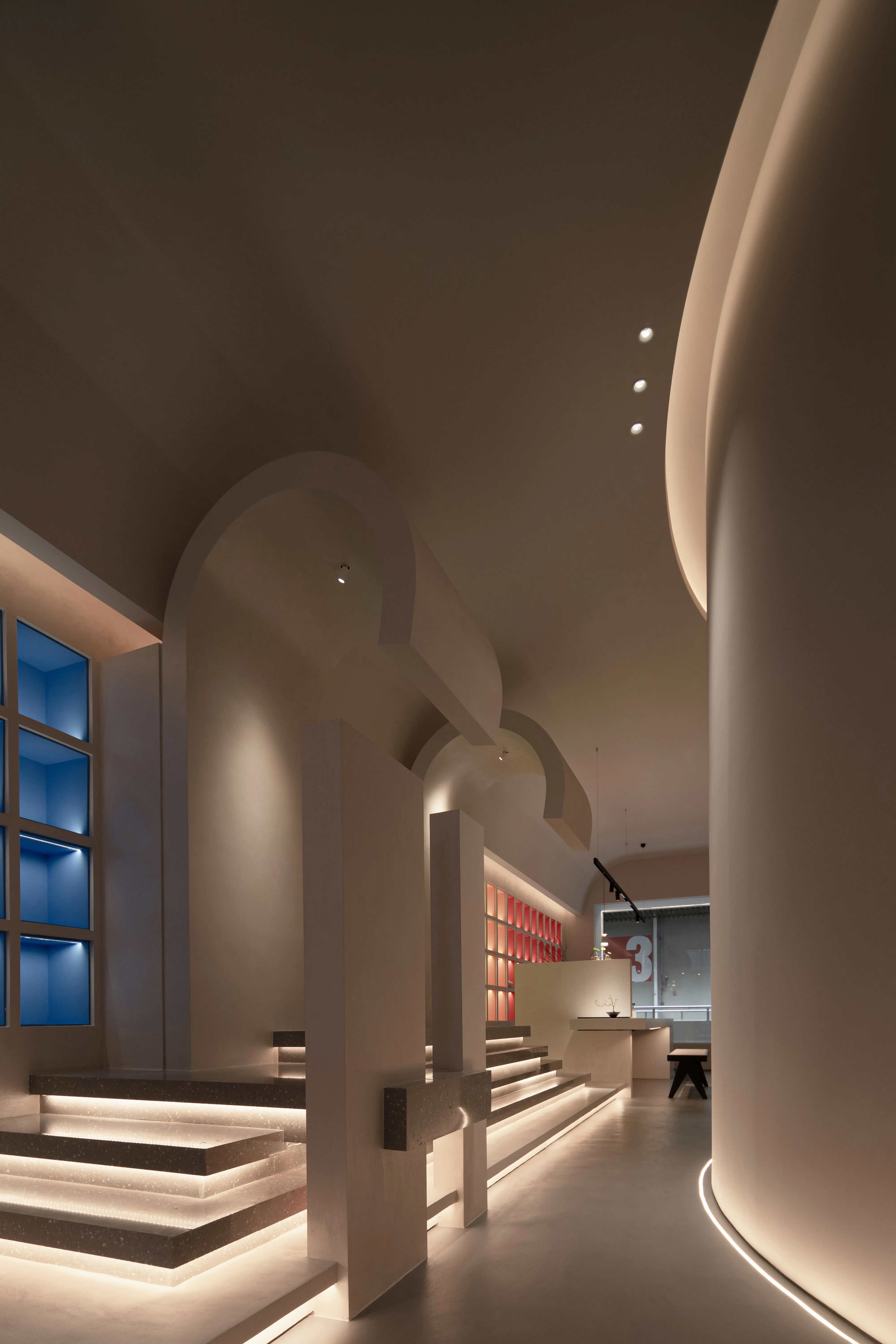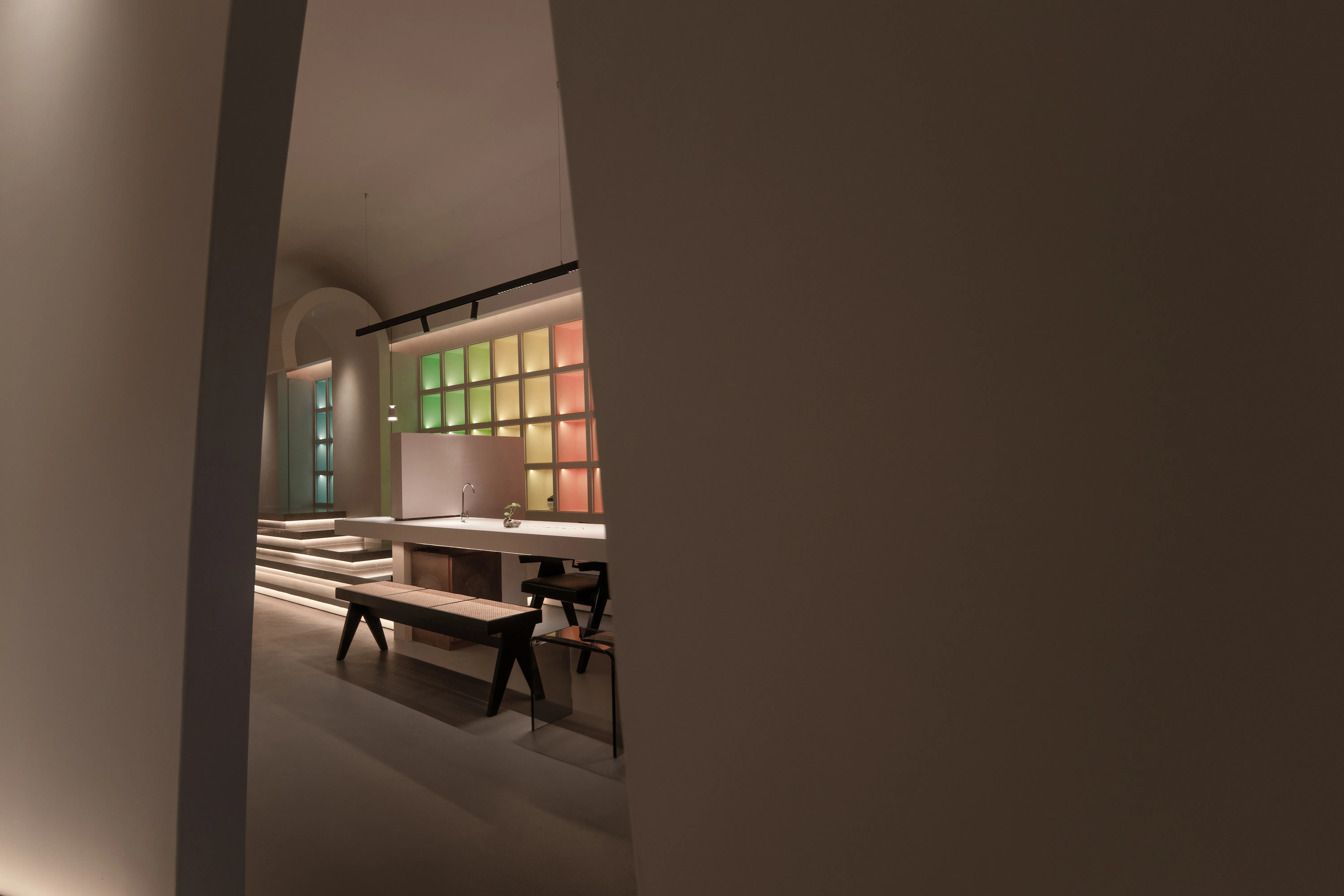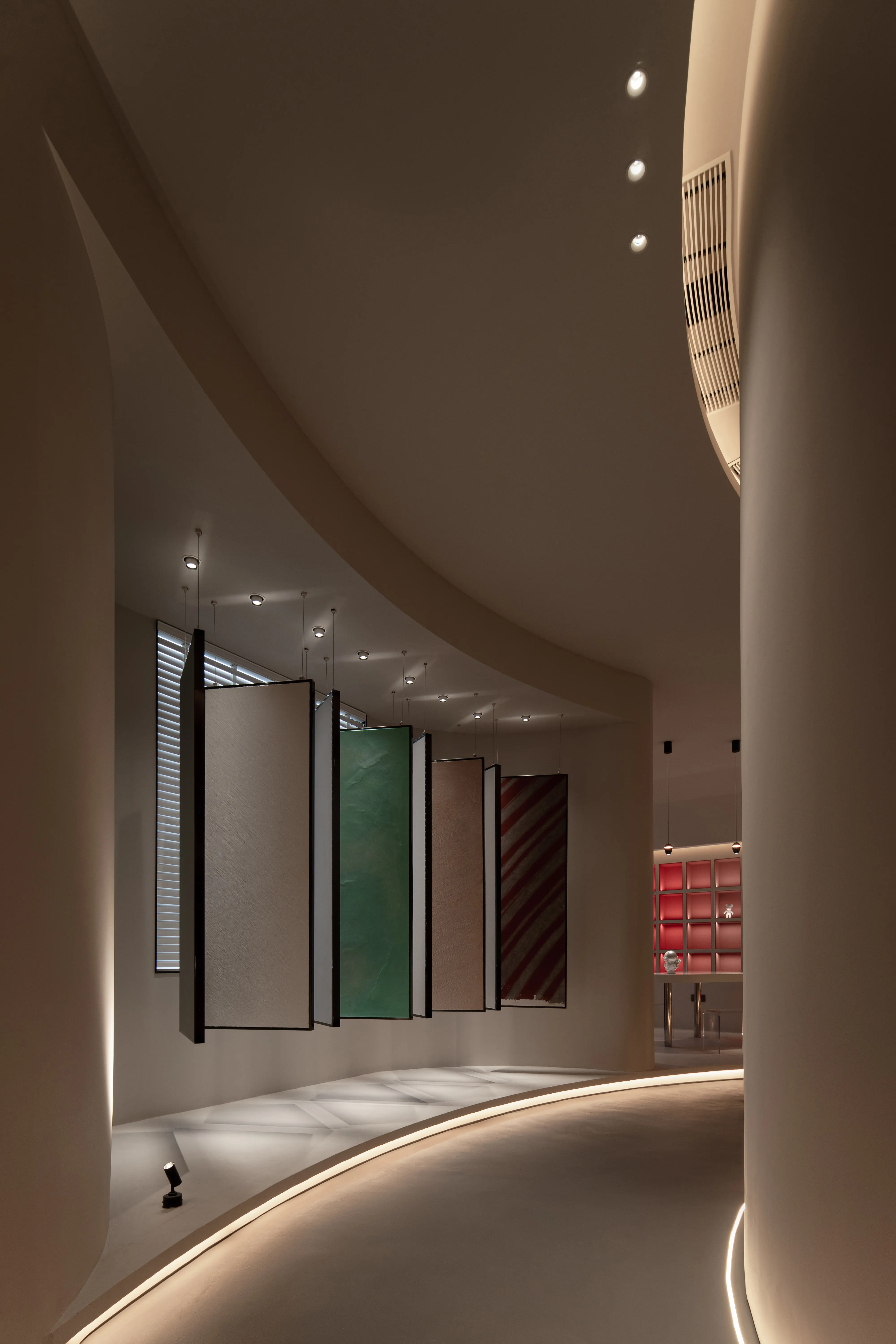 The overall lighting design concept is to create an immersive and experiential environment that highlights the visual impact of the lighting on the paints displayed. The overall ambiance is achieved using a 2700K color temperature for base lighting, supplemented by 3000K wall washers for the vertical surfaces. For the color cards and sample areas within the cabinets, a 3500K color temperature is used to accurately reproduce the true colors and textures of the paints.