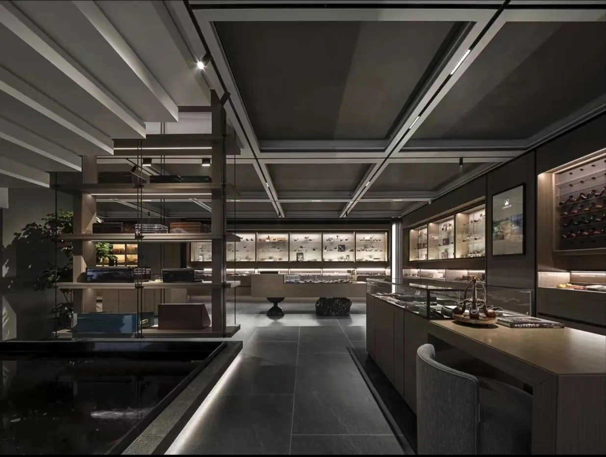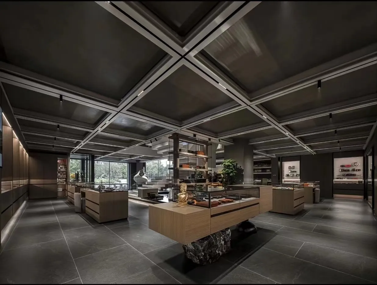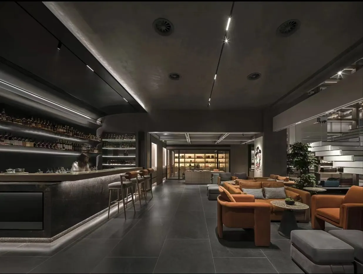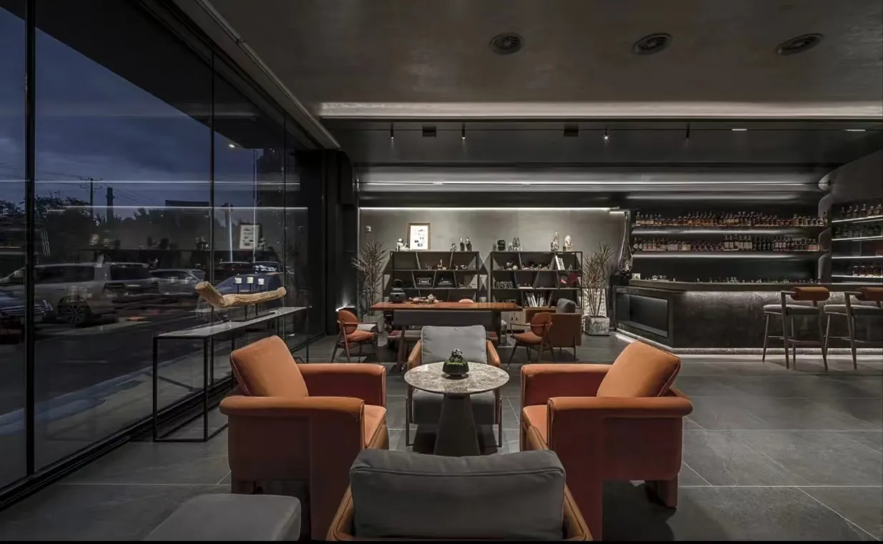The indoor space is understated yet vibrant, featuring a sophisticated and elegant color palette that evokes the rich, lingering essence of Pu'er tea. Strategic accents of Hermès orange, gray, and metallic elements are incorporated throughout the space, maximizing the expression of refined artistry and elegance.
