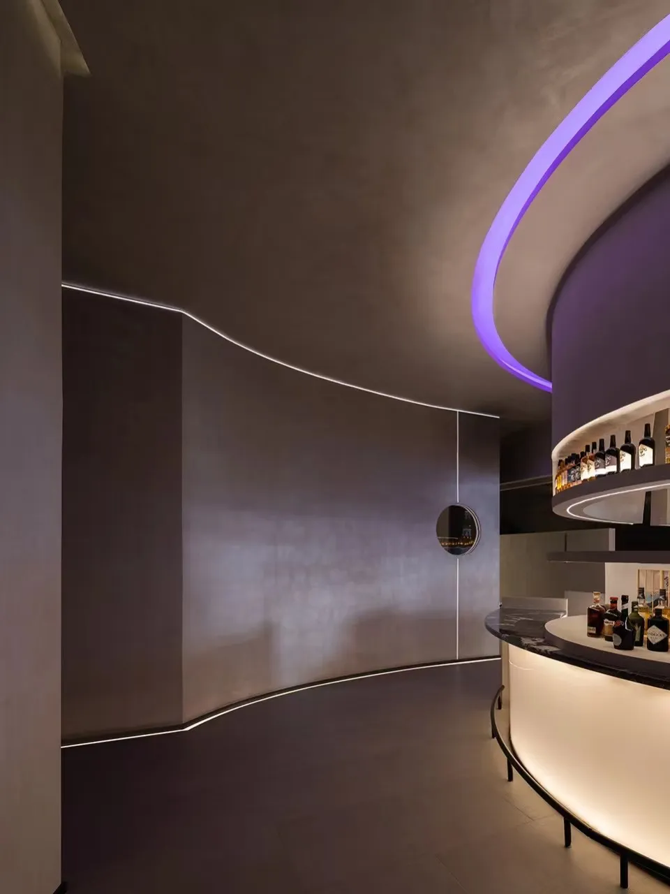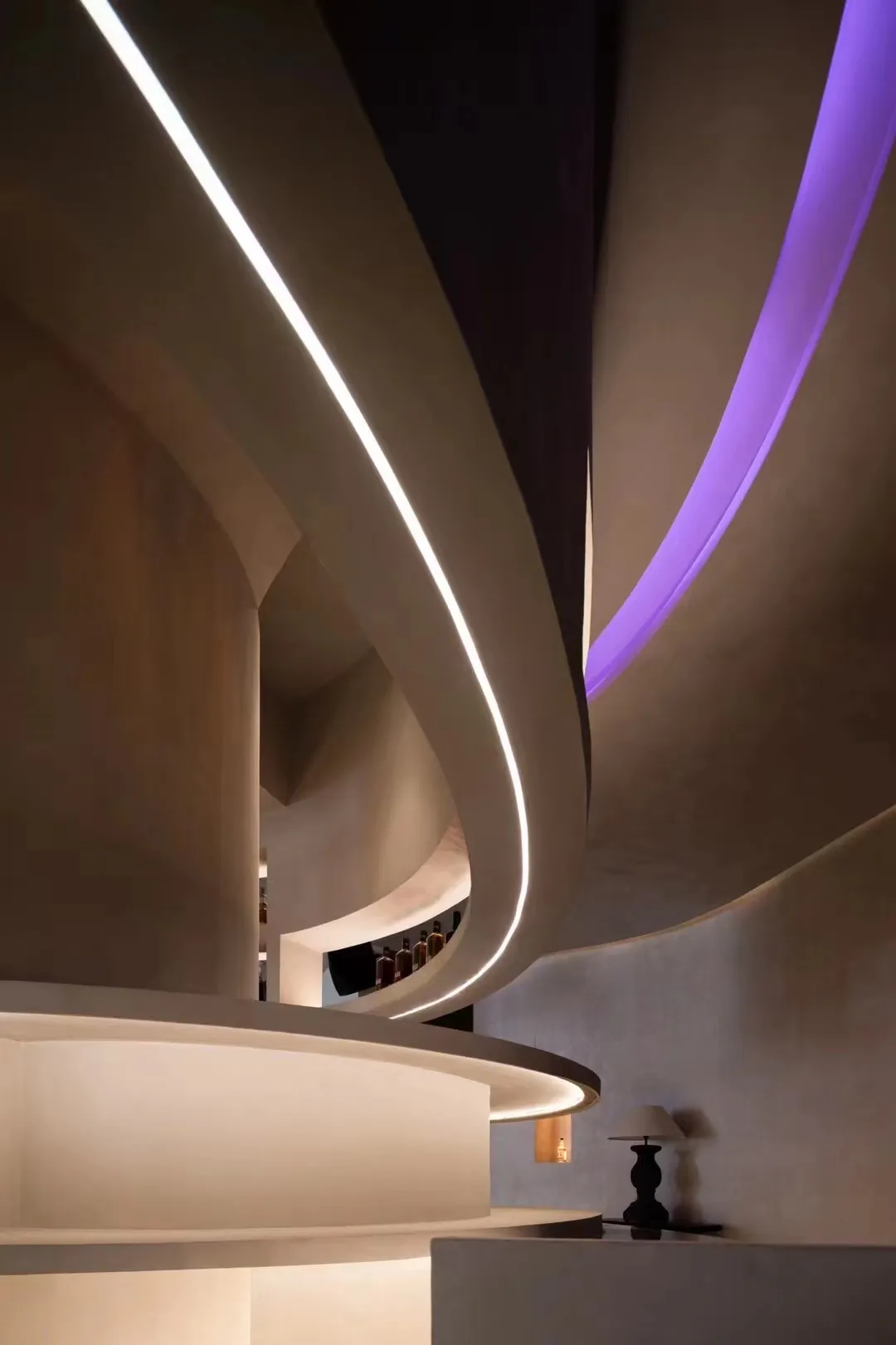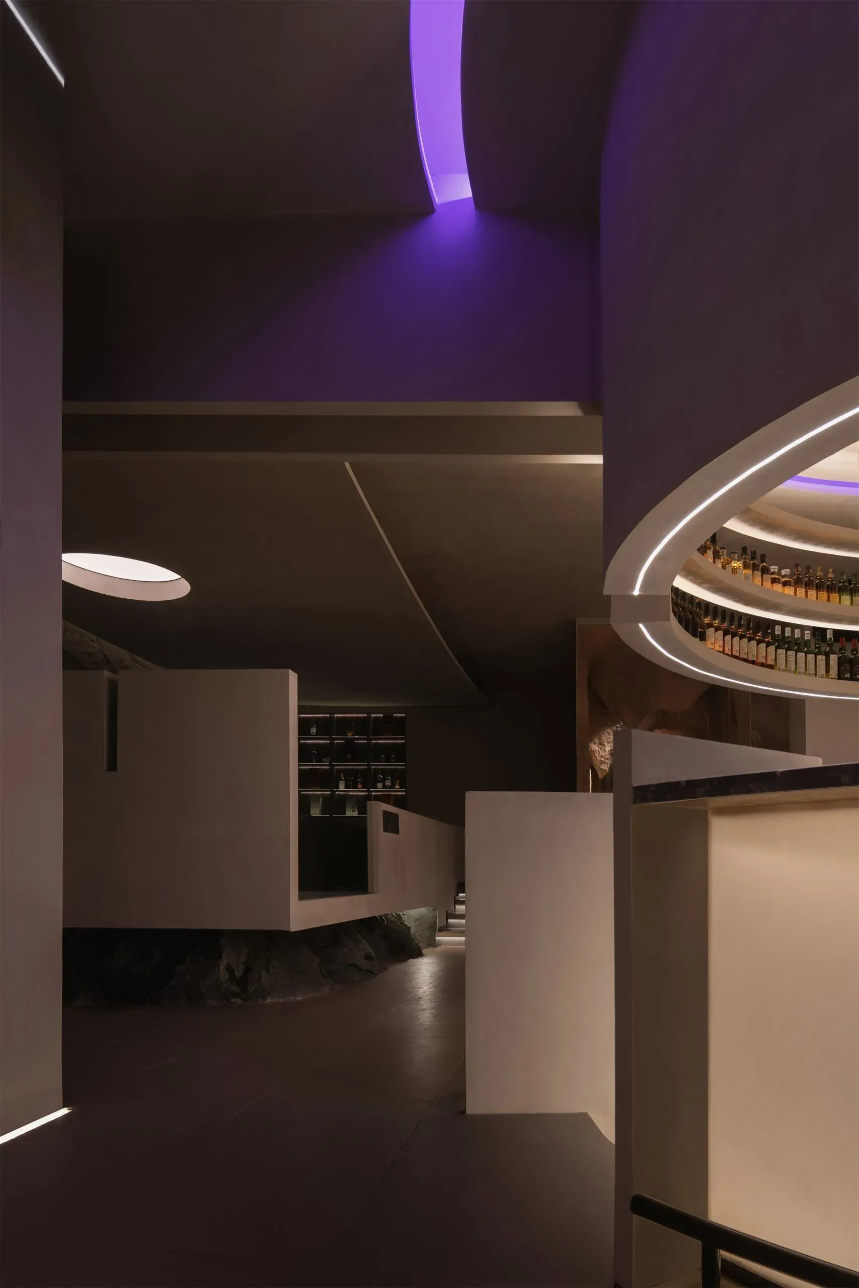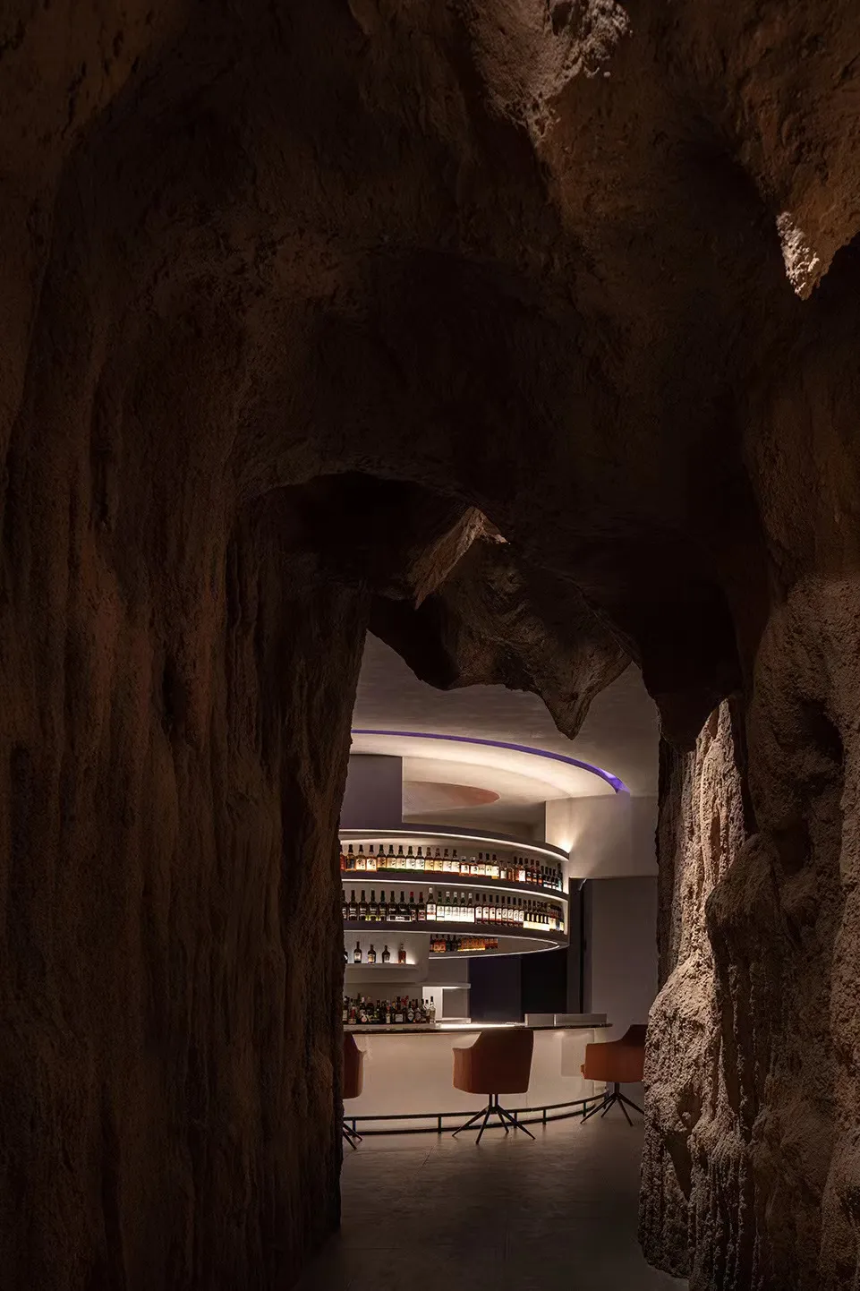 This design allows the commercial building to naturally integrate into daily urban life, seamlessly blending with the brand space and surrounding streets. Passing through the valley corridor leading to the bar is like traversing time and space, a journey from reinforced concrete to the cosmos, allowing patrons to shed the pretense and fatigue of city life.