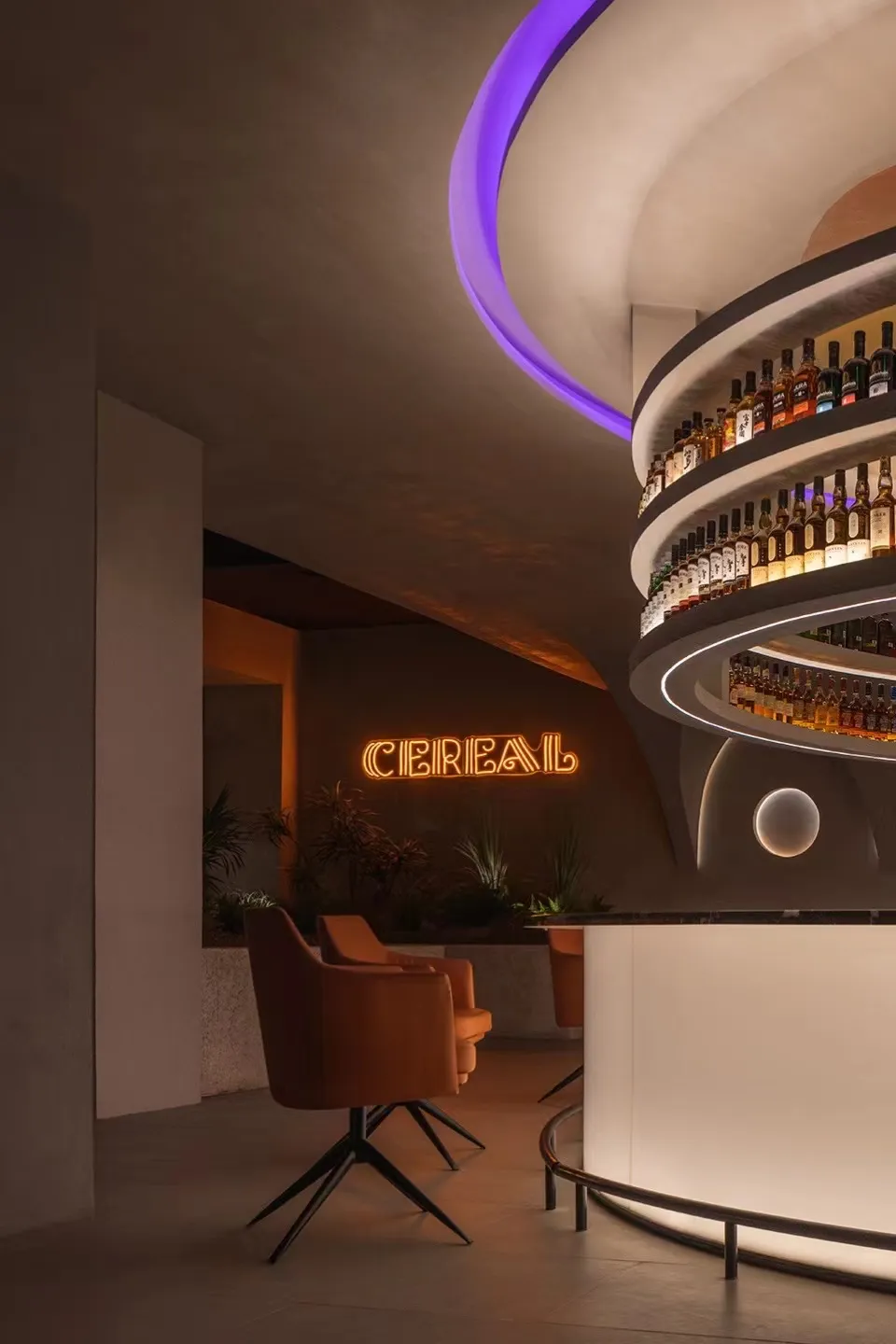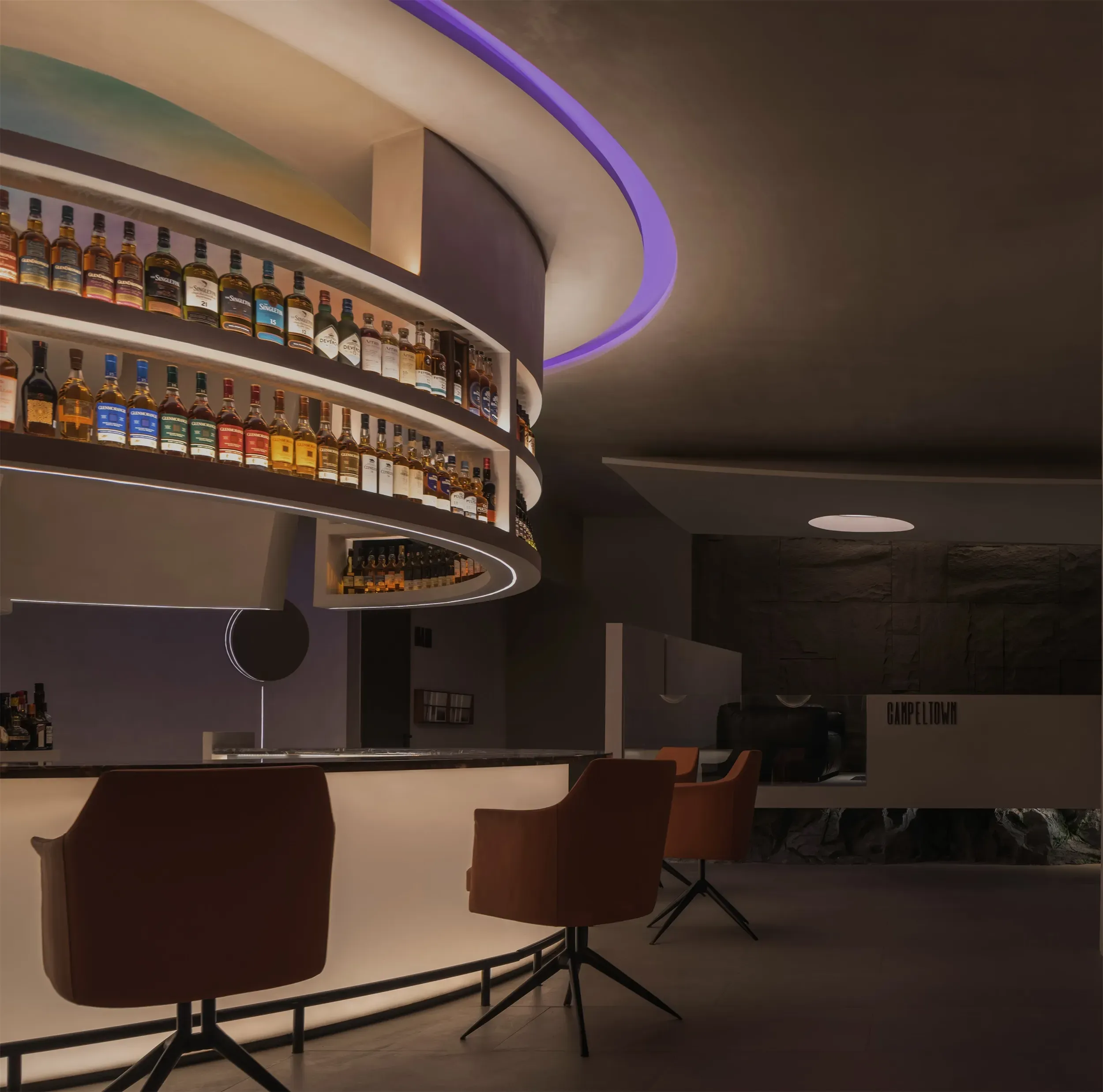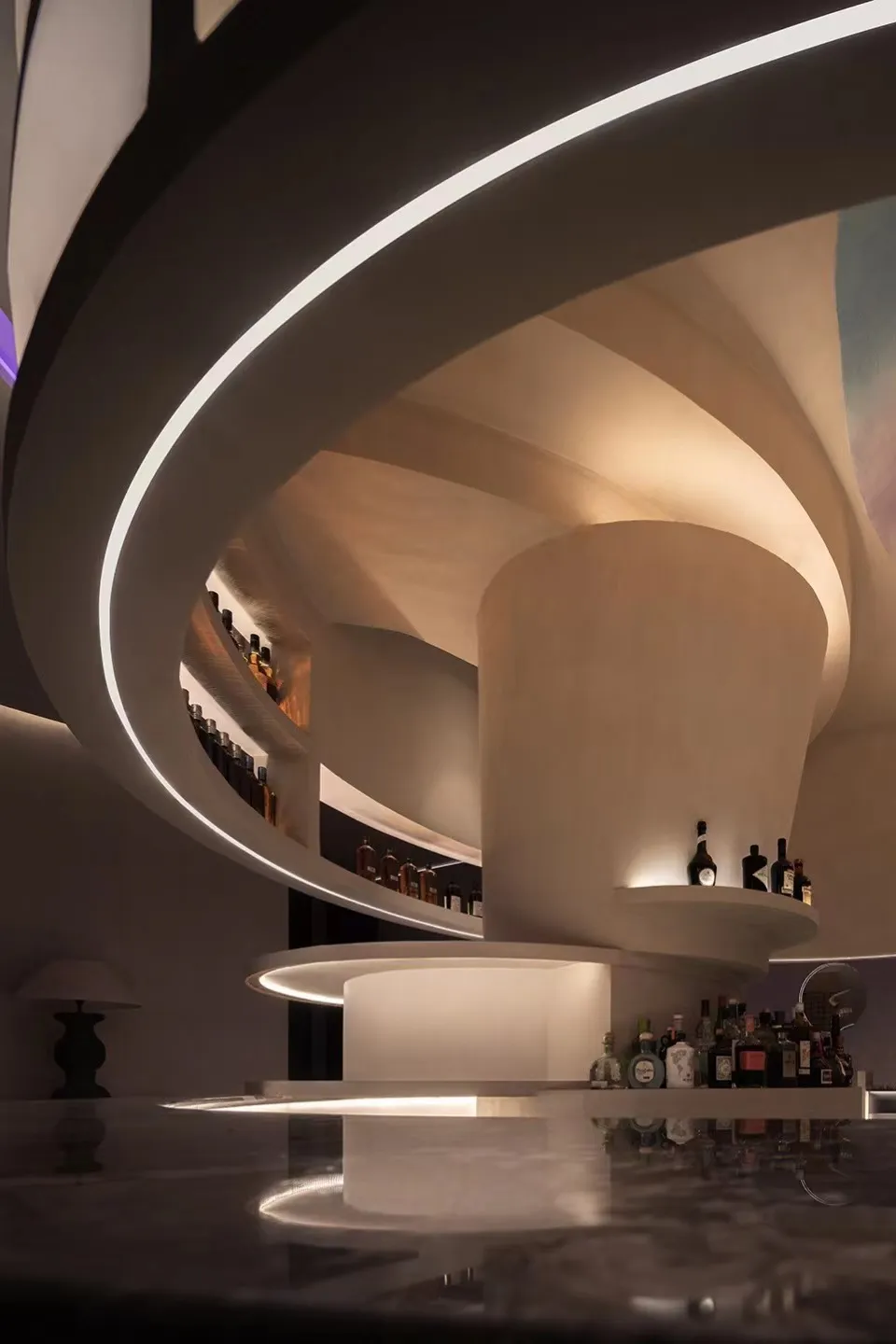This design allows the commercial building to naturally integrate into daily urban life, seamlessly blending with the brand space and surrounding streets. Passing through the valley corridor leading to the bar is like traversing time and space, a journey from reinforced concrete to the cosmos, allowing patrons to shed the pretense and fatigue of city life.