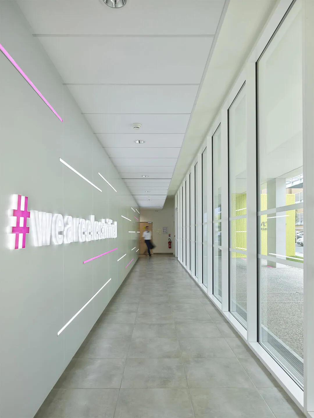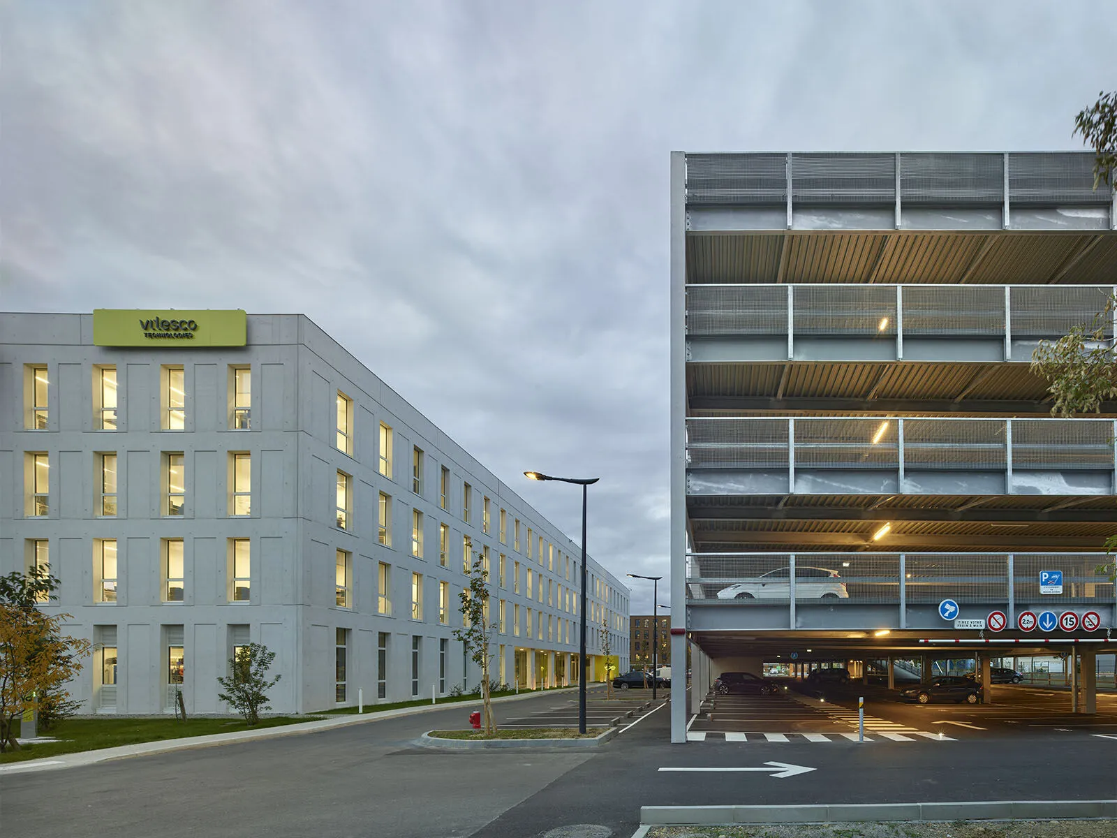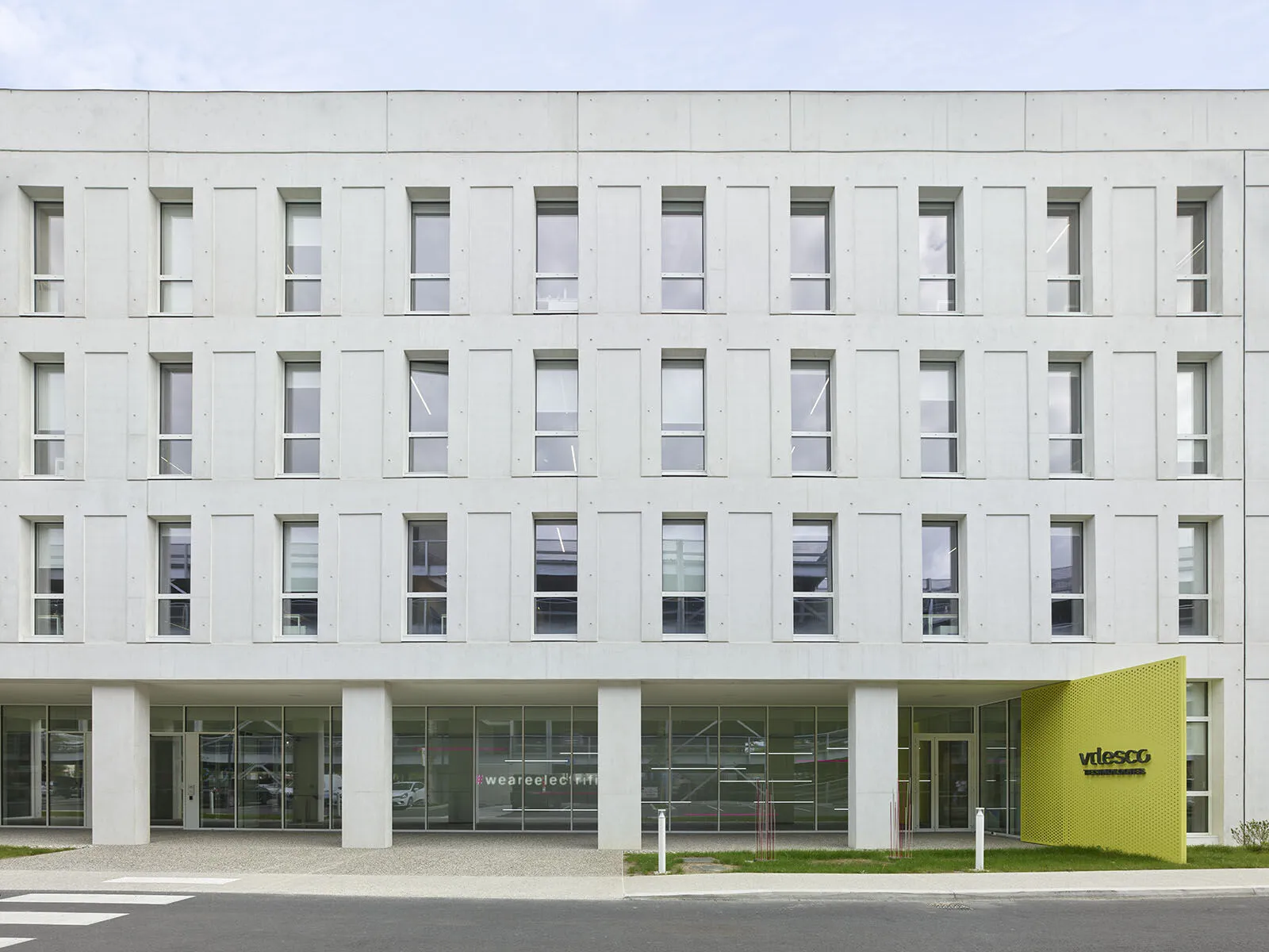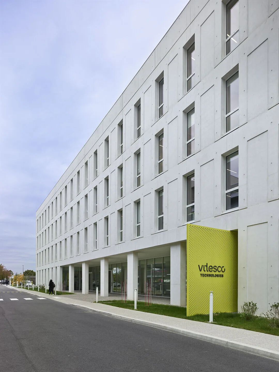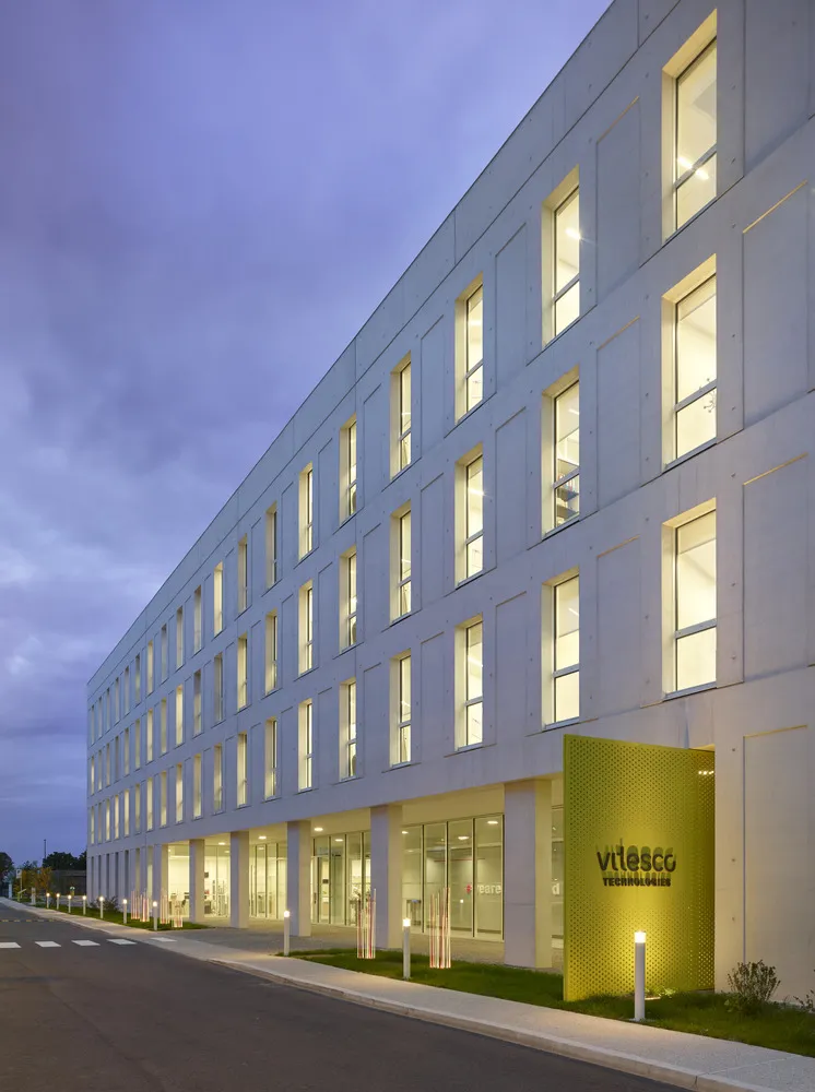 The architecture is rational – reflecting the image of the company Vitesco – and through its use of concrete and white aluminum, it confers on the project an elegant and timeless image.