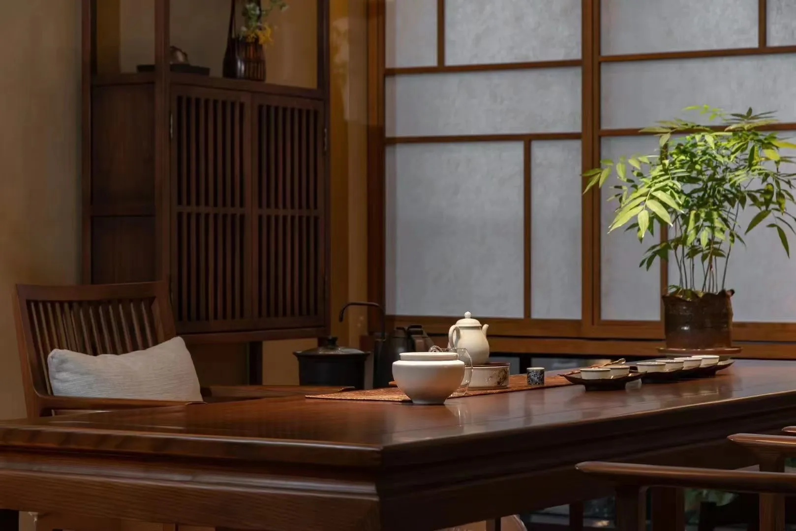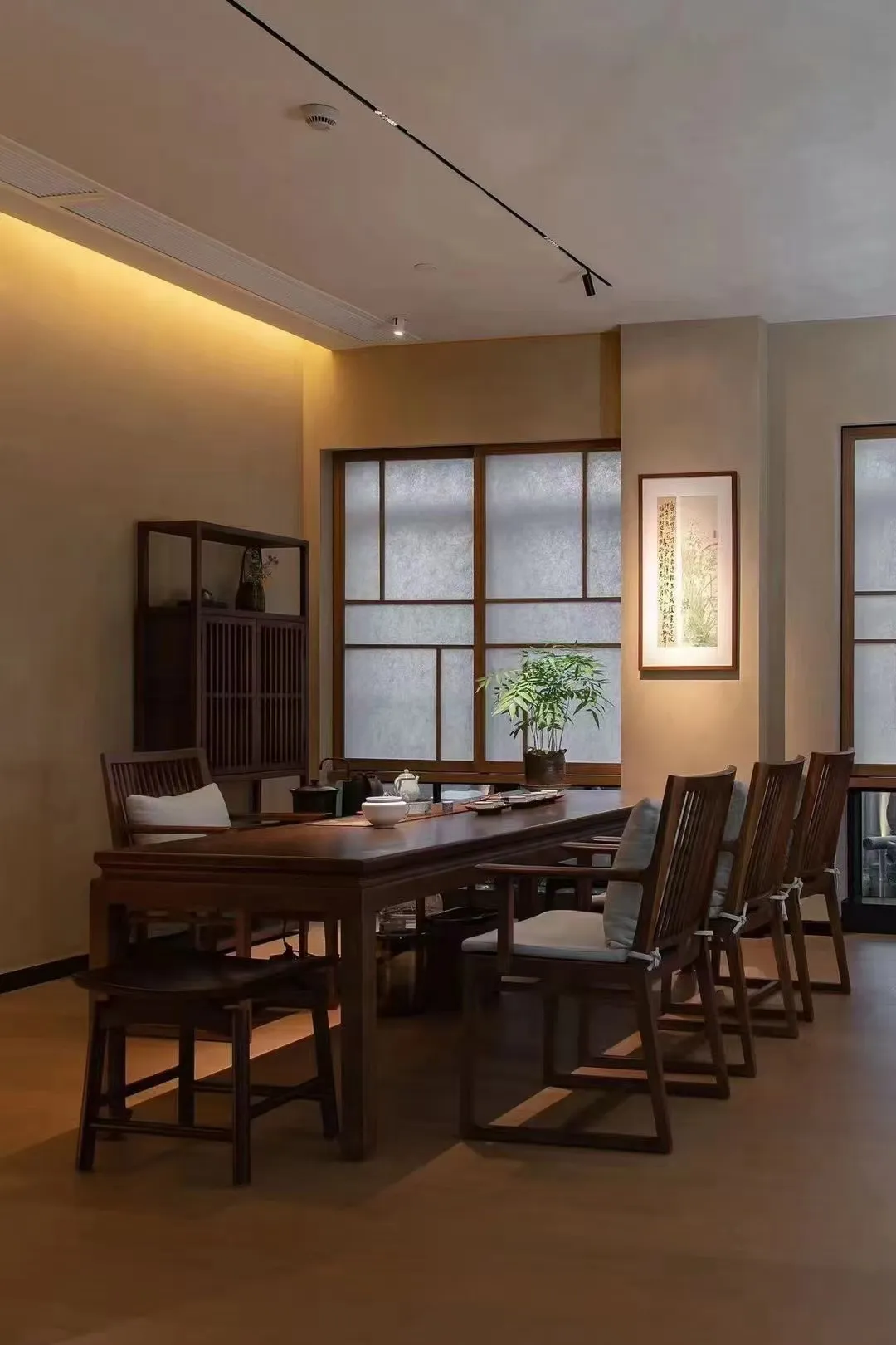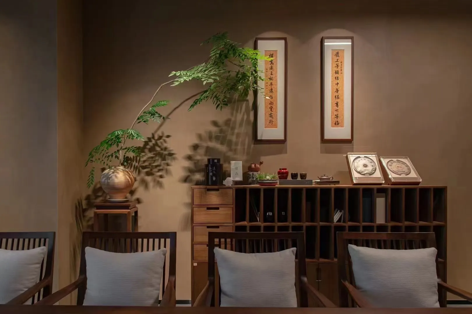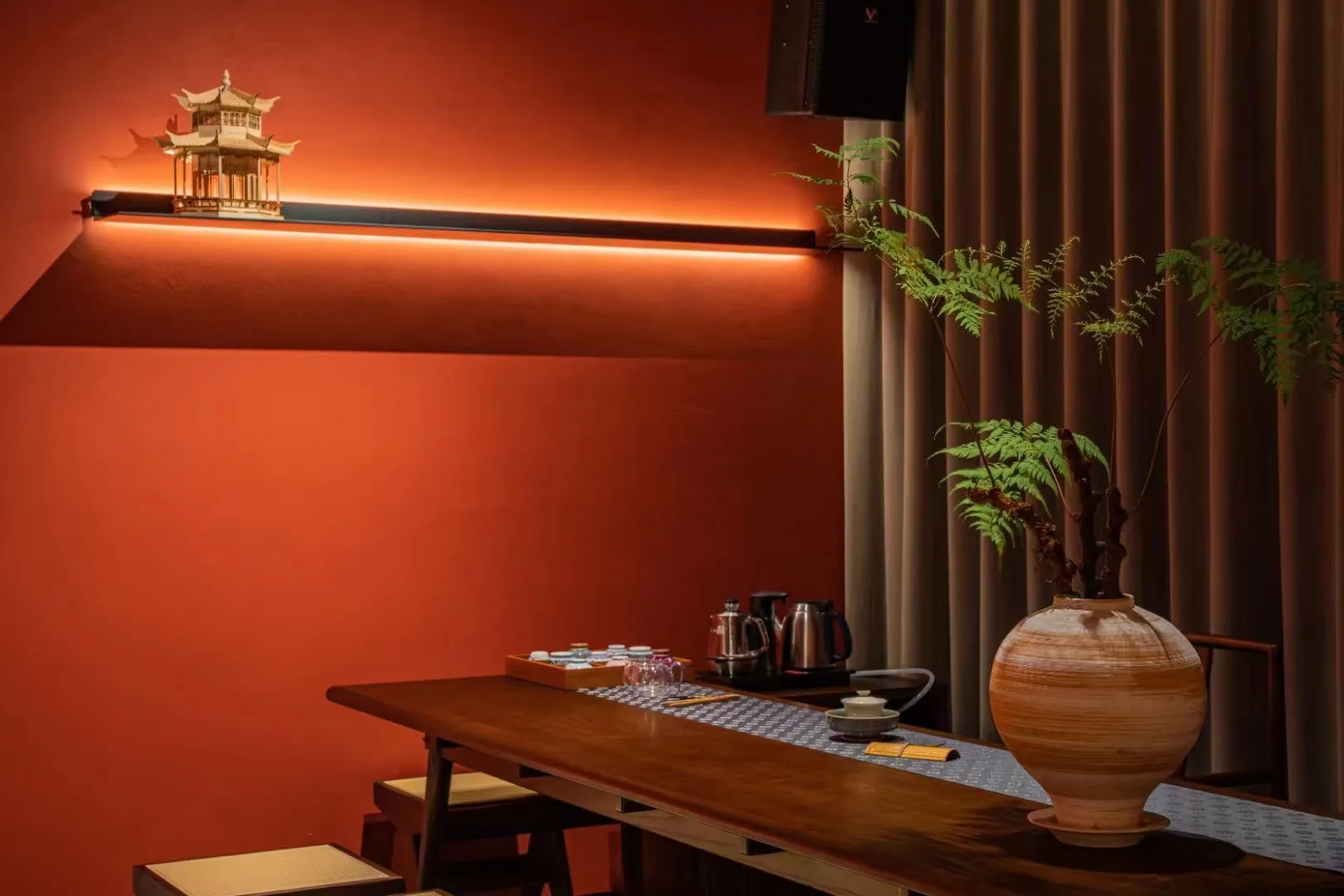 The project is an integrated experiential space that combines a Moutai exhibition, a tea room, and dining, covering an area of about 1,800 square meters. Various functional areas inside are adorned with numerous small landscapes, and lighting is used to create a play of light and shadow, achieving an effect where shadows also become part of the scenery. Overall, it presents a traditional Chinese atmosphere with an antique charm.