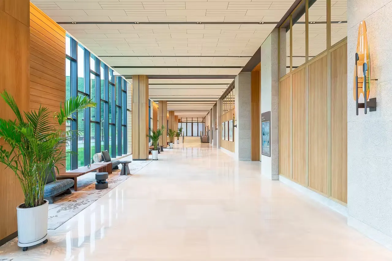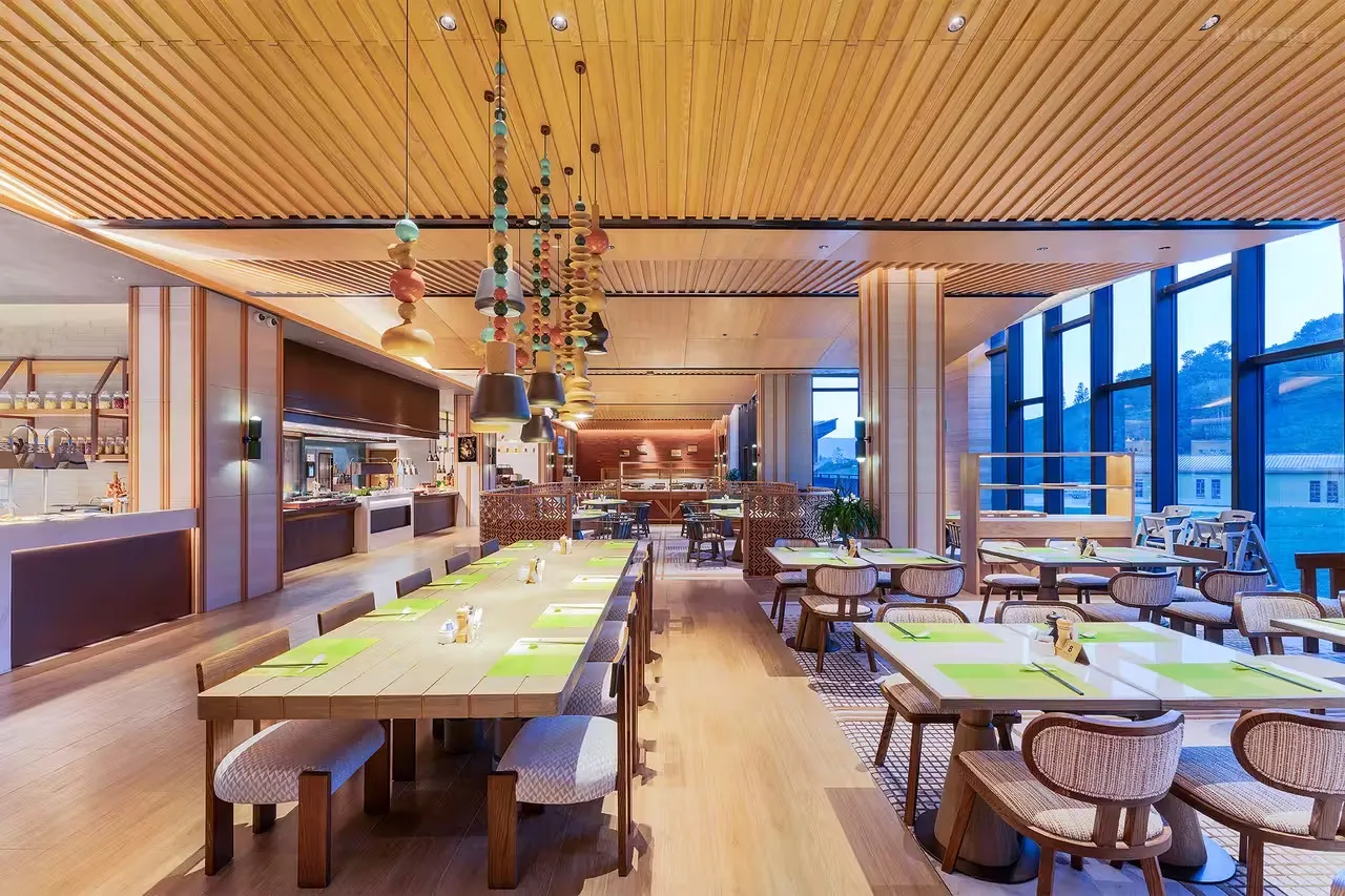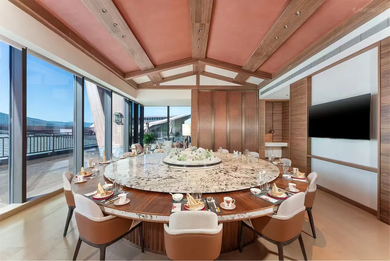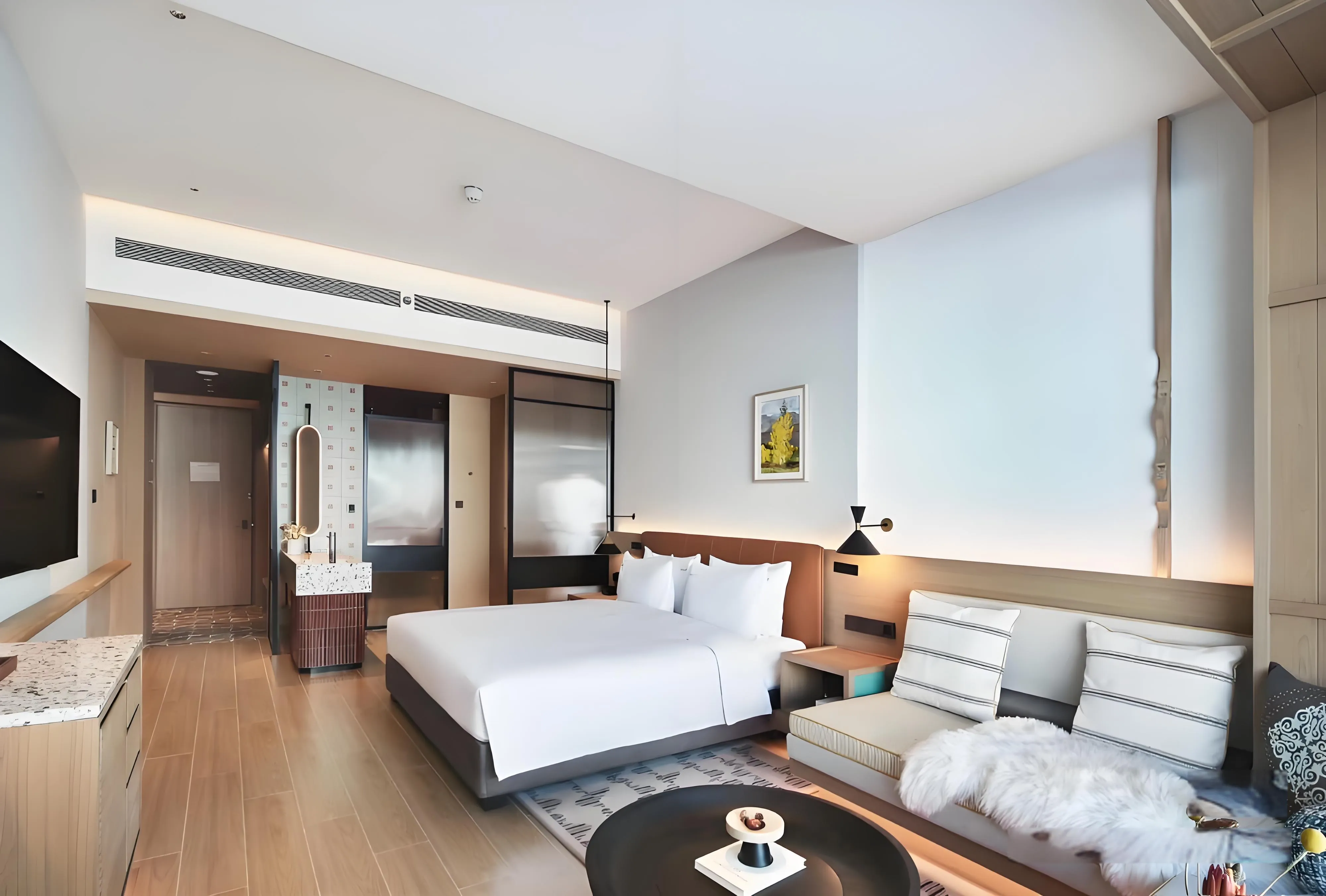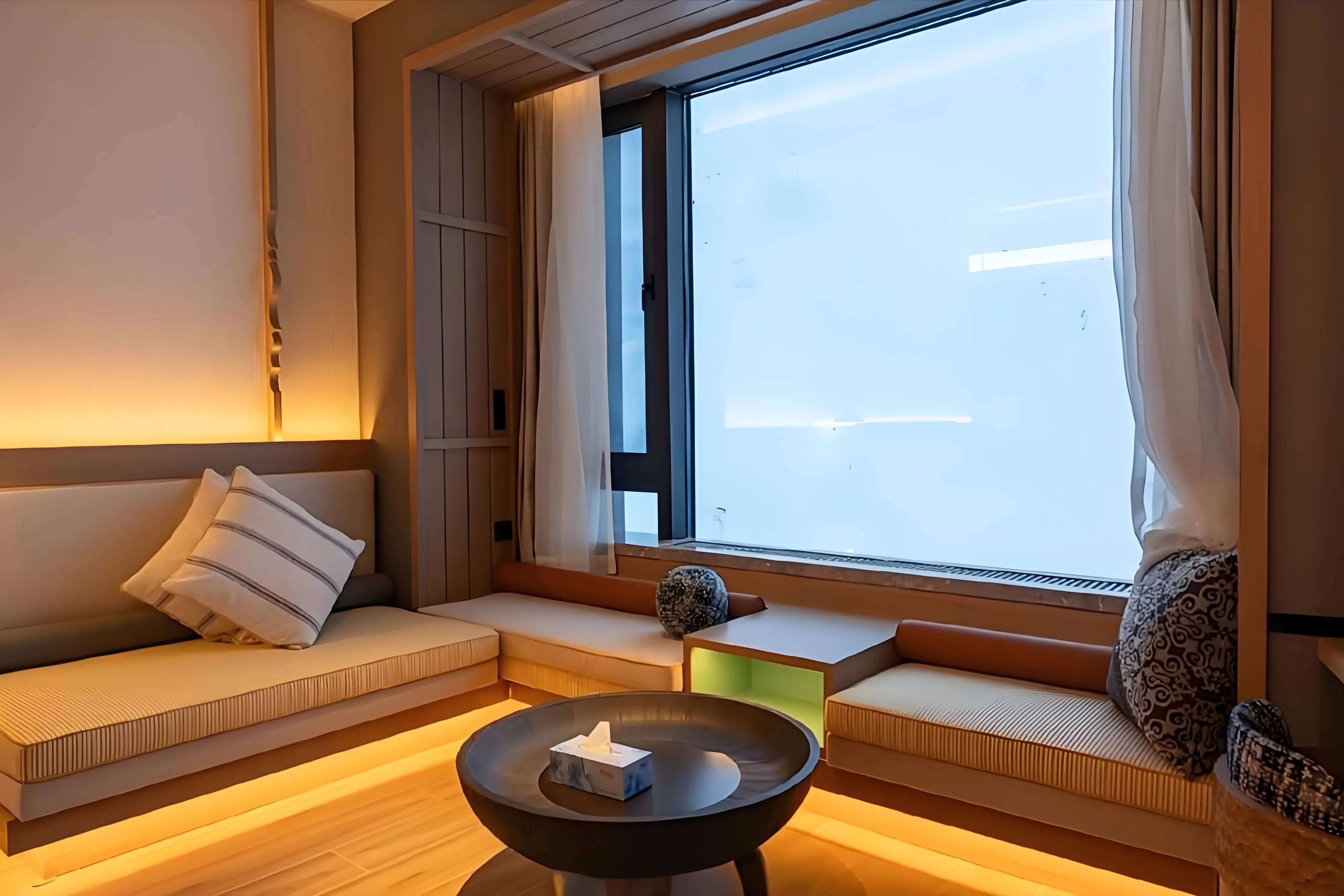 The decor combines traditional Hemu wooden house elements with modern design, allowing guests to enjoy the convenience and comfort of smart home technology within the rooms. The appropriate temperature and high floor-to-ceiling windows provide stunning views of the natural scenery.