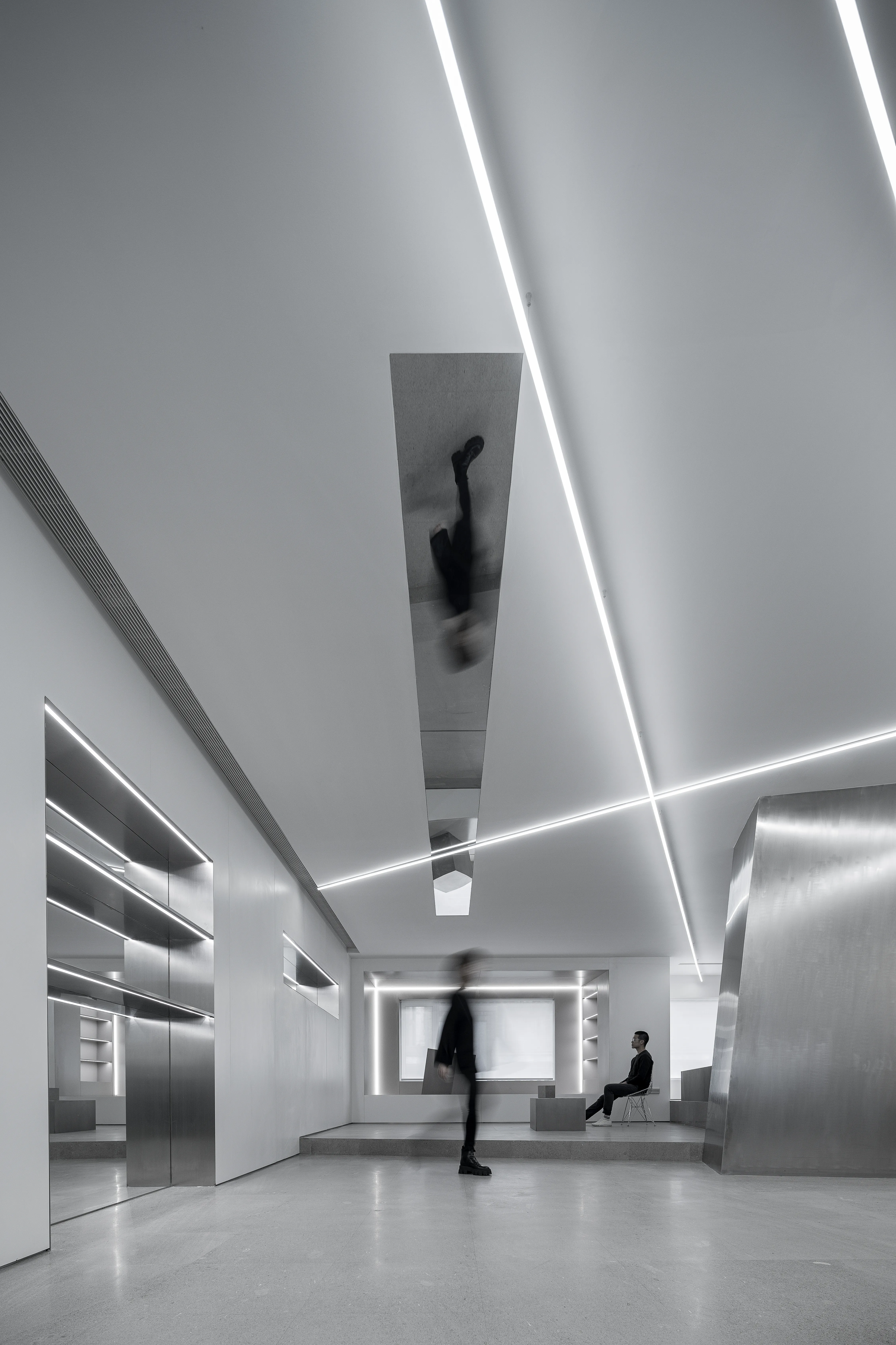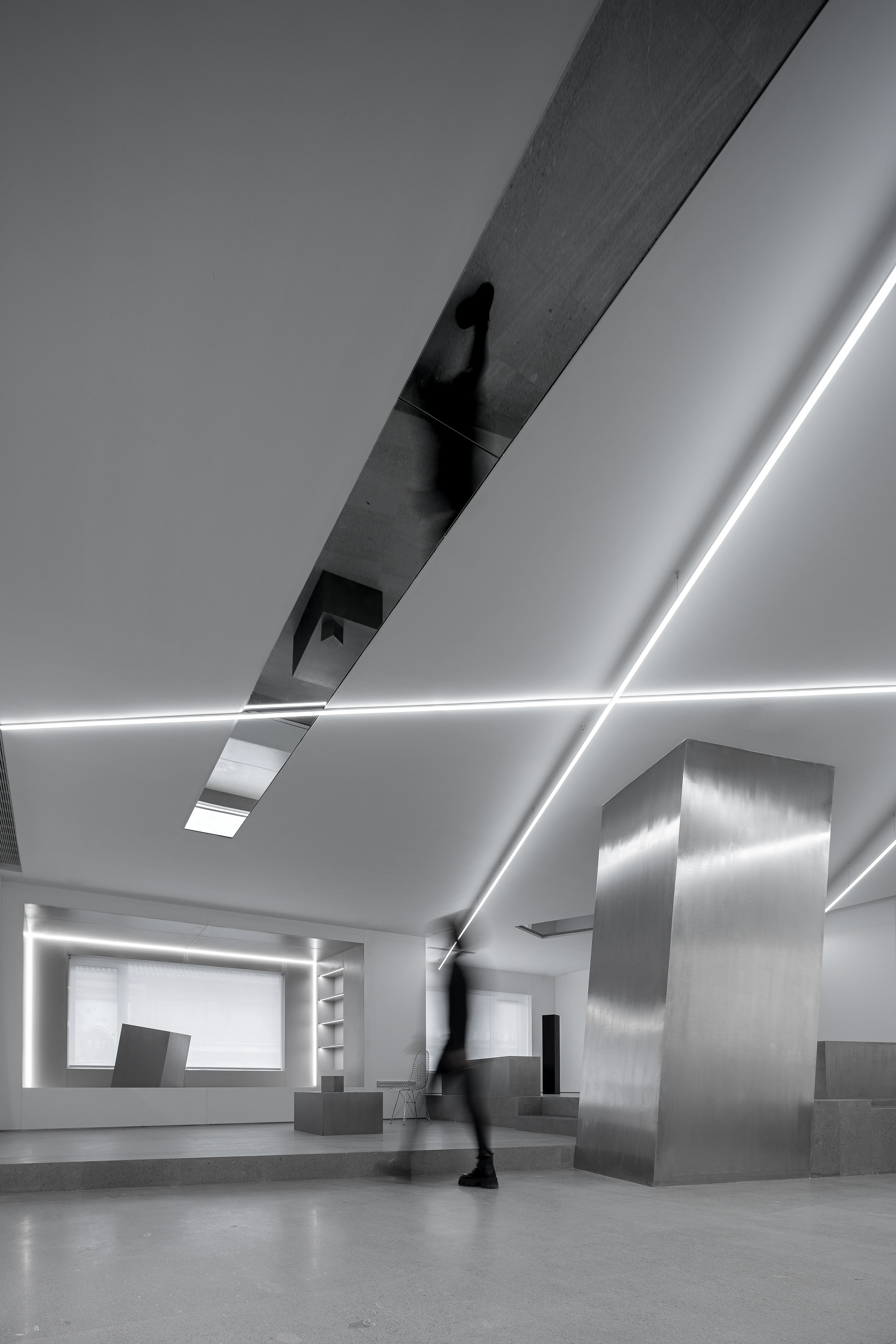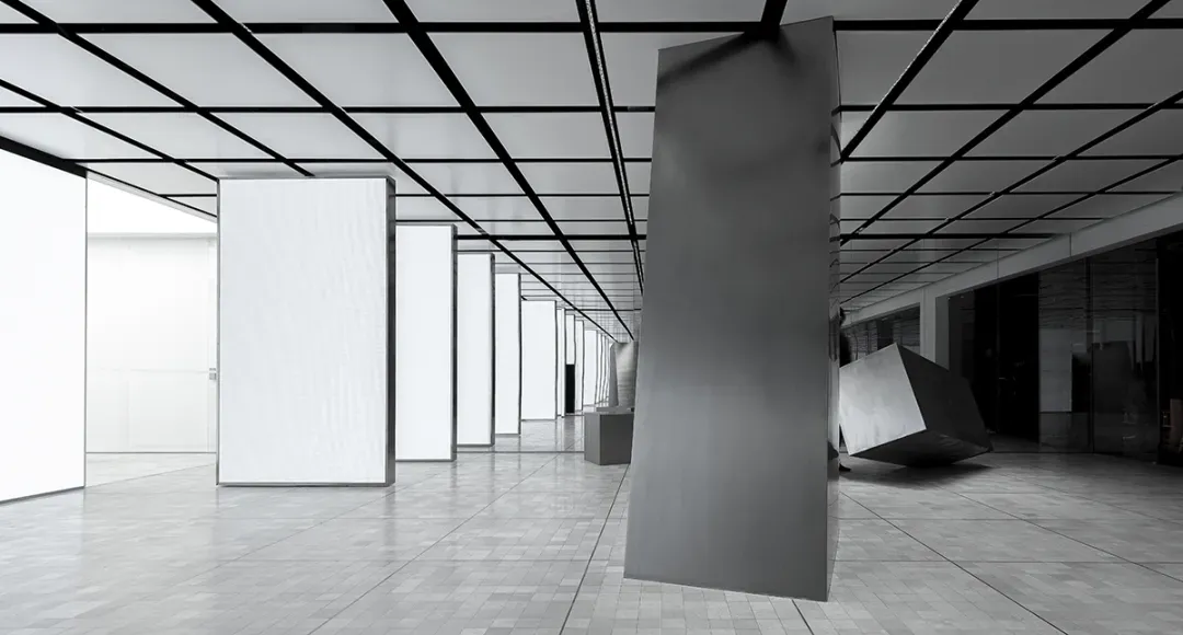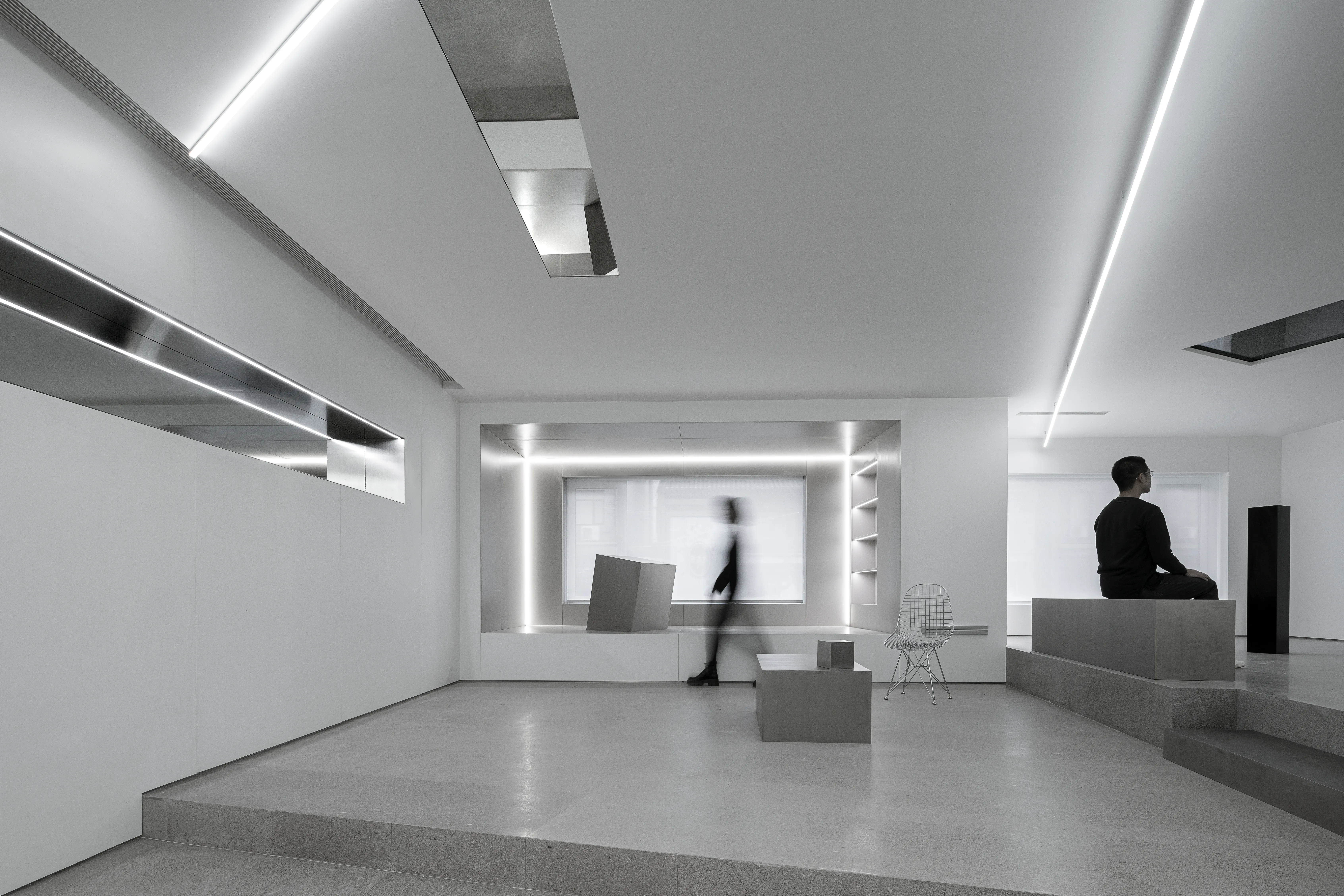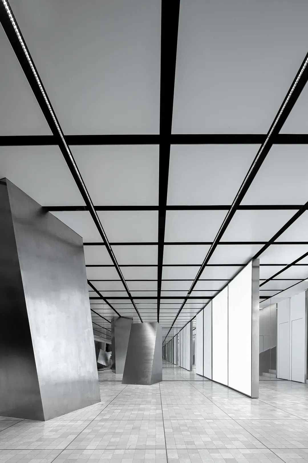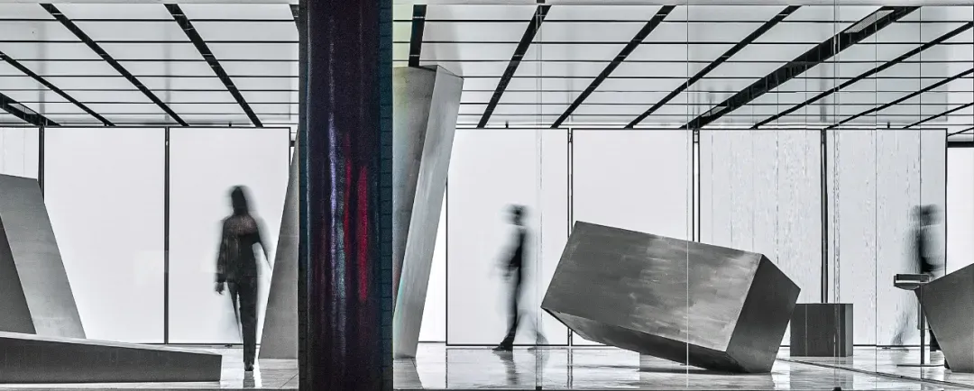 The east and west walls are glass, creating a visually infinite horizontal extension and a powerful spatial experience. The materials are extremely simple, devoid of subjective color, consisting entirely of white steel-like volumes. A seemingly disordered, floating illusion generates a technological aesthetic.