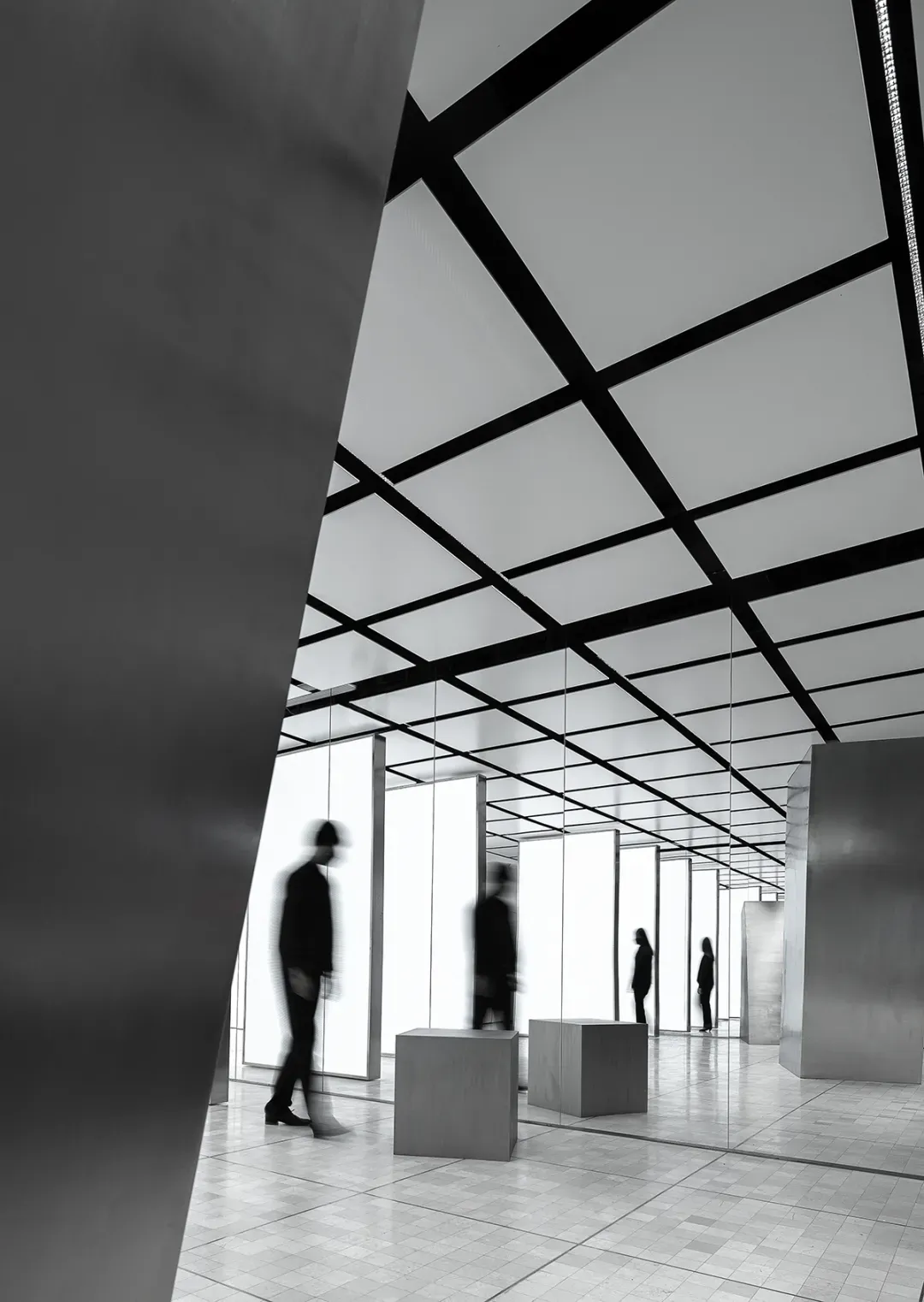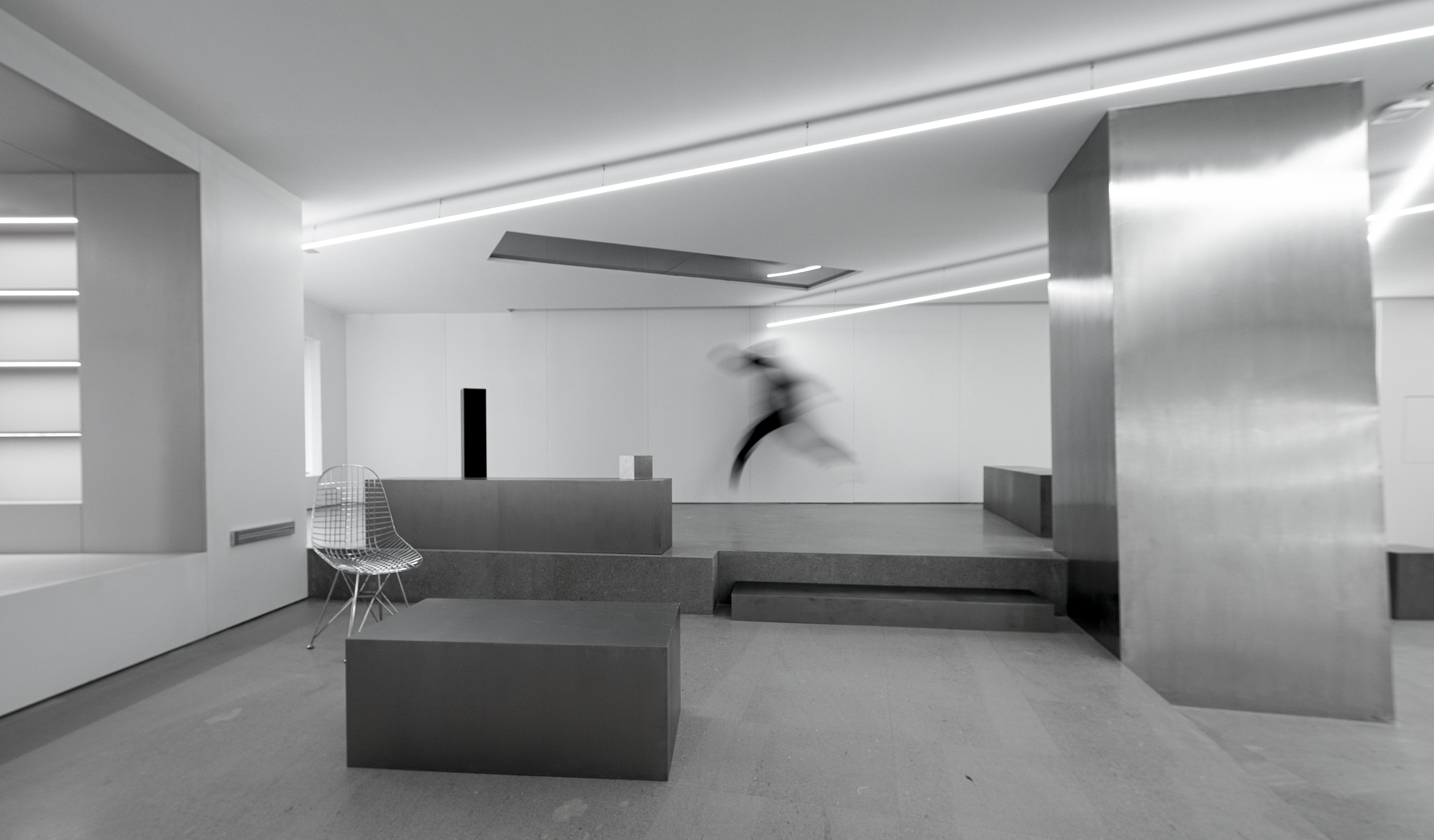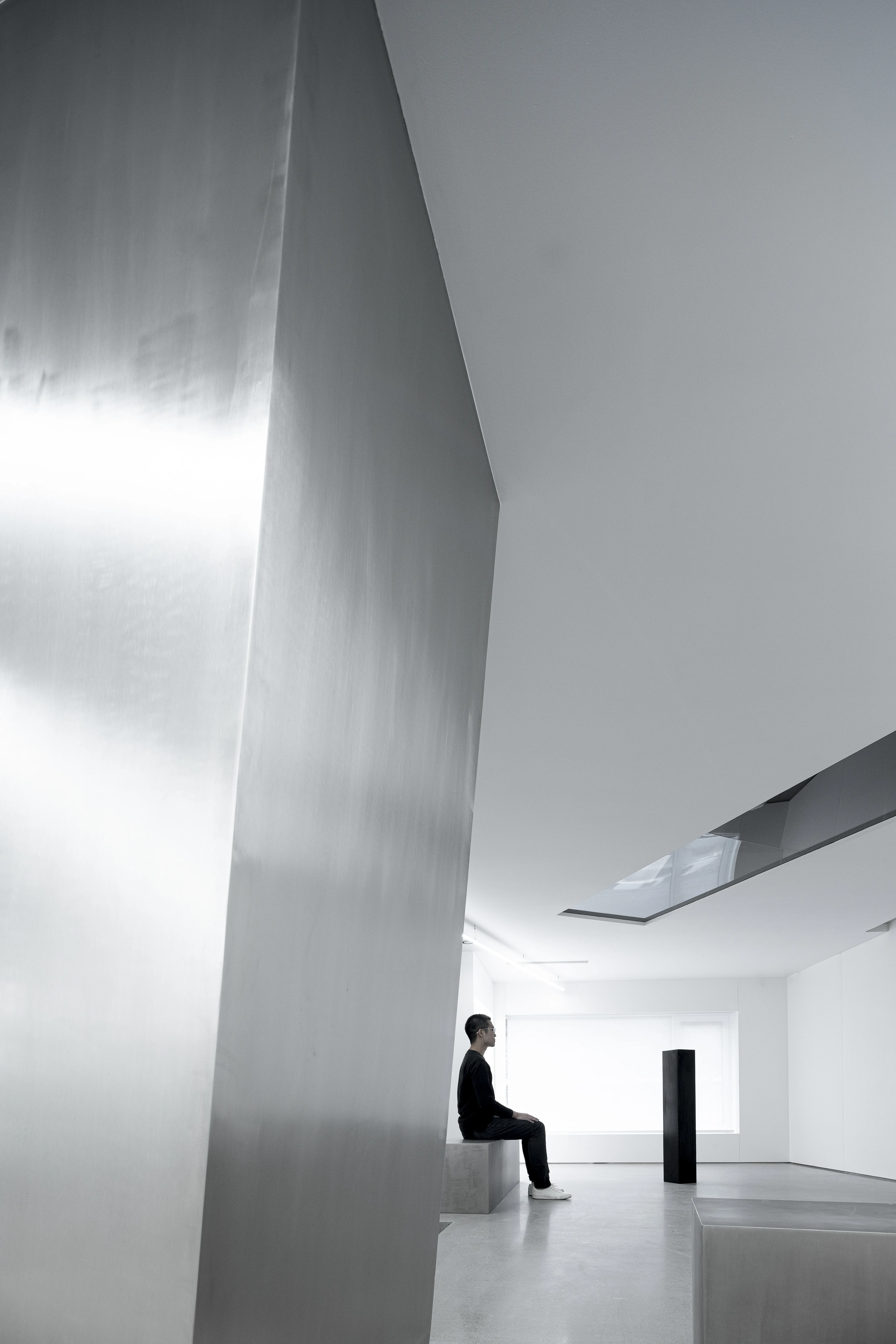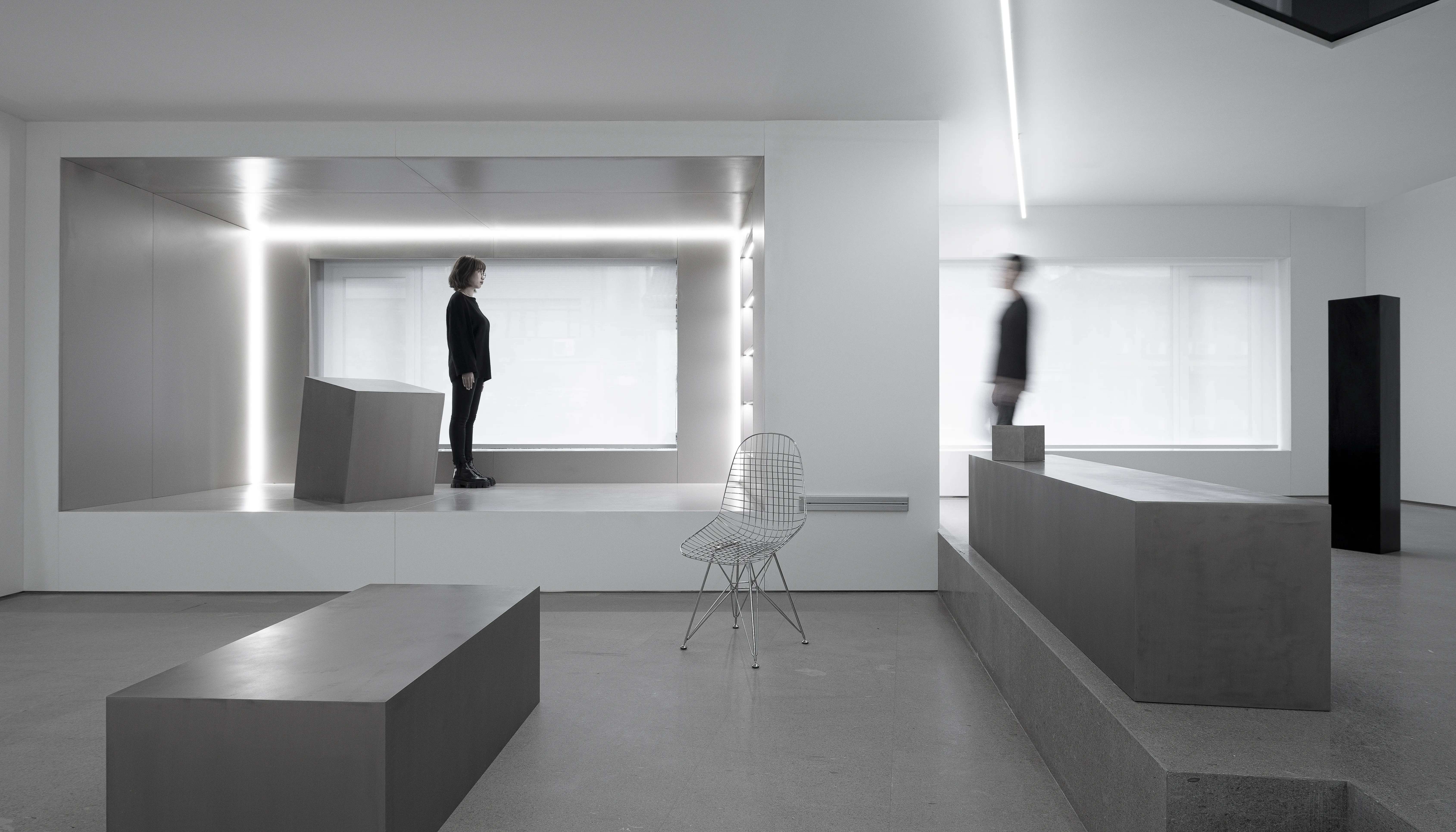 The east and west walls are glass, creating a visually infinite horizontal extension and a powerful spatial experience. The materials are extremely simple, devoid of subjective color, consisting entirely of white steel-like volumes. A seemingly disordered, floating illusion generates a technological aesthetic.
