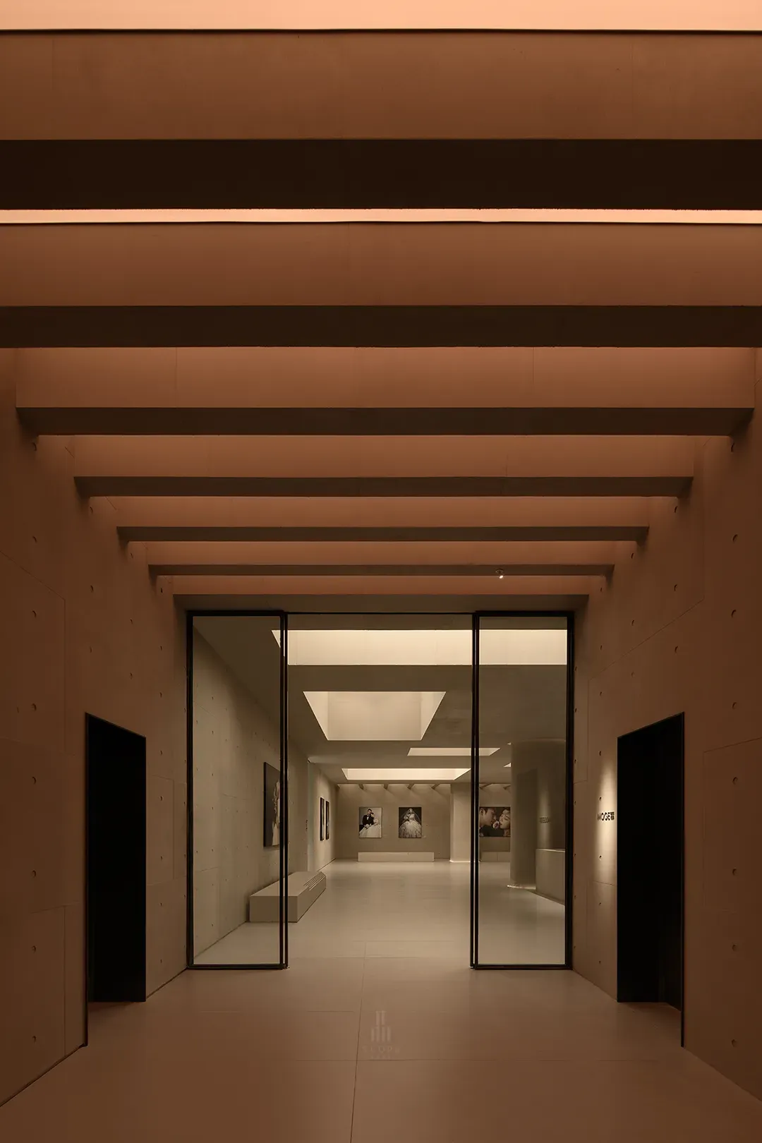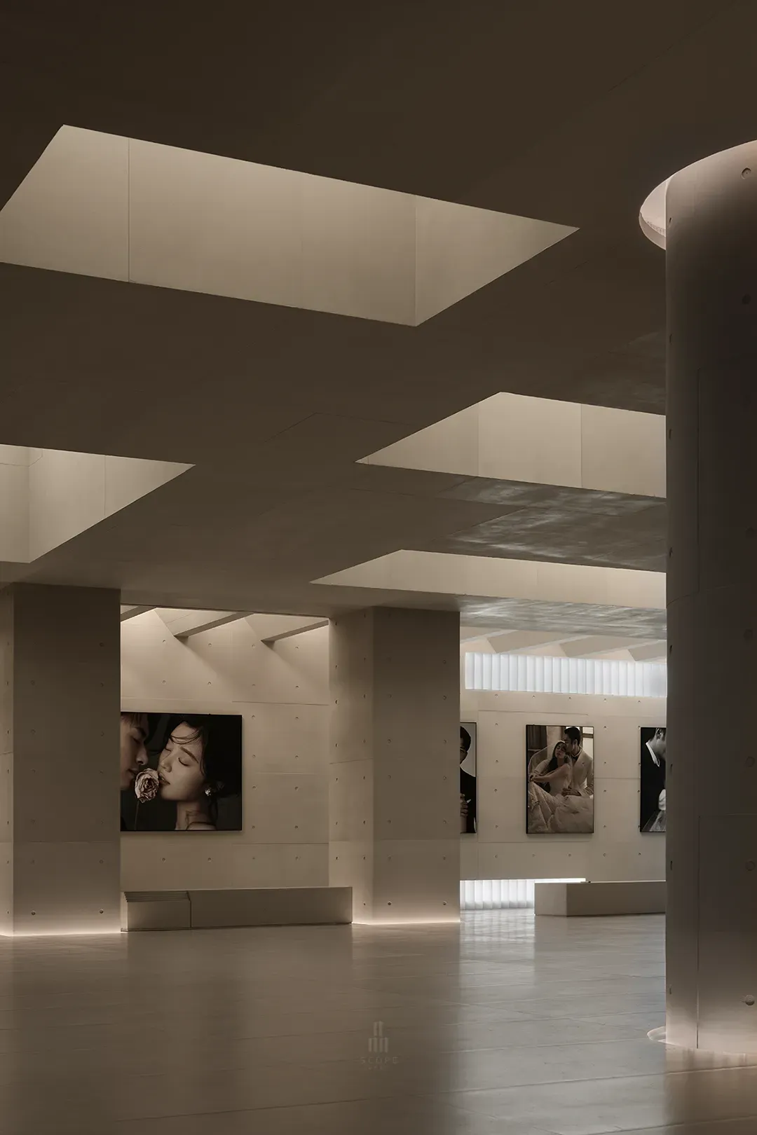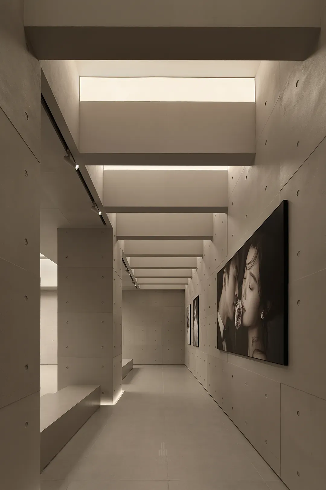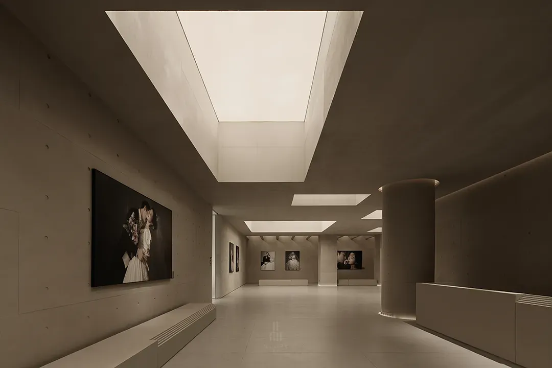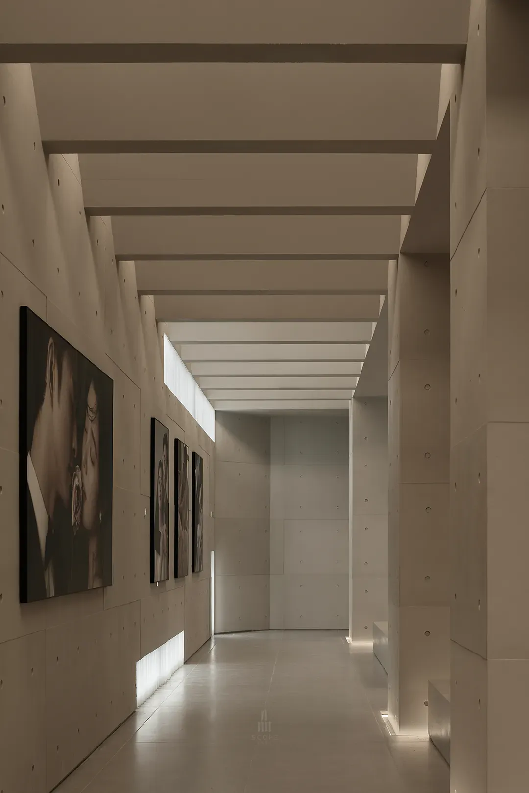 MOGE Photography is located in Zhengzhou City, Henan Province, in the heart of the city - Chamber of Commerce Building 4F, with a volume of 8000m to build the brand's first culture and art complex. A divine and loving building, it is never a place for trading, but a “space for dialog”. The designers utilized the original structure to reflect the essence of beauty, adopting the form of array sequencing, cutting the light with the wall, and each beam of light guides the visitor's gaze.