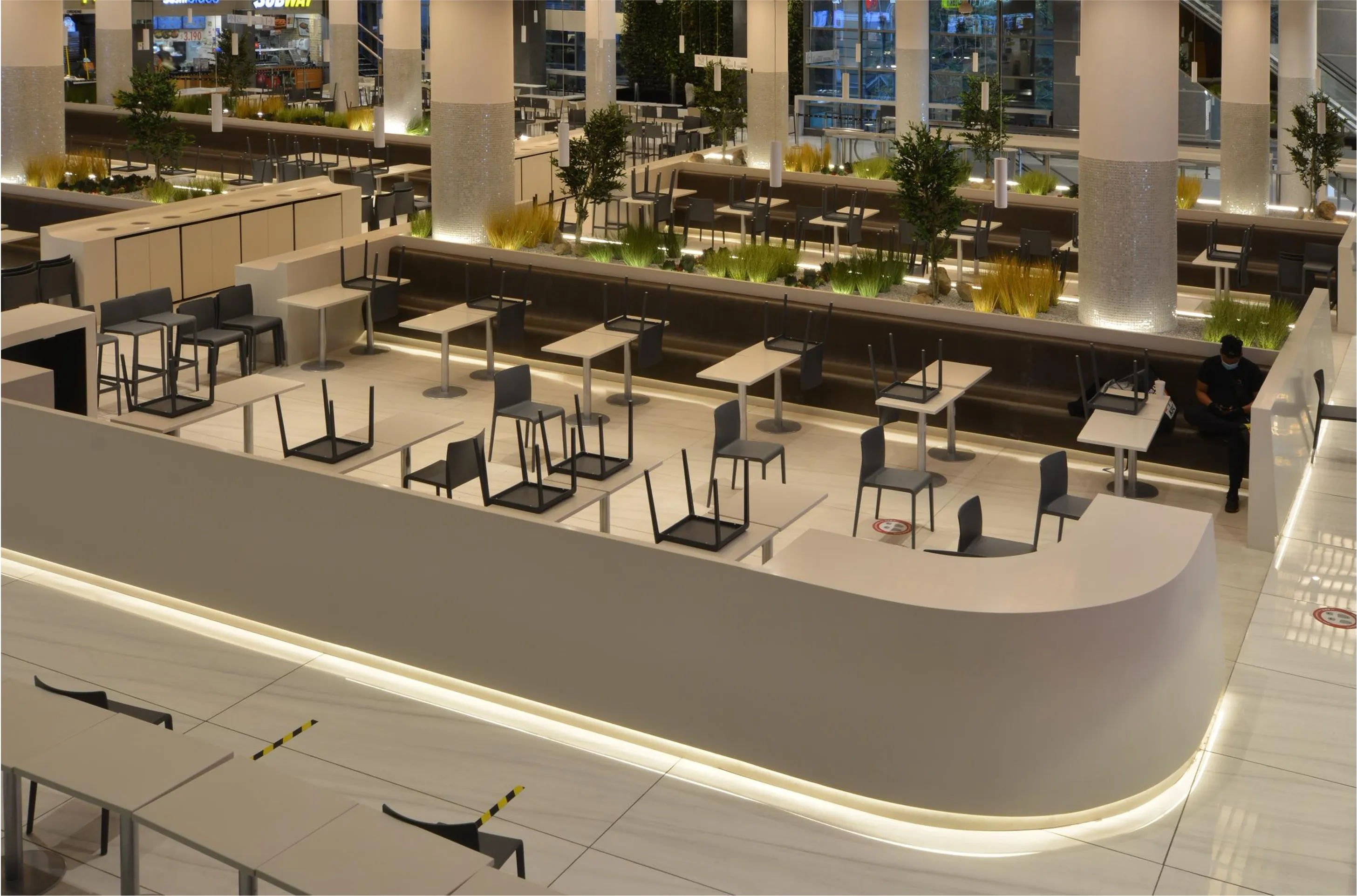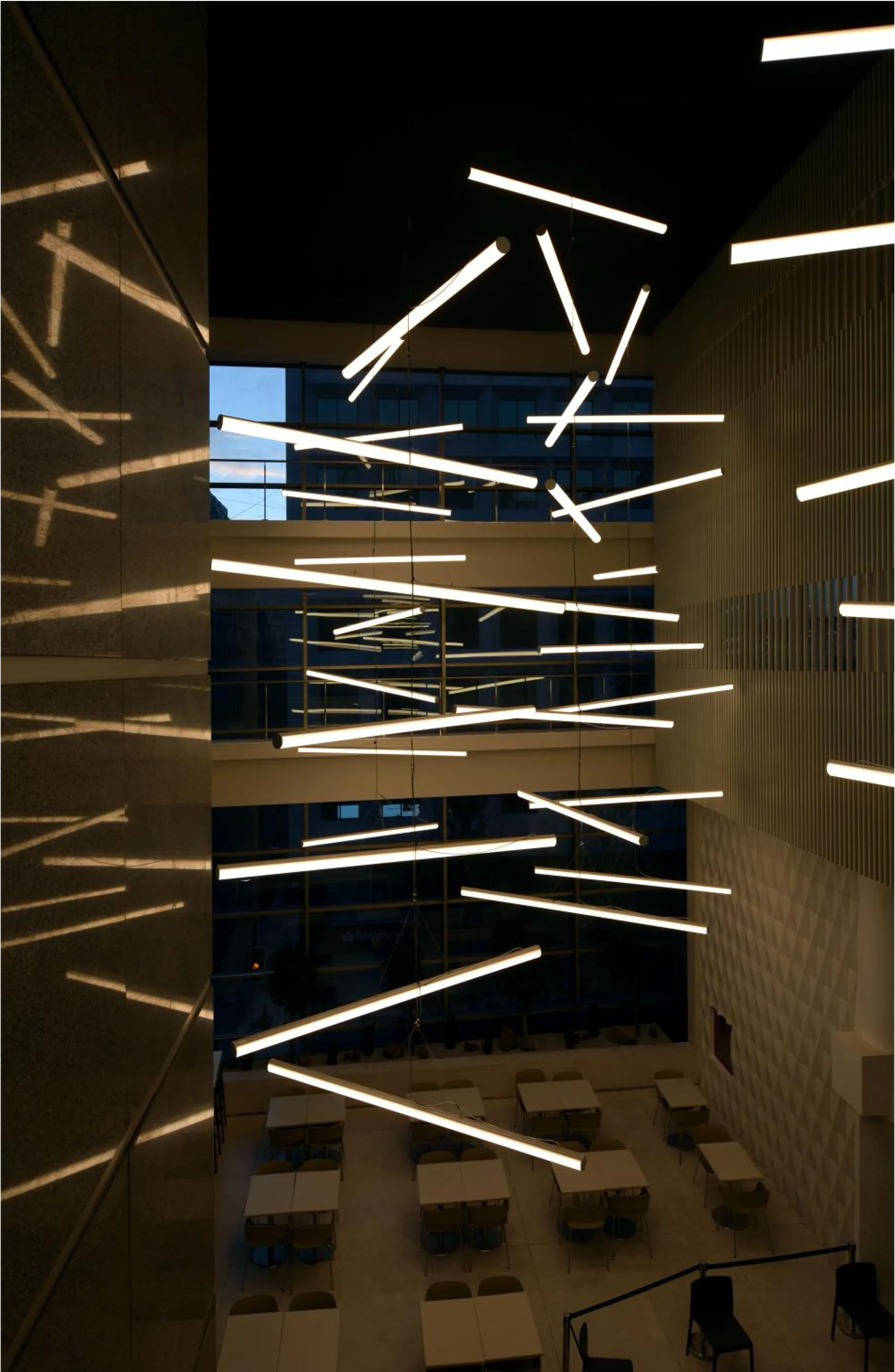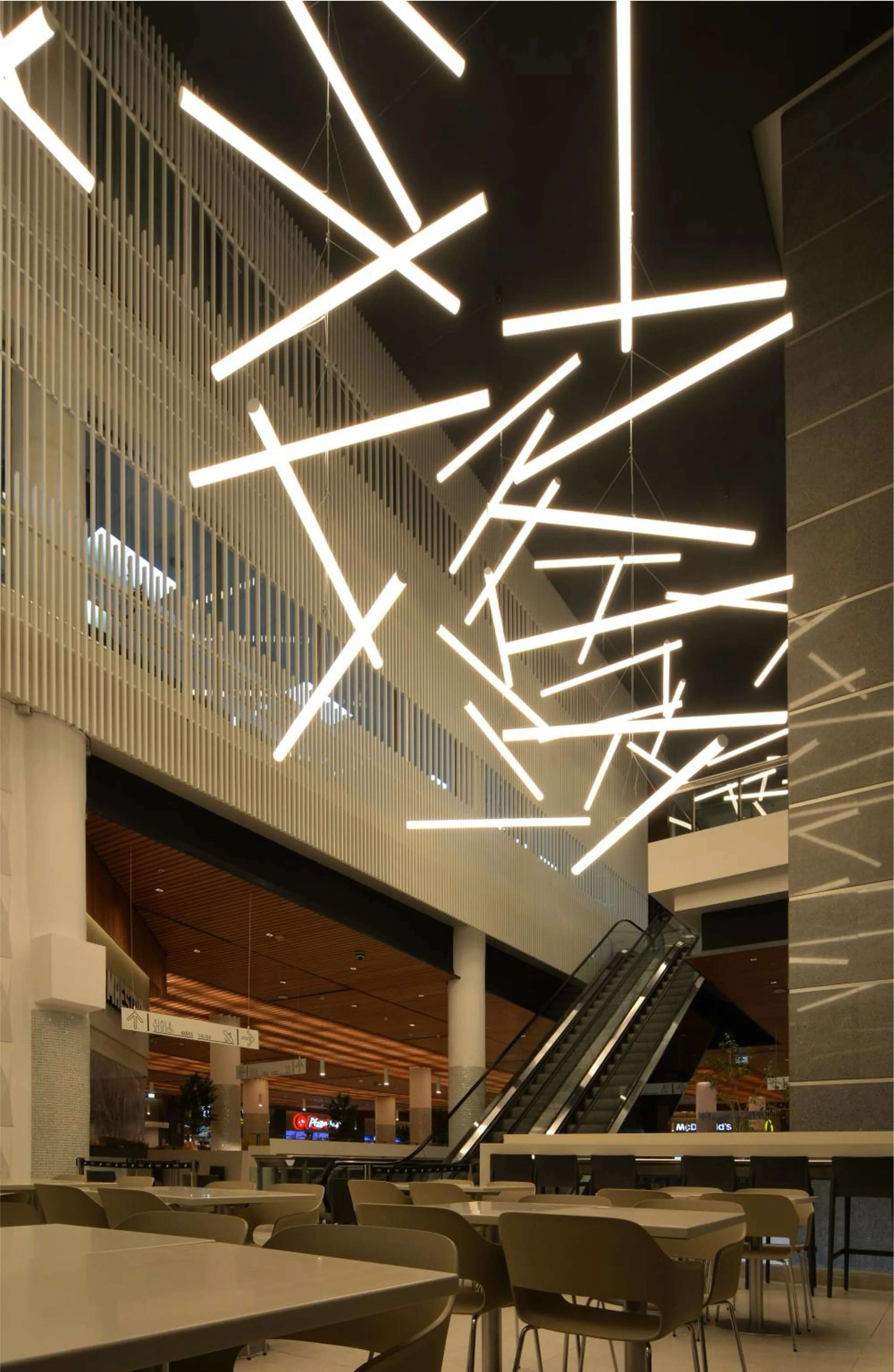 In the access hall of an important commercial MALL in Santiago, Chile, the architect has created a layered, free-flying LED light tube installation using the COLORS products LT60 and LT 40. This design adds a dynamic and artistic element to the space, enhancing the overall aesthetic and ambiance.