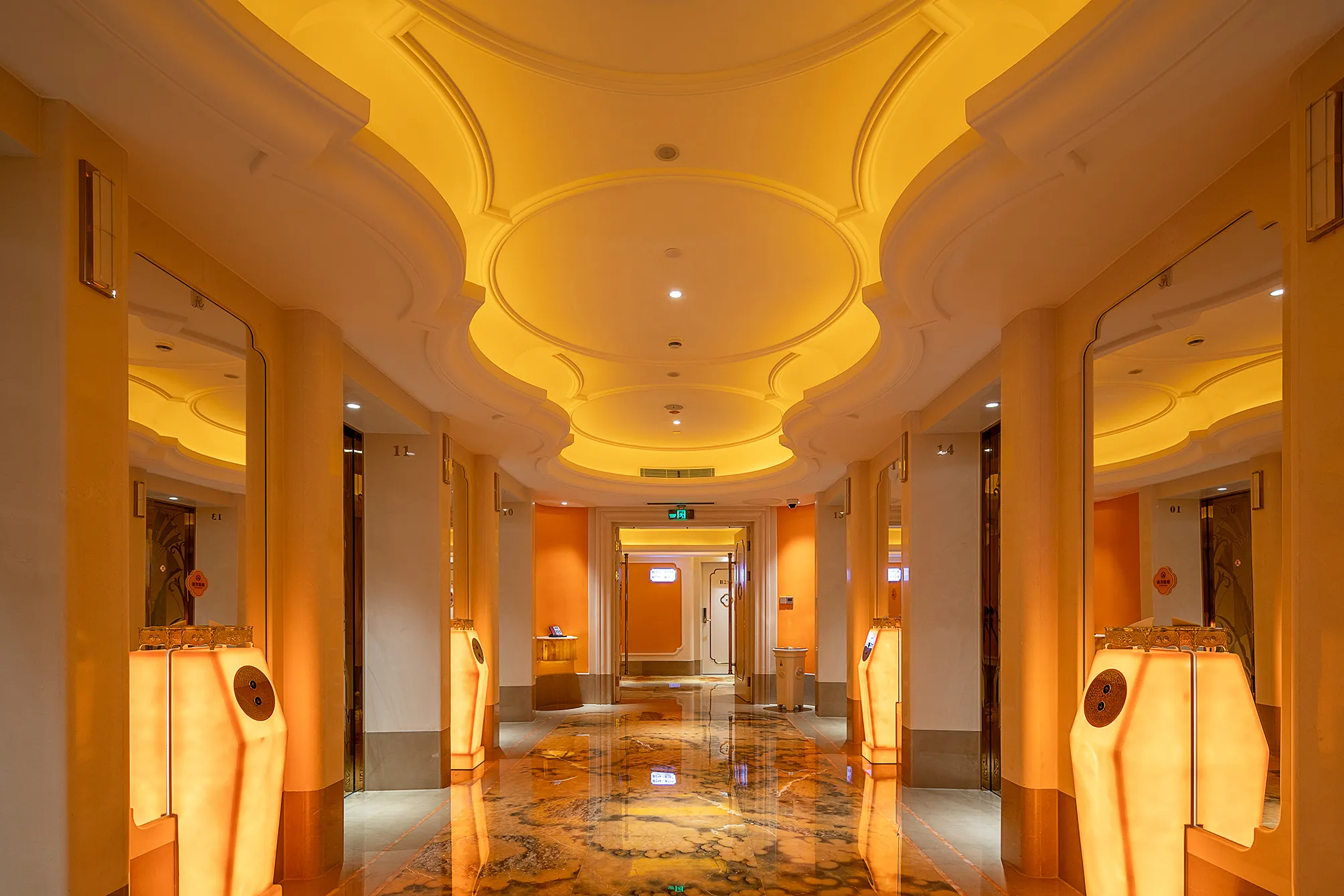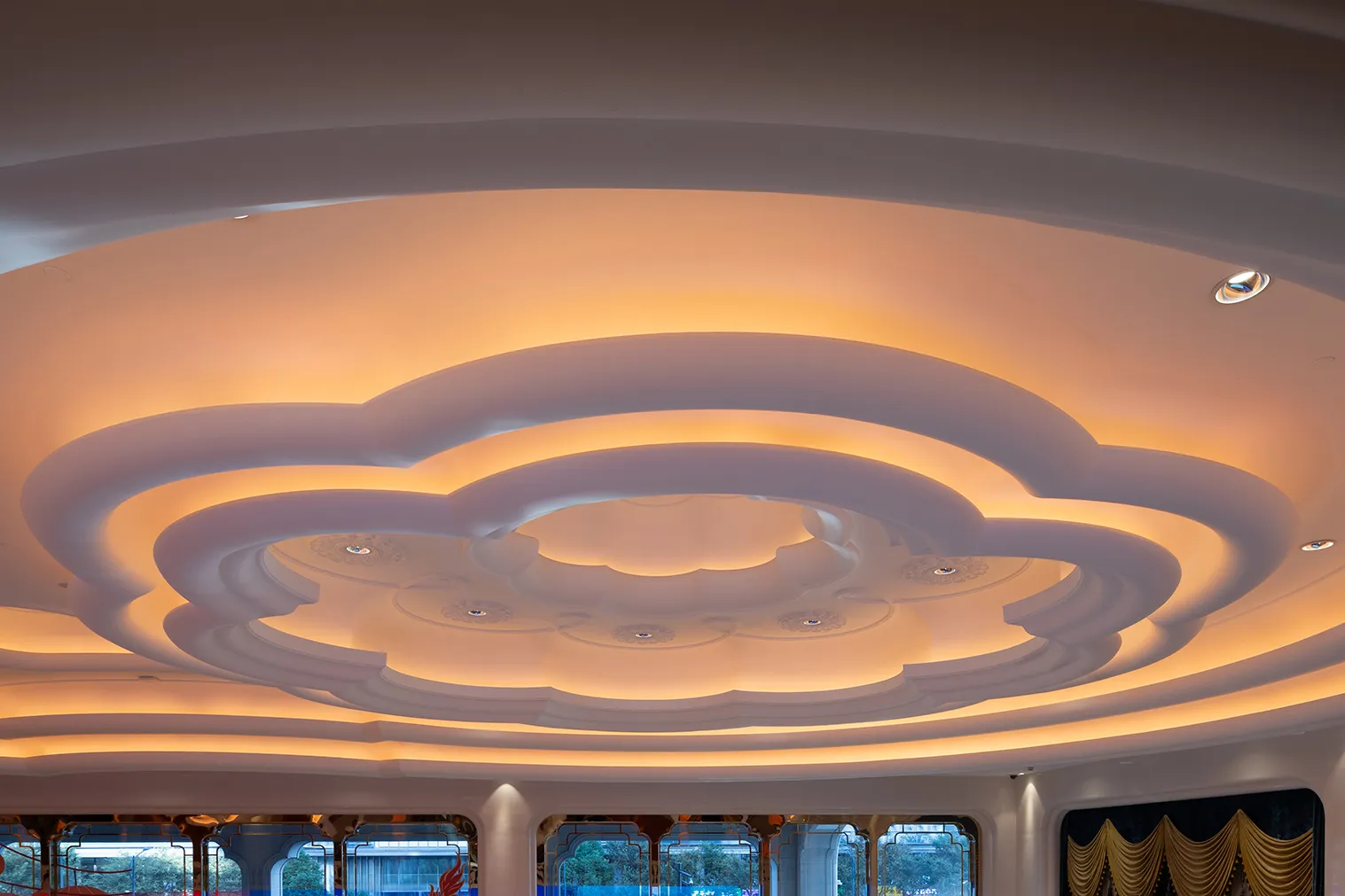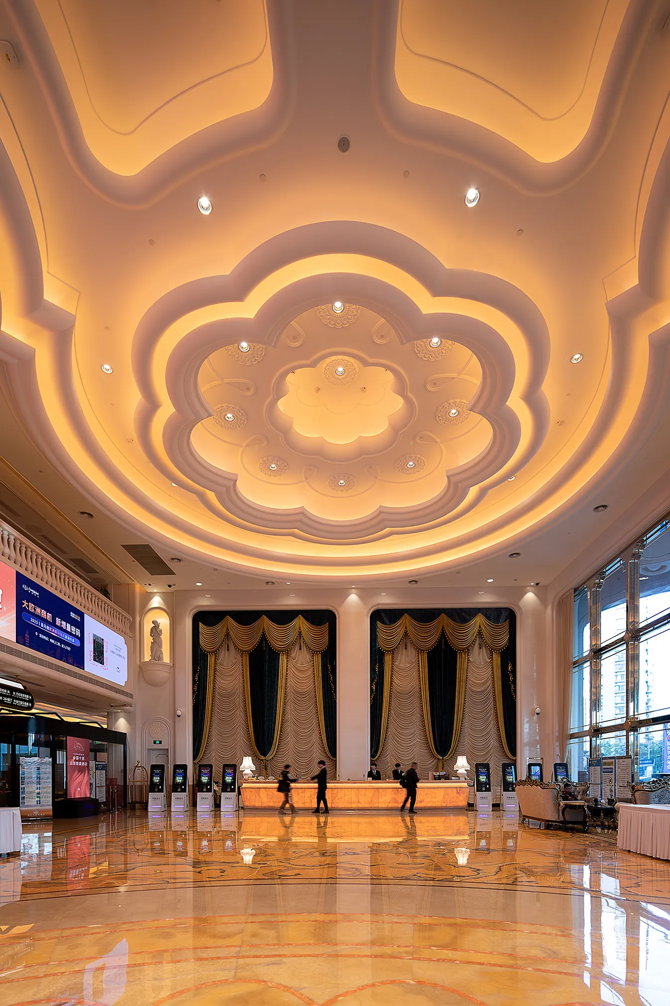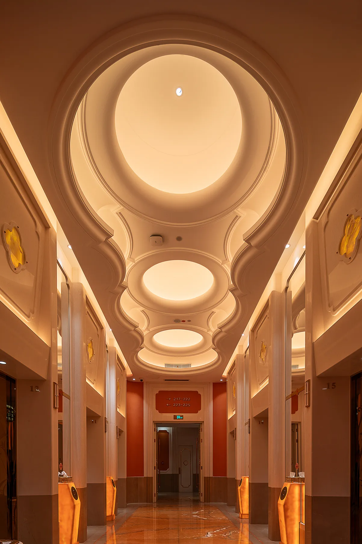 The interior space and lighting design are characterized by distinctive features: the extensive use of gypsum decorative materials for ceiling coves and wall decorations, the magnificent European dome, and the rich and exquisite sculptural patterns. Custom ultra-low color temperature golden light strips and lens wash lights are employed to highlight the spatial structure through indirect lighting. The upward lighting wash showcases the rhythm of the atrium to perfection, creating a luxurious atmosphere that offers warm and comfortable basic lighting while ensuring strong brand recognition.