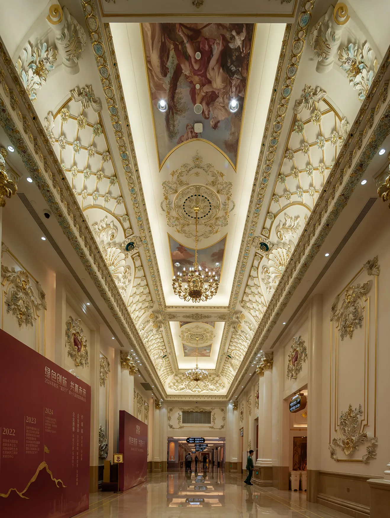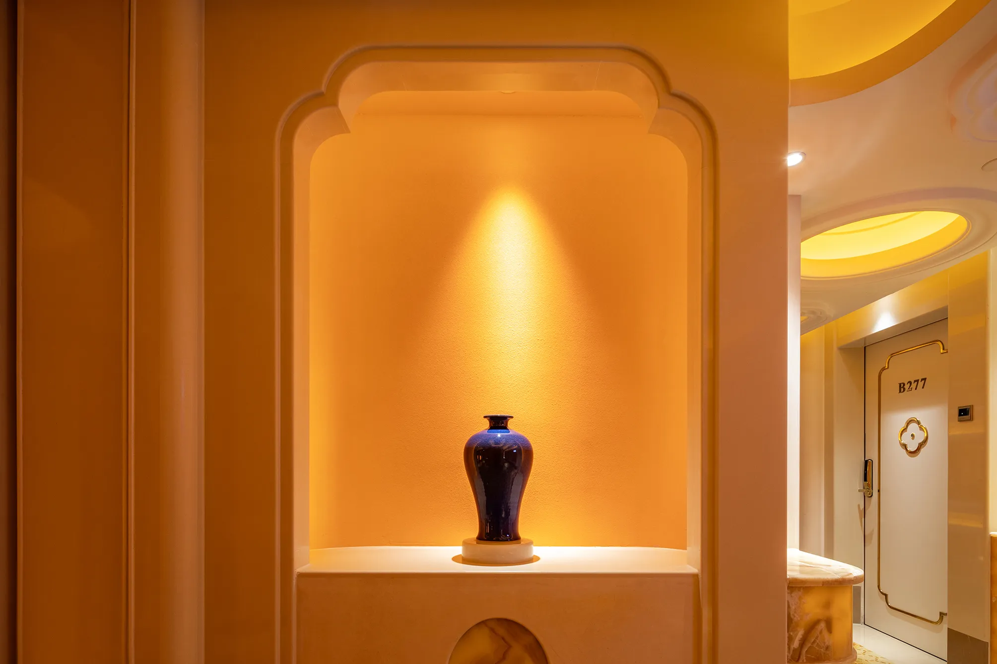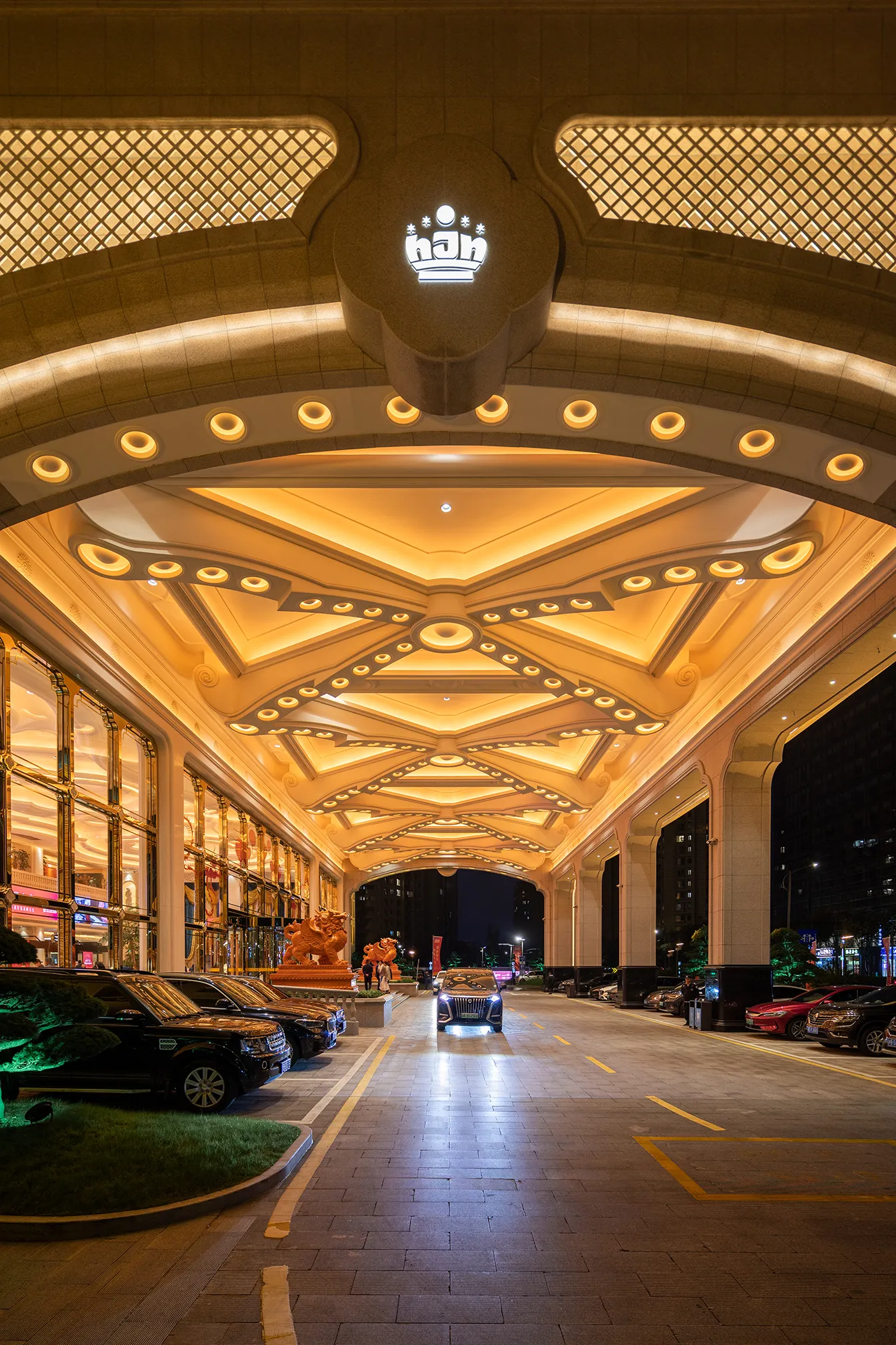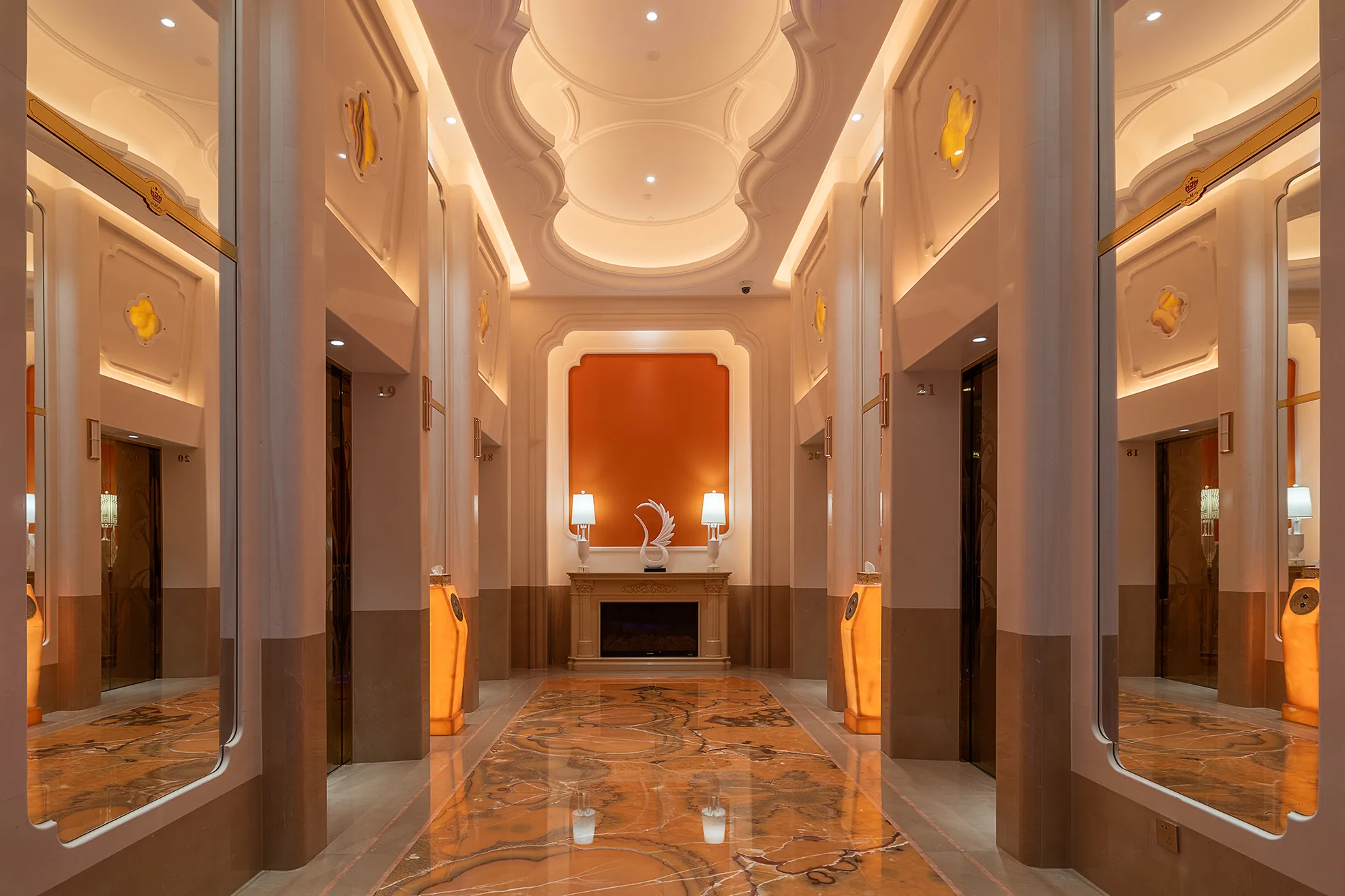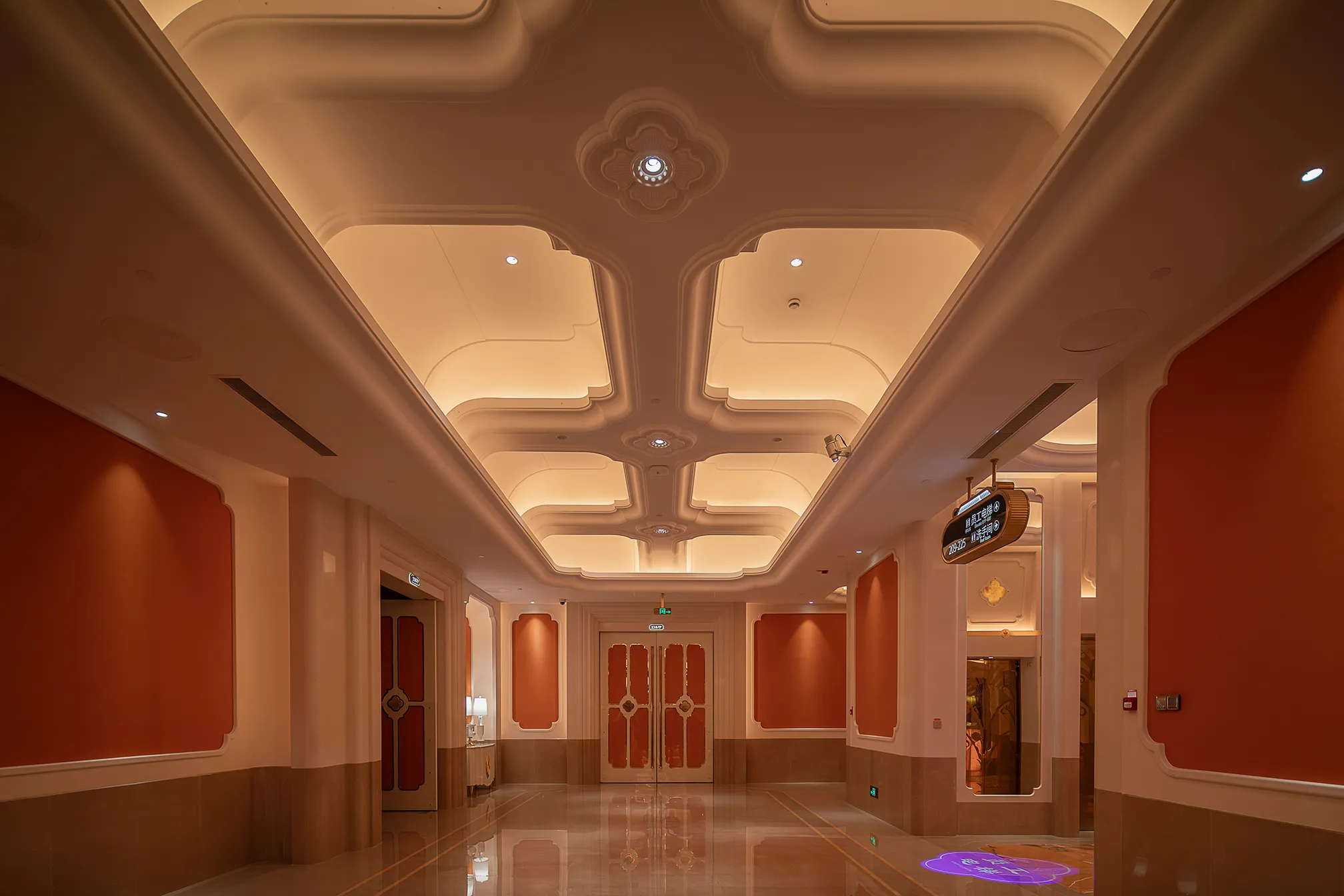 The interior space and lighting design are characterized by distinctive features: the extensive use of gypsum decorative materials for ceiling coves and wall decorations, the magnificent European dome, and the rich and exquisite sculptural patterns. Custom ultra-low color temperature golden light strips and lens wash lights are employed to highlight the spatial structure through indirect lighting. The upward lighting wash showcases the rhythm of the atrium to perfection, creating a luxurious atmosphere that offers warm and comfortable basic lighting while ensuring strong brand recognition.