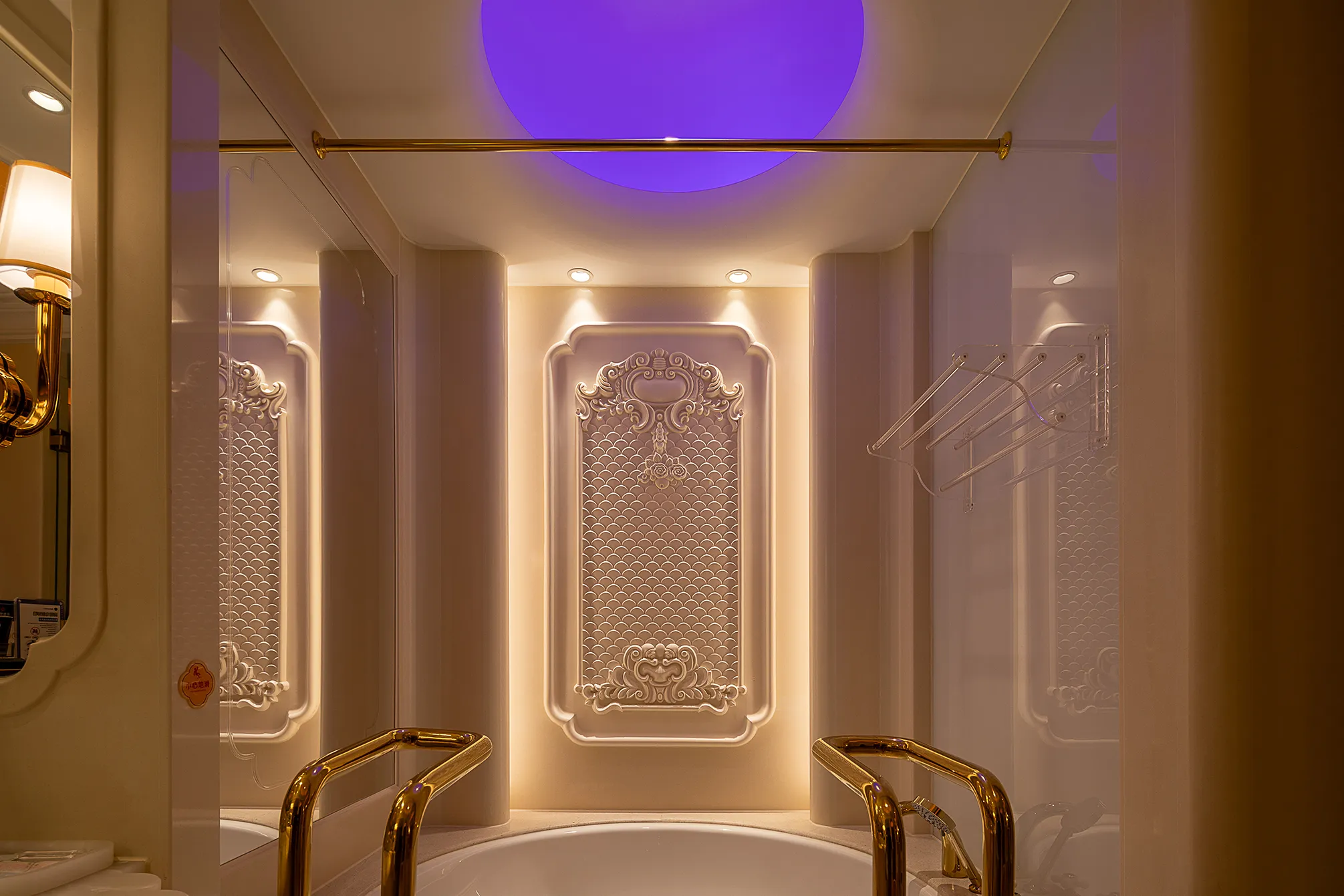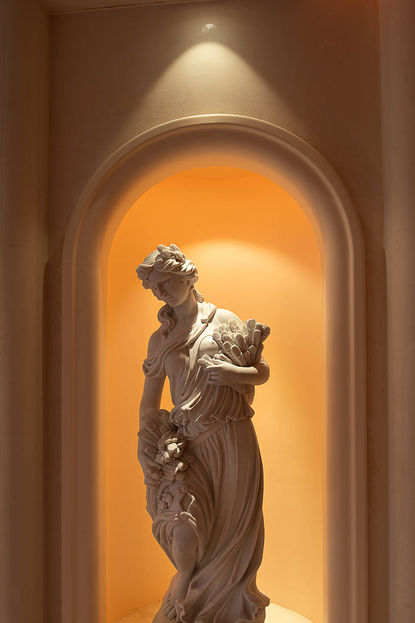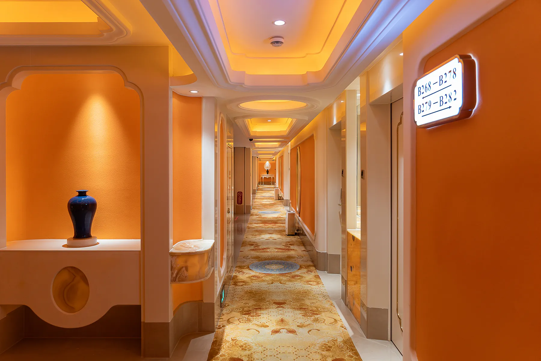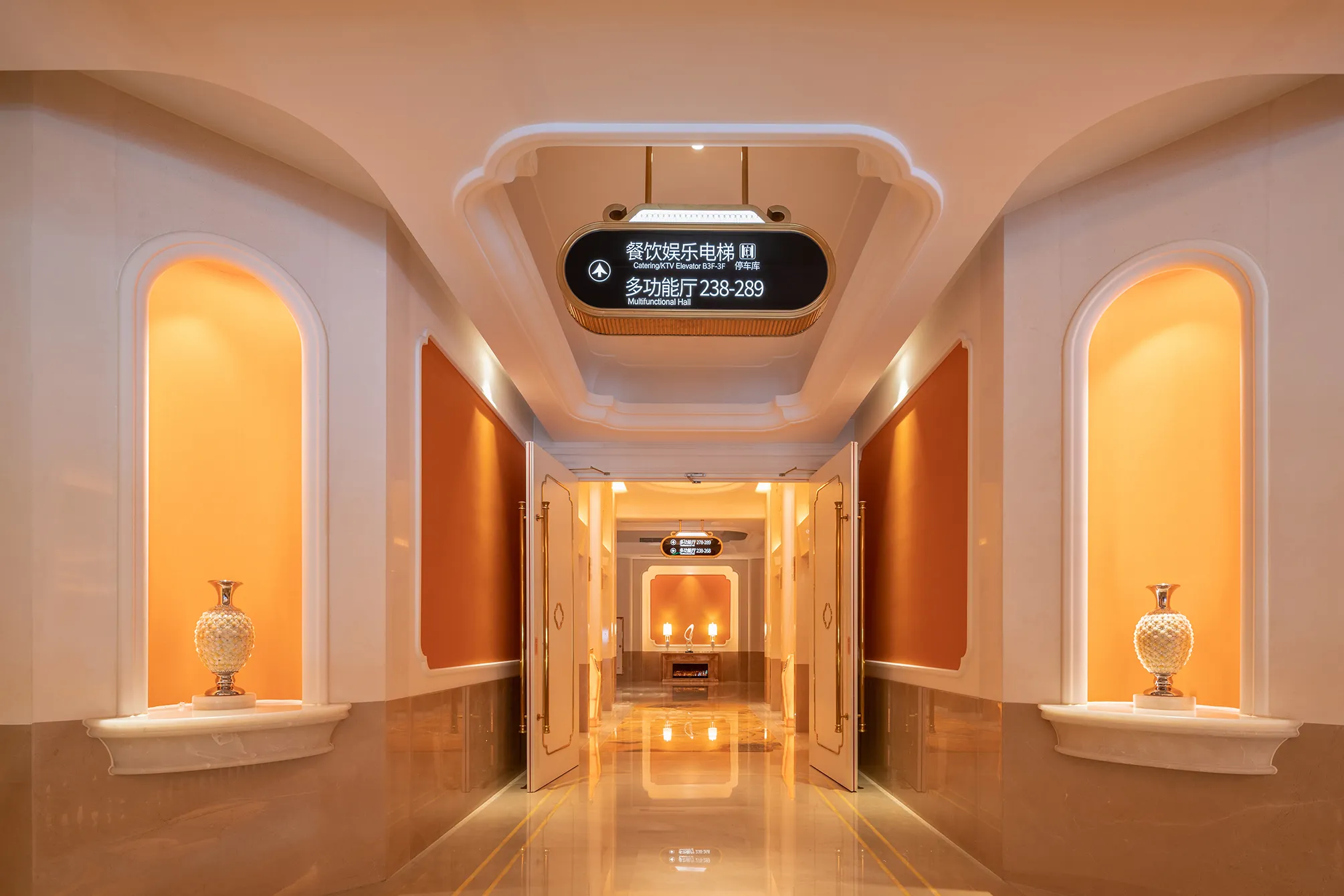 The interior space and lighting design are characterized by distinctive features: the extensive use of gypsum decorative materials for ceiling coves and wall decorations, the magnificent European dome, and the rich and exquisite sculptural patterns. Custom ultra-low color temperature golden light strips and lens wash lights are employed to highlight the spatial structure through indirect lighting. The upward lighting wash showcases the rhythm of the atrium to perfection, creating a luxurious atmosphere that offers warm and comfortable basic lighting while ensuring strong brand recognition.