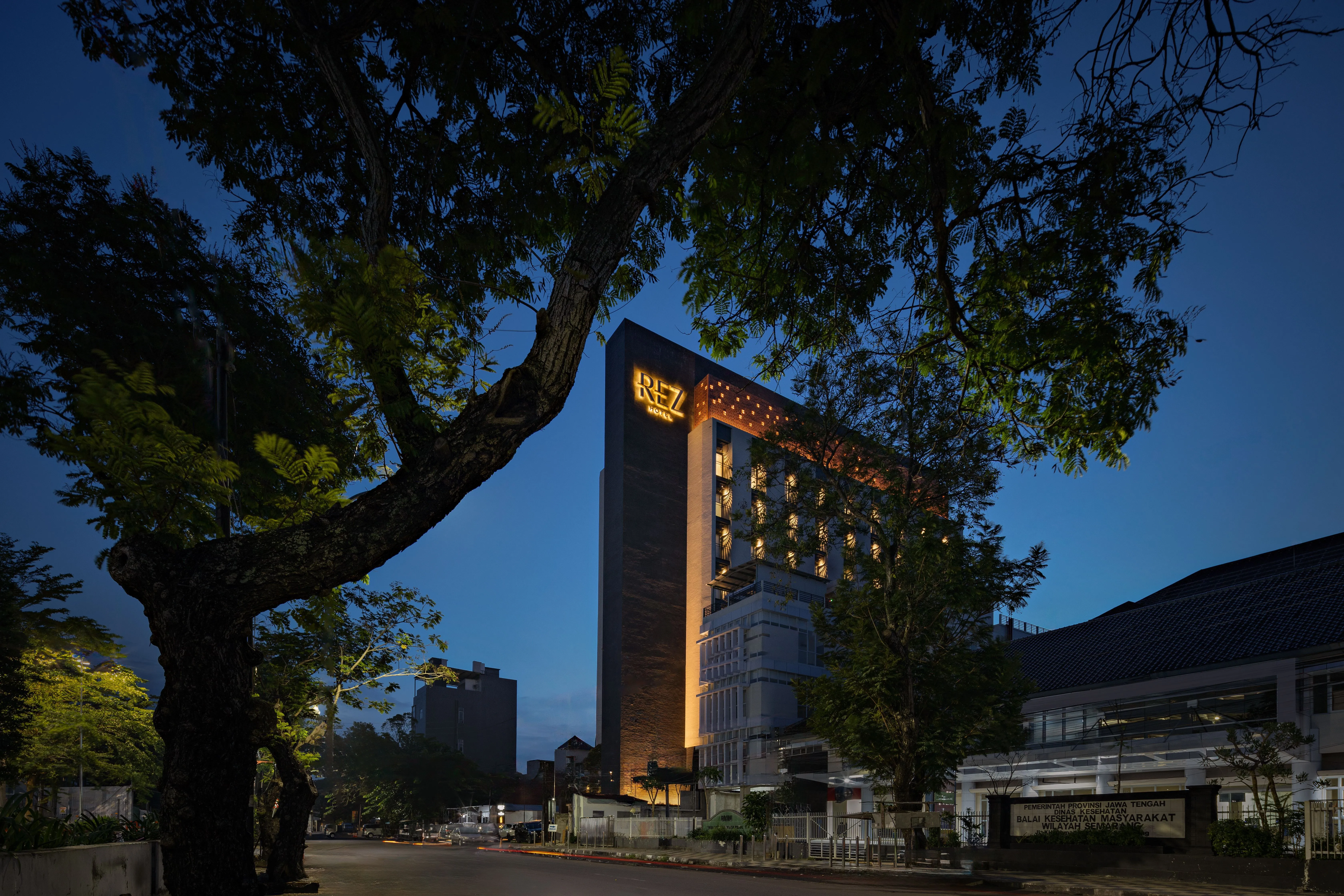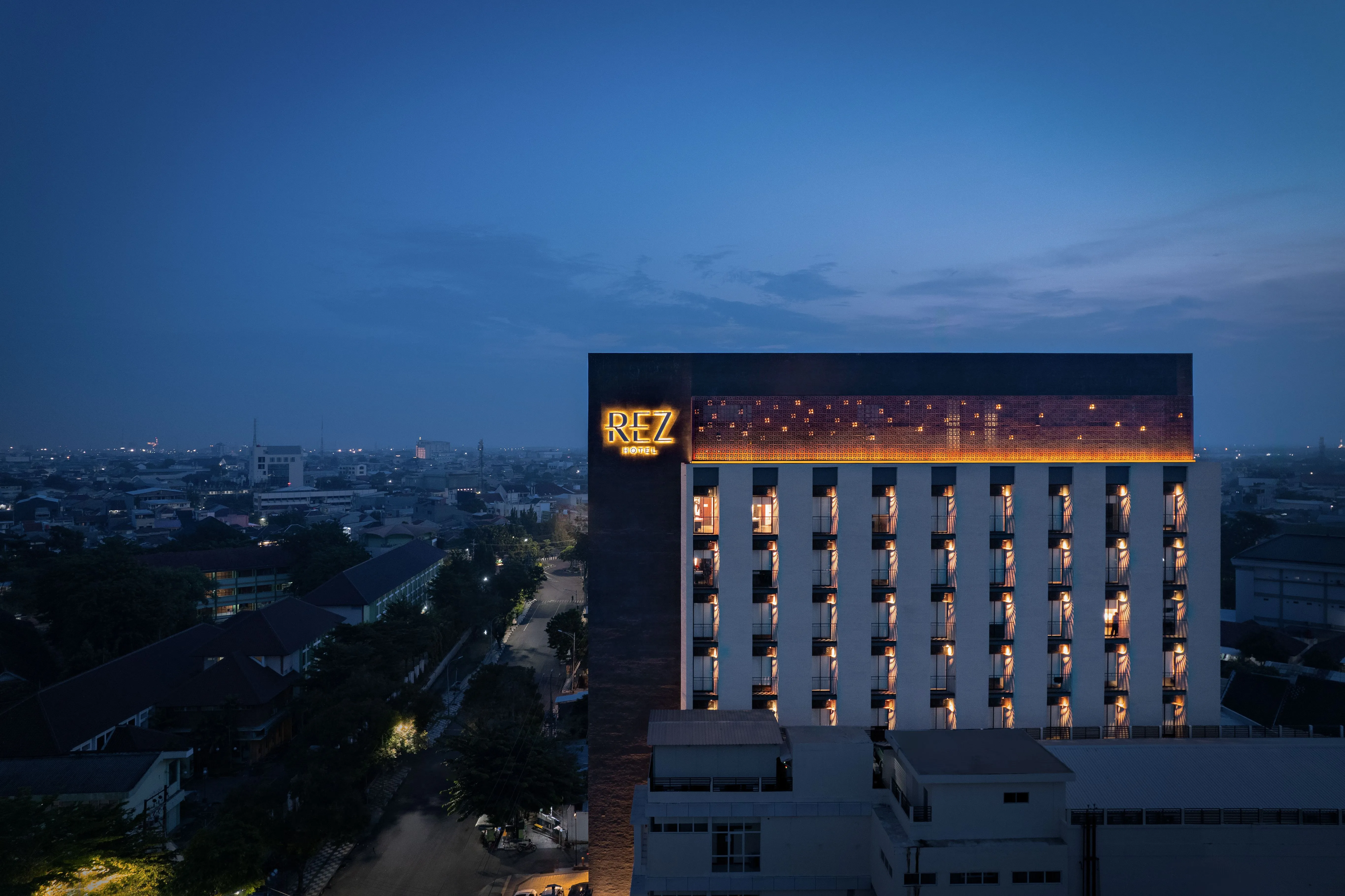 Rez is a tall, slender box with black and white that stands out in the middle of the city, generally contrasting with the buildings surrounding it.