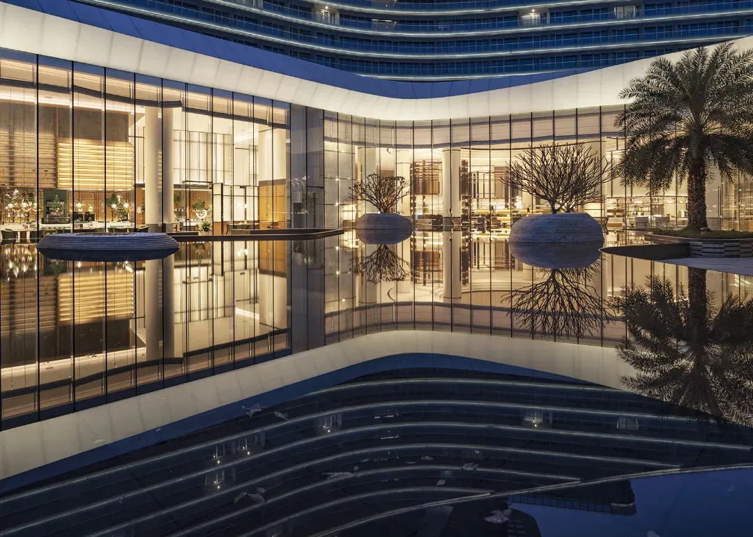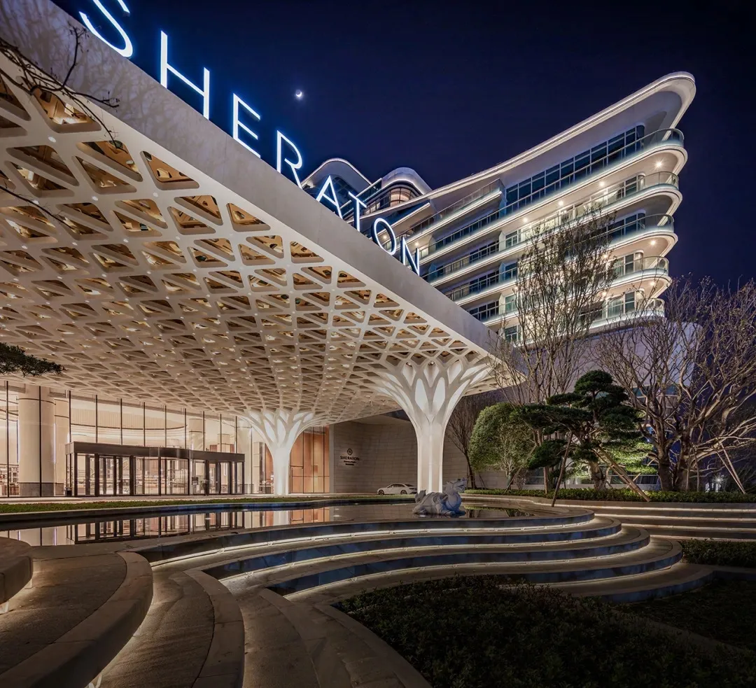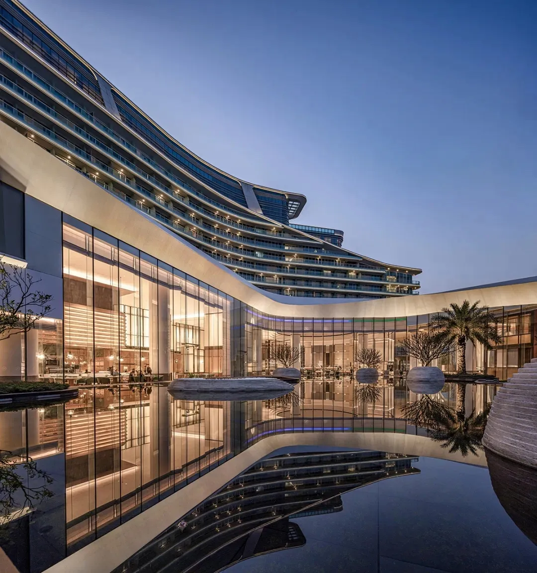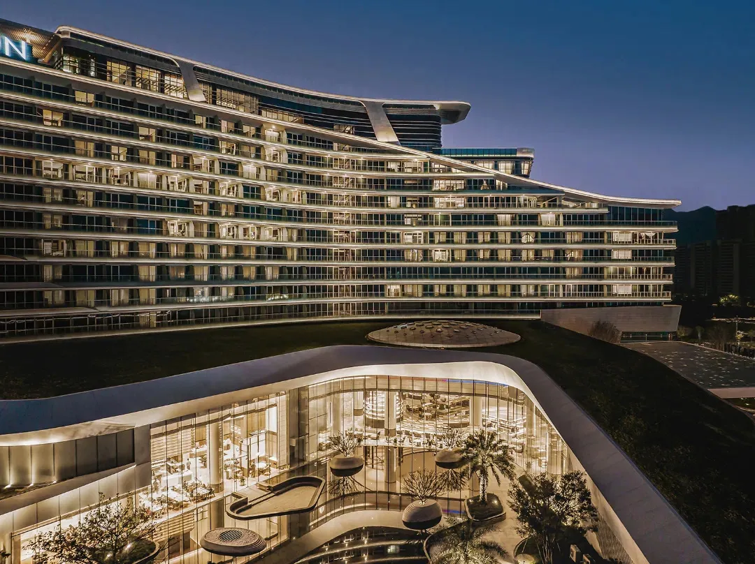 The hotel’s lighting design is inspired by the reflection of Xinghu Lake. As night falls and the lights come on, the illumination highlights the architectural features, allowing the building to blend harmoniously with the surrounding mountains and waters, creating a delightful accent to urban mountain and forest living.
