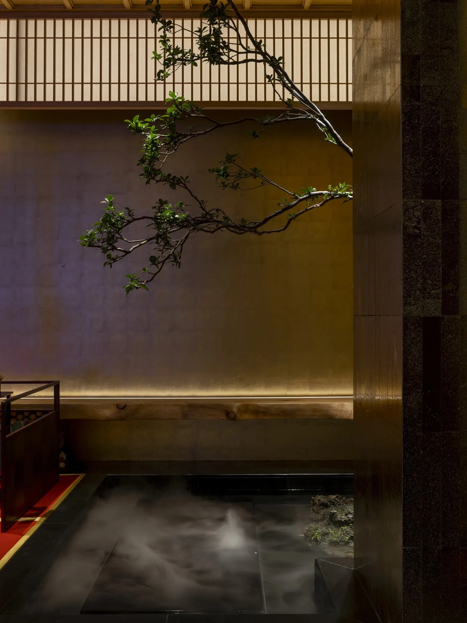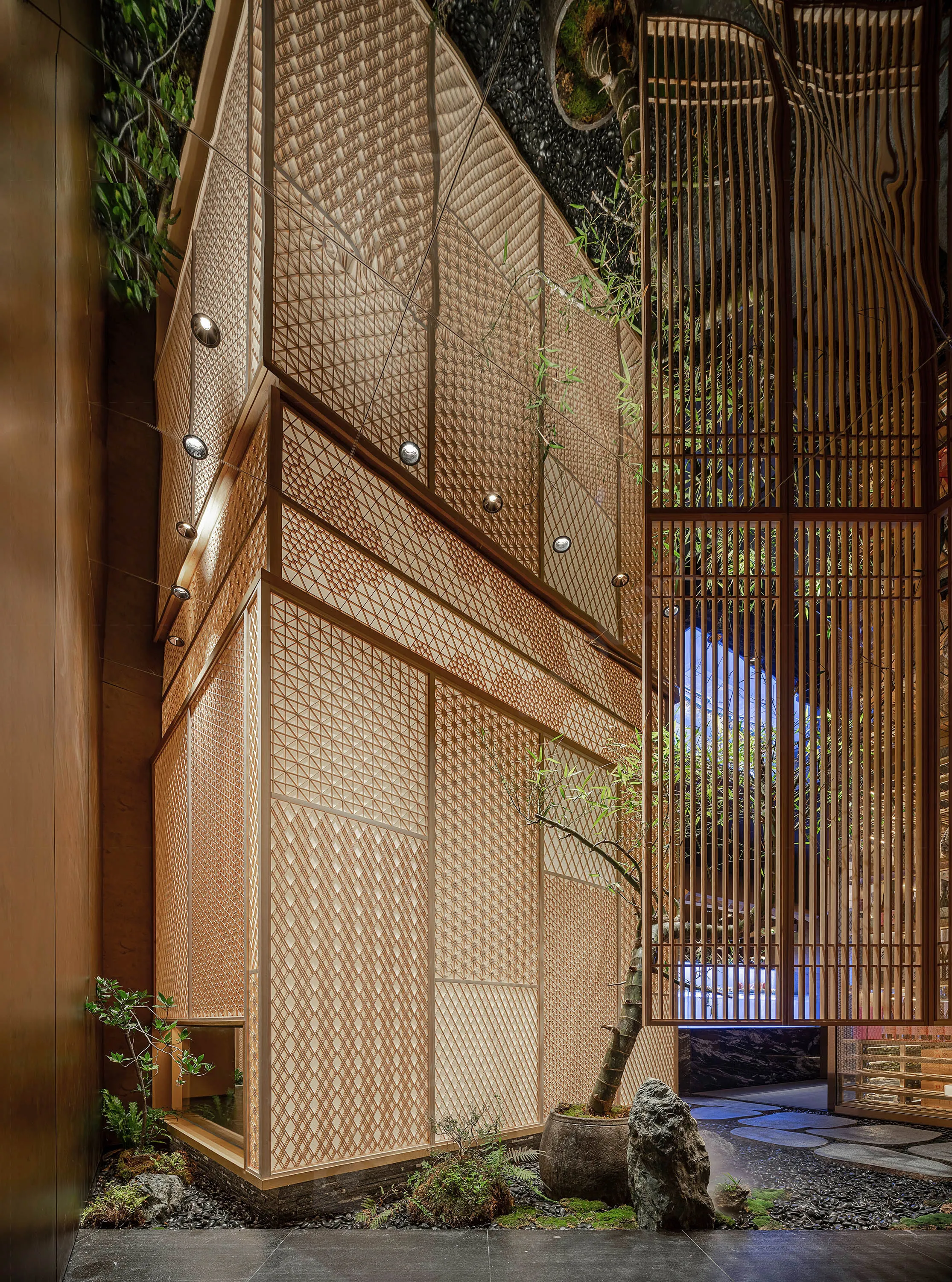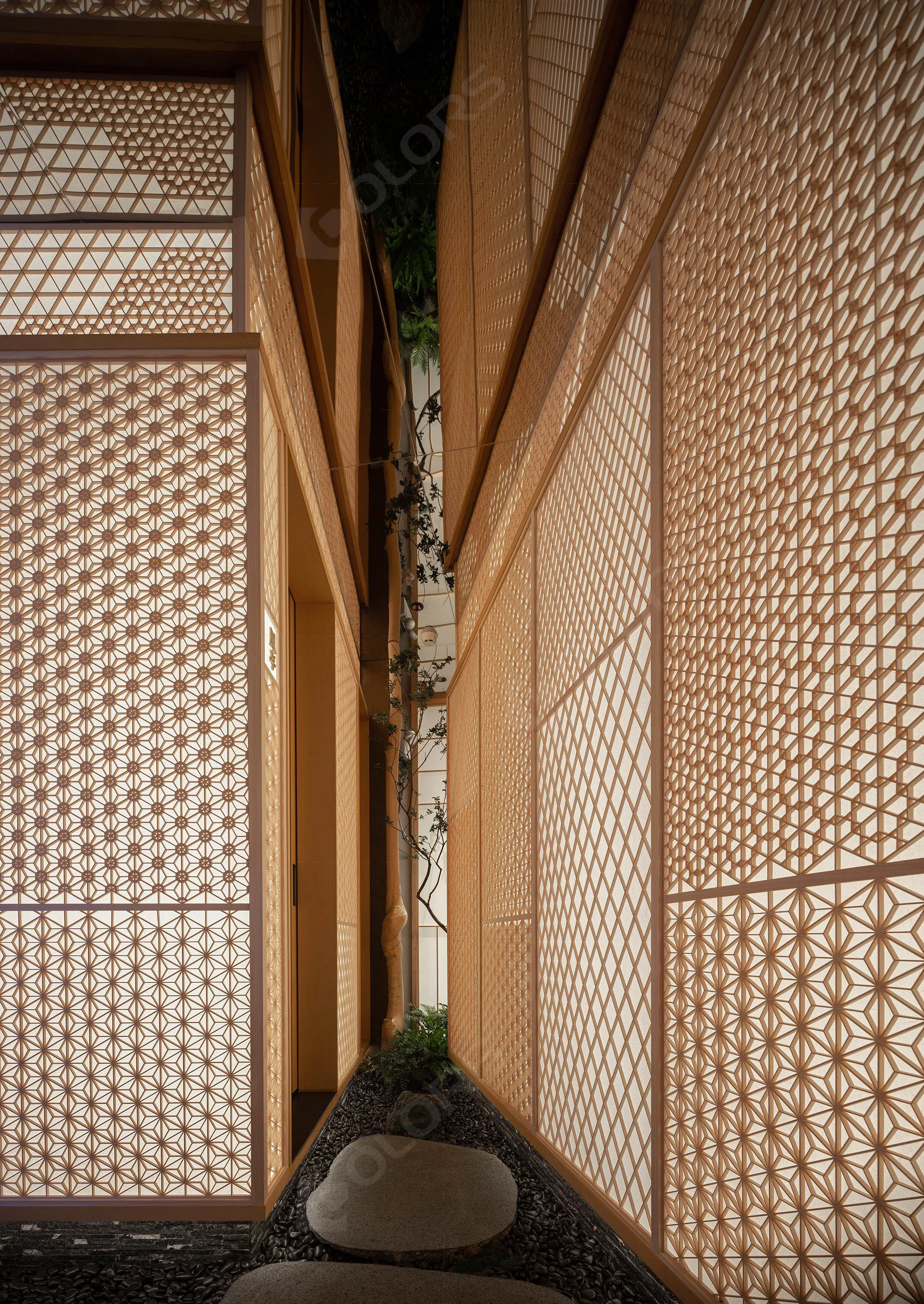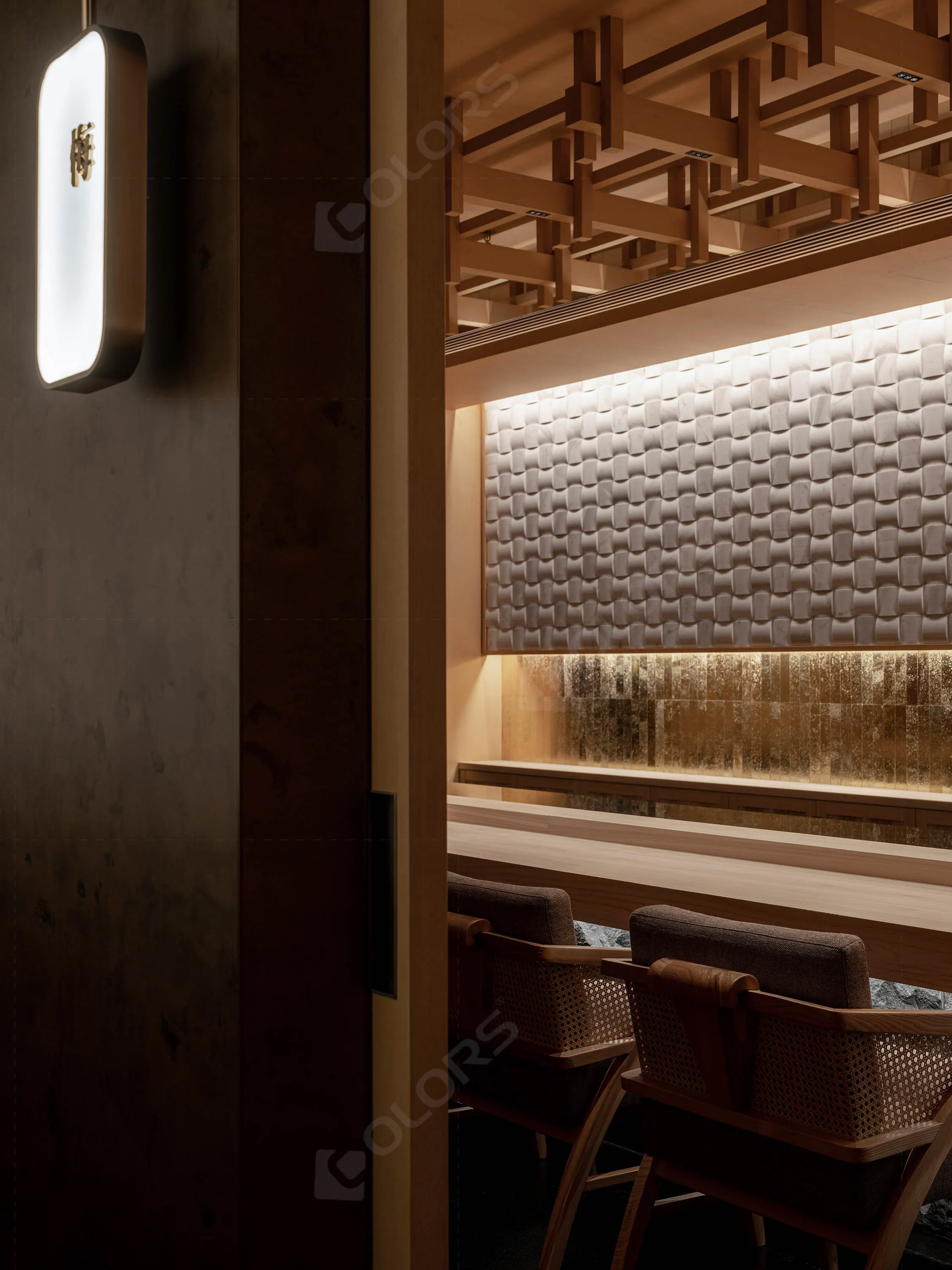 The space features a significant use of cypress wood for the intricate fixtures, with various forms of these fixtures that constantly change in expression. The back of the fixtures showcases Japanese cloud and dragon patterns, along with paper elements. Light guide panels and LED strip D8168 are used for the backing, creating a beautifully soft illumination that permeates the facades.