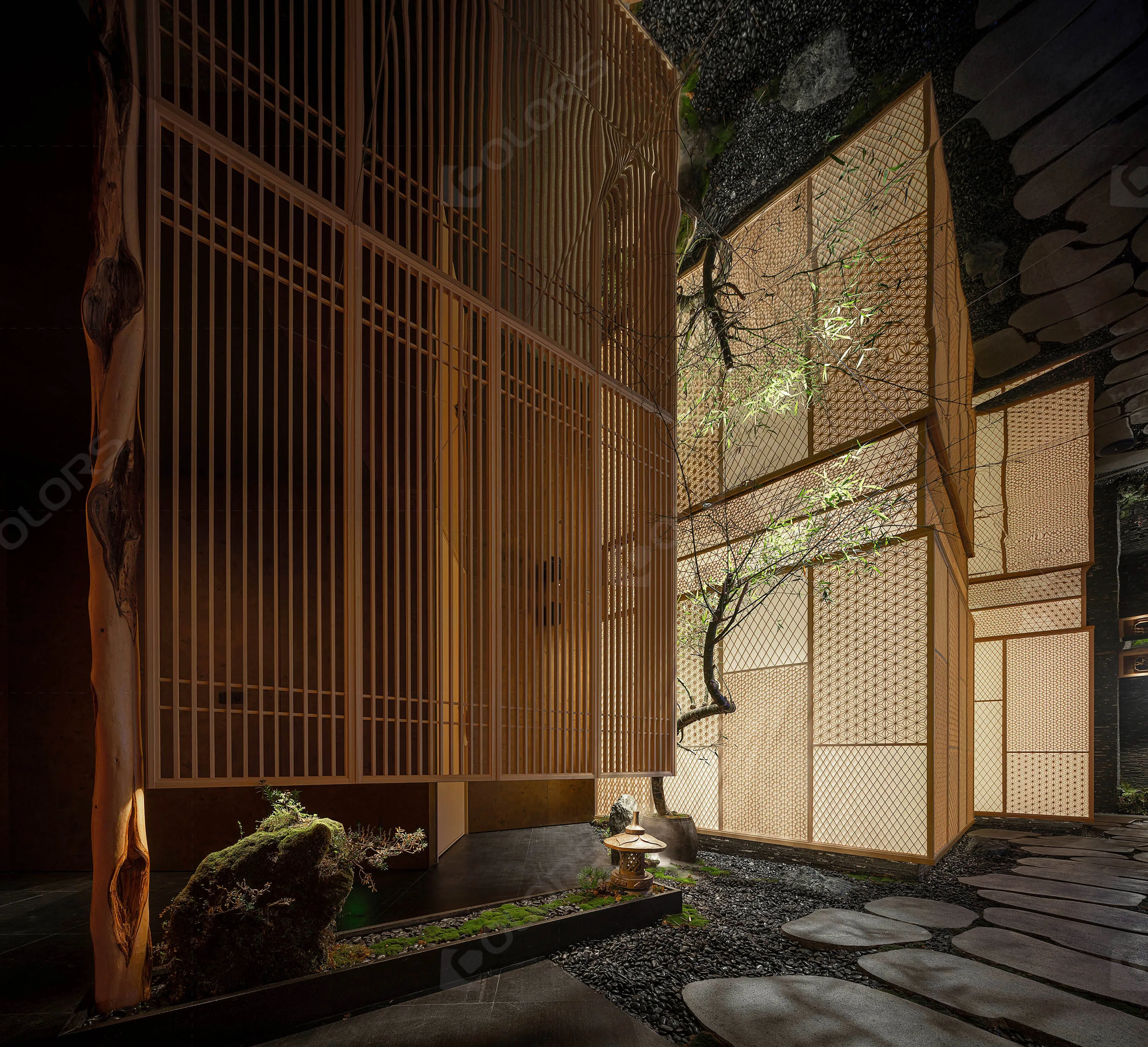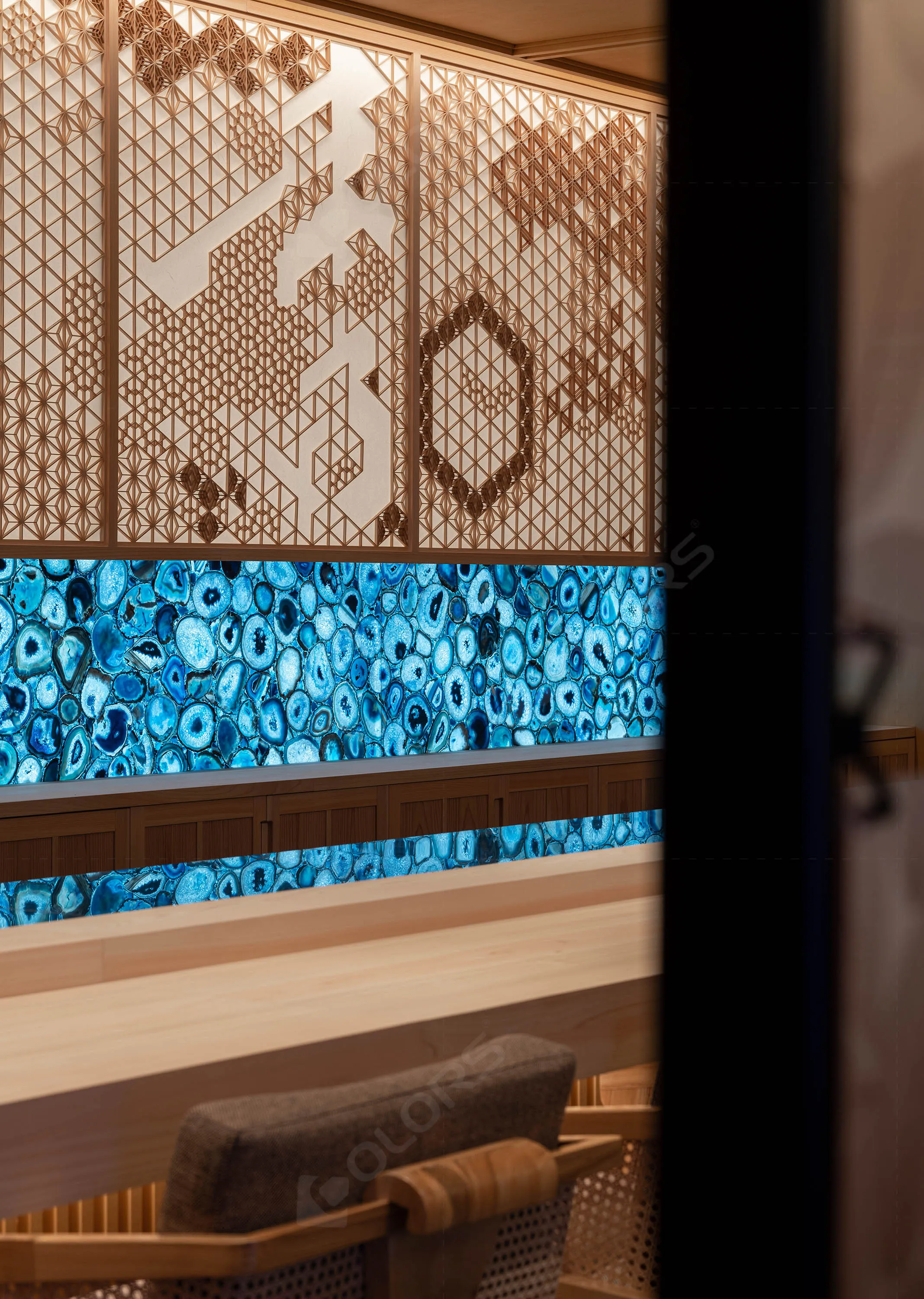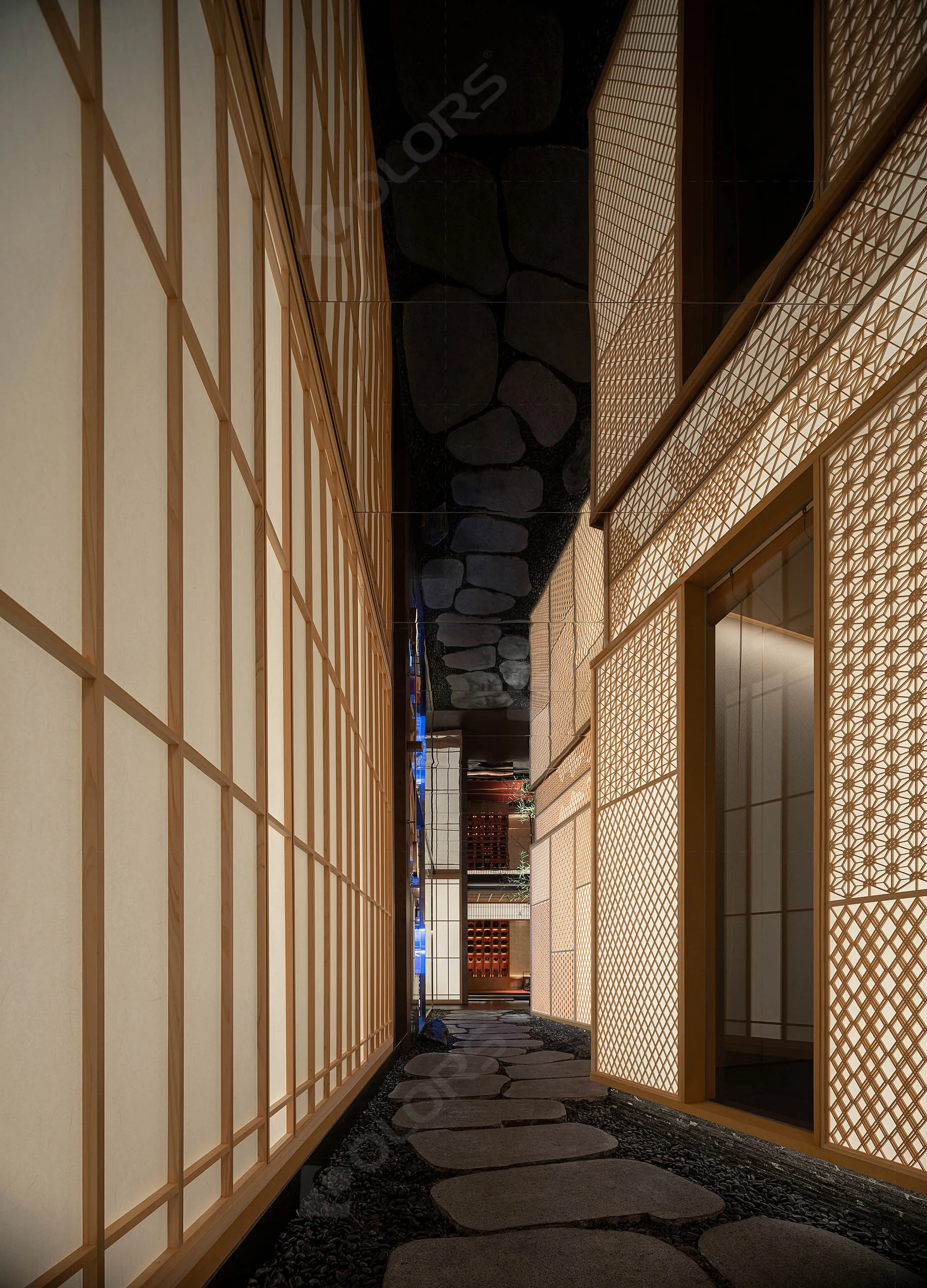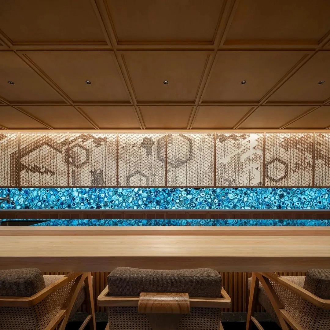The space features a significant use of cypress wood for the intricate fixtures, with various forms of these fixtures that constantly change in expression. The back of the fixtures showcases Japanese cloud and dragon patterns, along with paper elements. Light guide panels and LED strip D8168 are used for the backing, creating a beautifully soft illumination that permeates the facades.