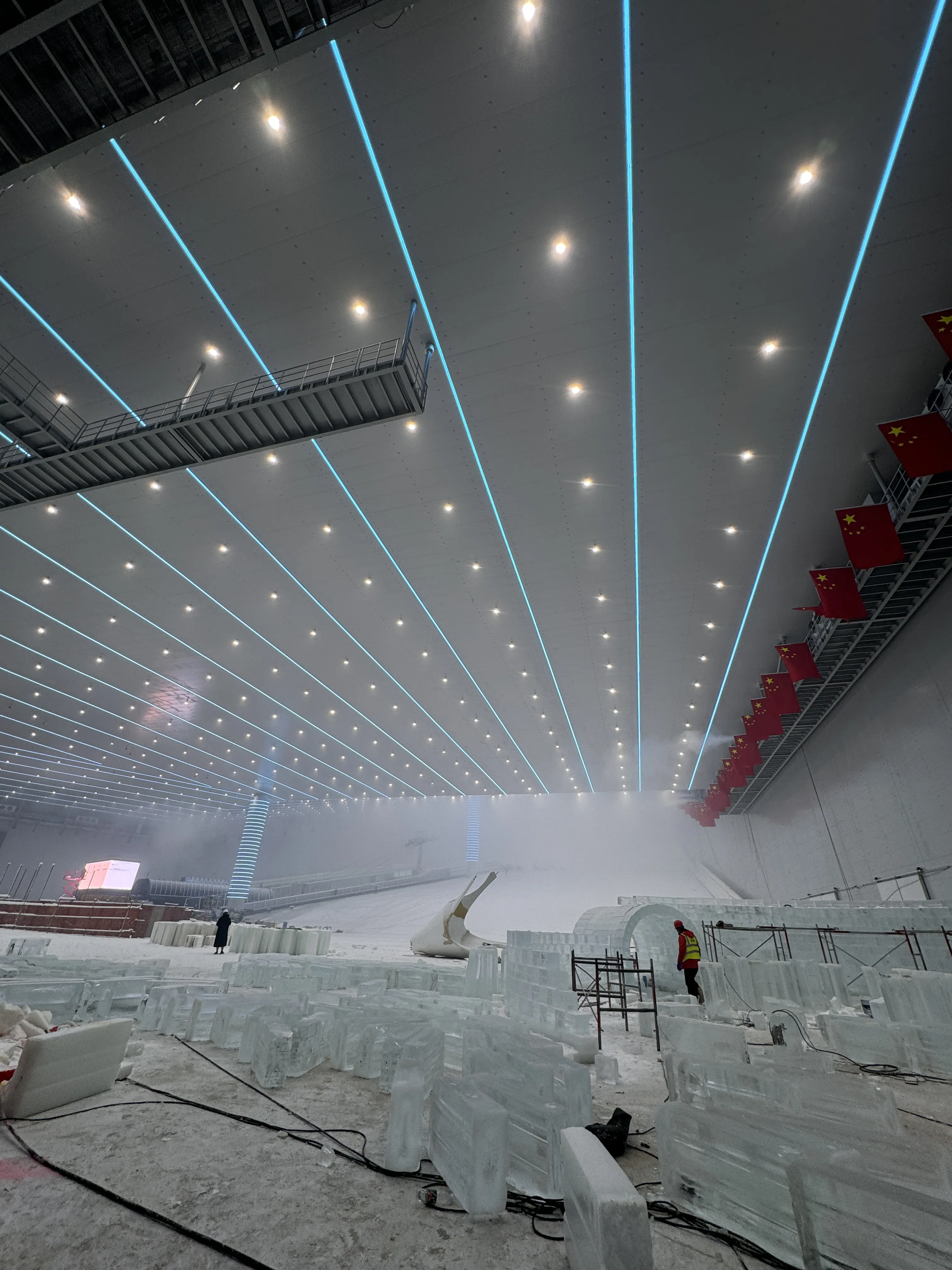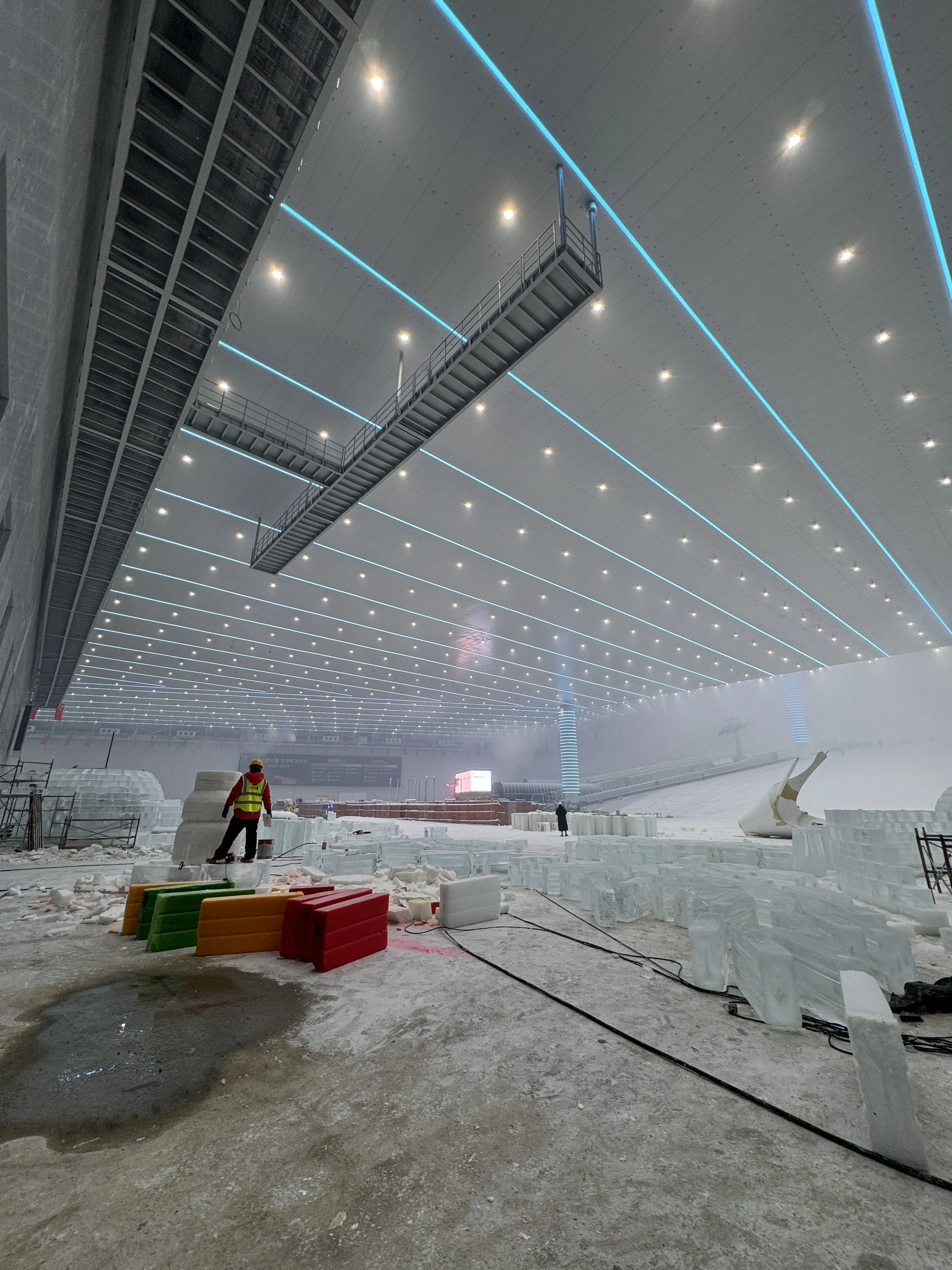 The indoor lighting design is minimalistic and pure, providing functional main lighting through the arrangement of high-power ceiling spotlights. An array of ice-blue linear lights creates a dynamic atmosphere of the snowy world, delivering an exhilarating and spectacular experience.